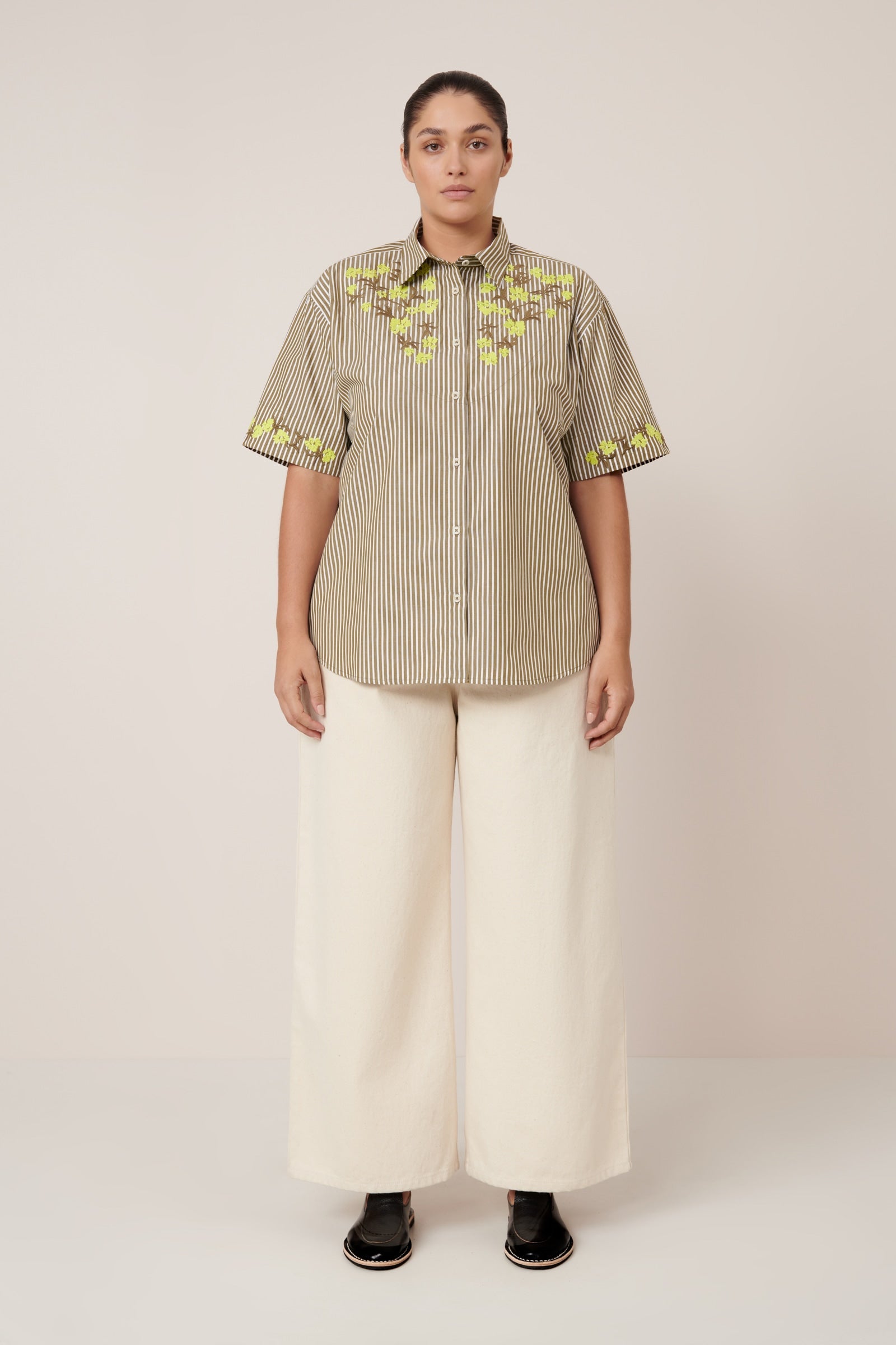 Delicately embroidered with cotton thread, the Wildflower Shirt showcases intricate floral motifs that soften its menswear-inspired silhouette. Crafted from crisp organic cotton poplin, it features a western-style yoke at the front and angled stripe detailing on the back yoke. Designed for a relaxed fit, the shirt fastens with nut buttons and pairs perfectly with the Wildflower Shorts.