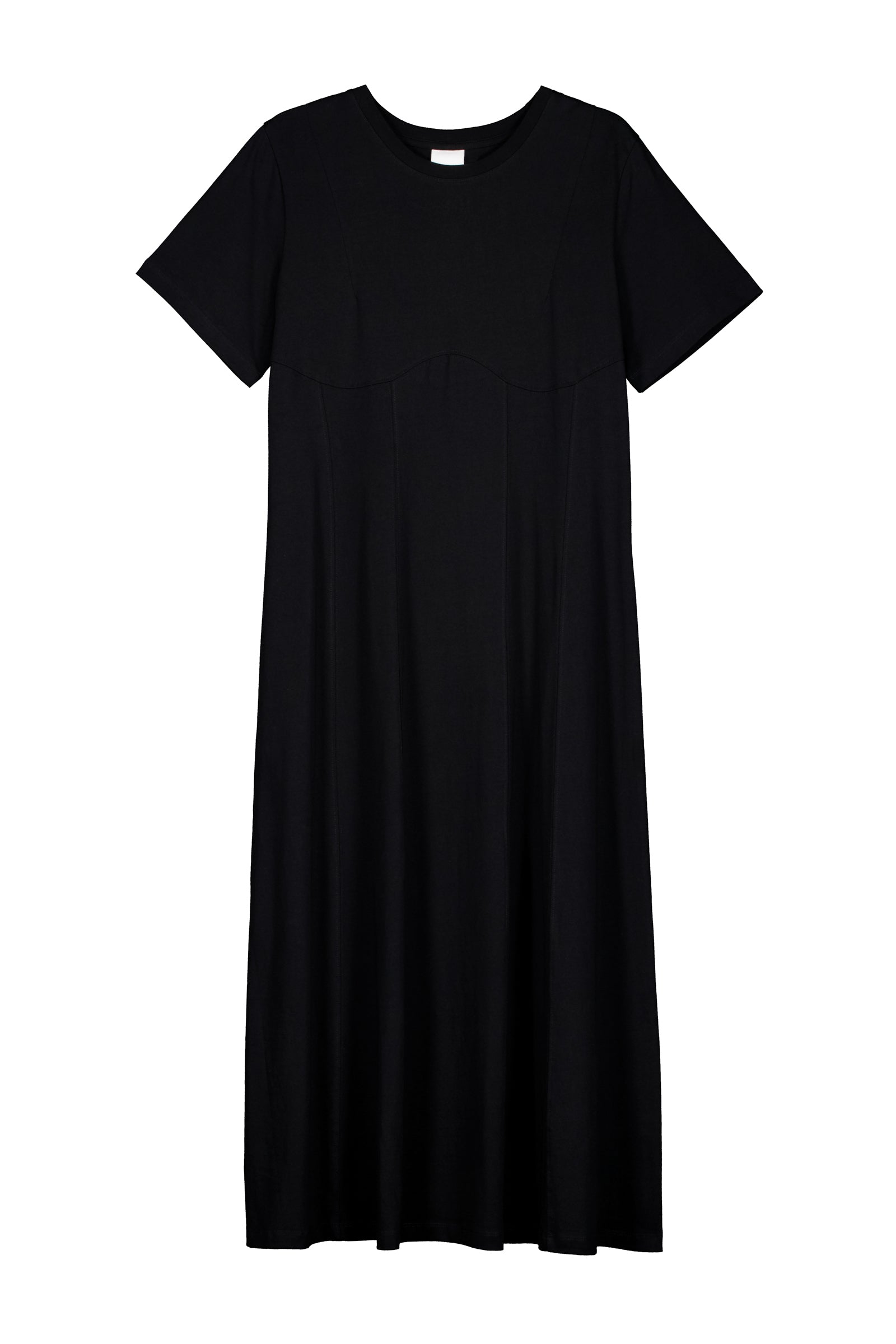 A simple tee dress with topstitched panel lines inspired by traditional corsetry. The Contour Dress features shoulder darts for subtle shaping and is made in a soft mid-weight organic cotton jersey. The dress has a standard fit and falls to midi length.