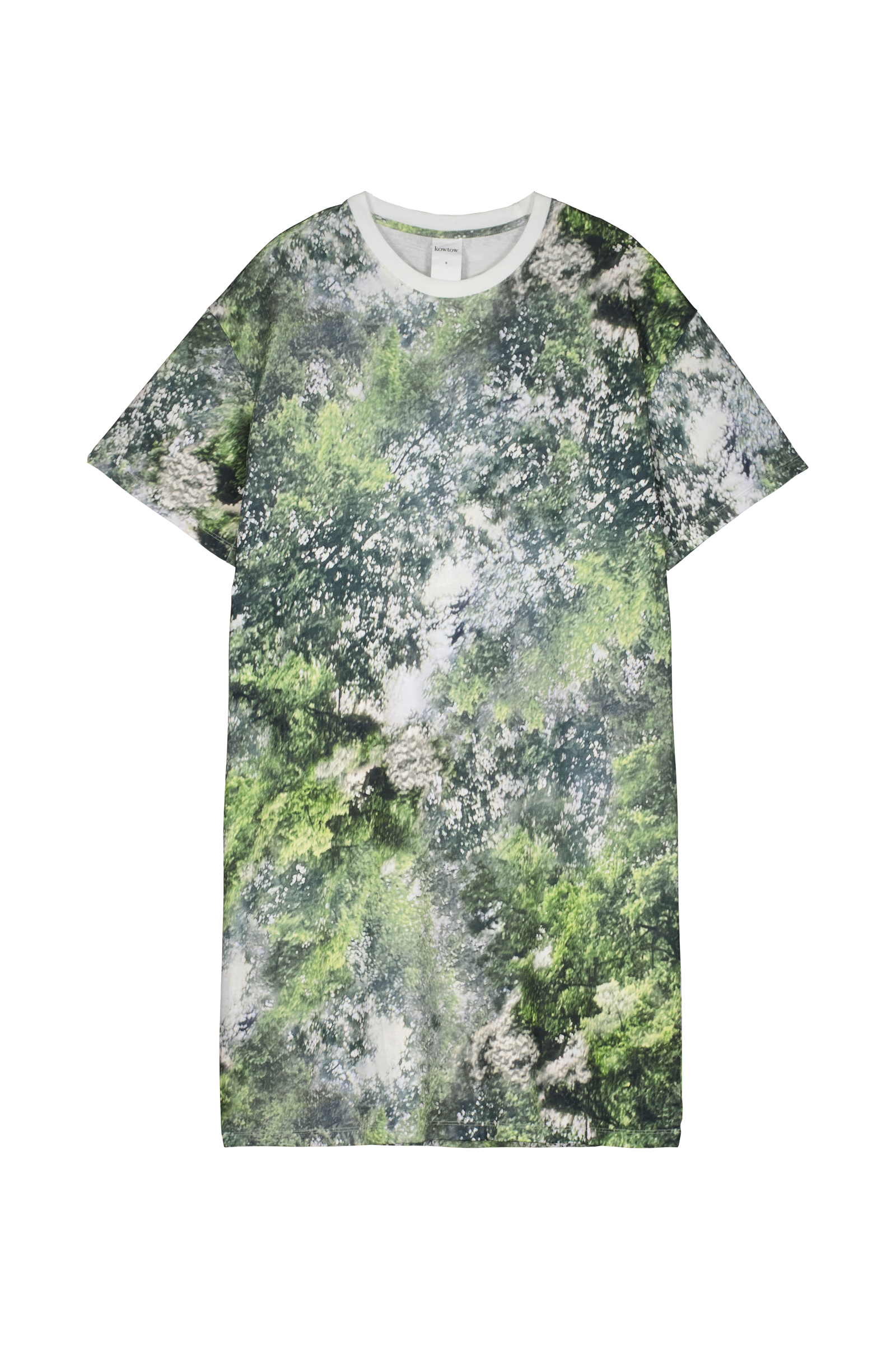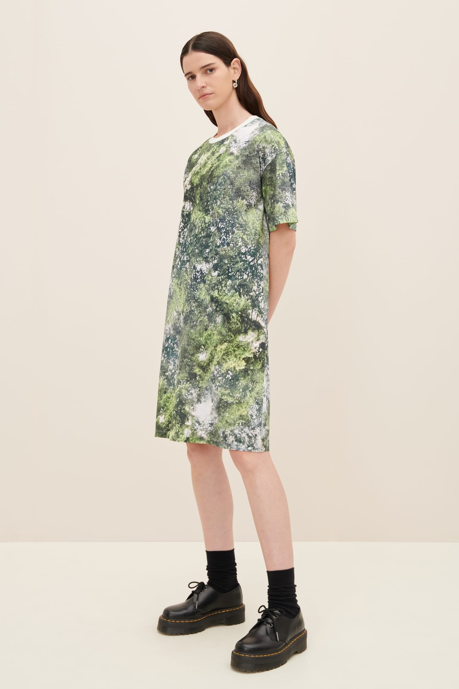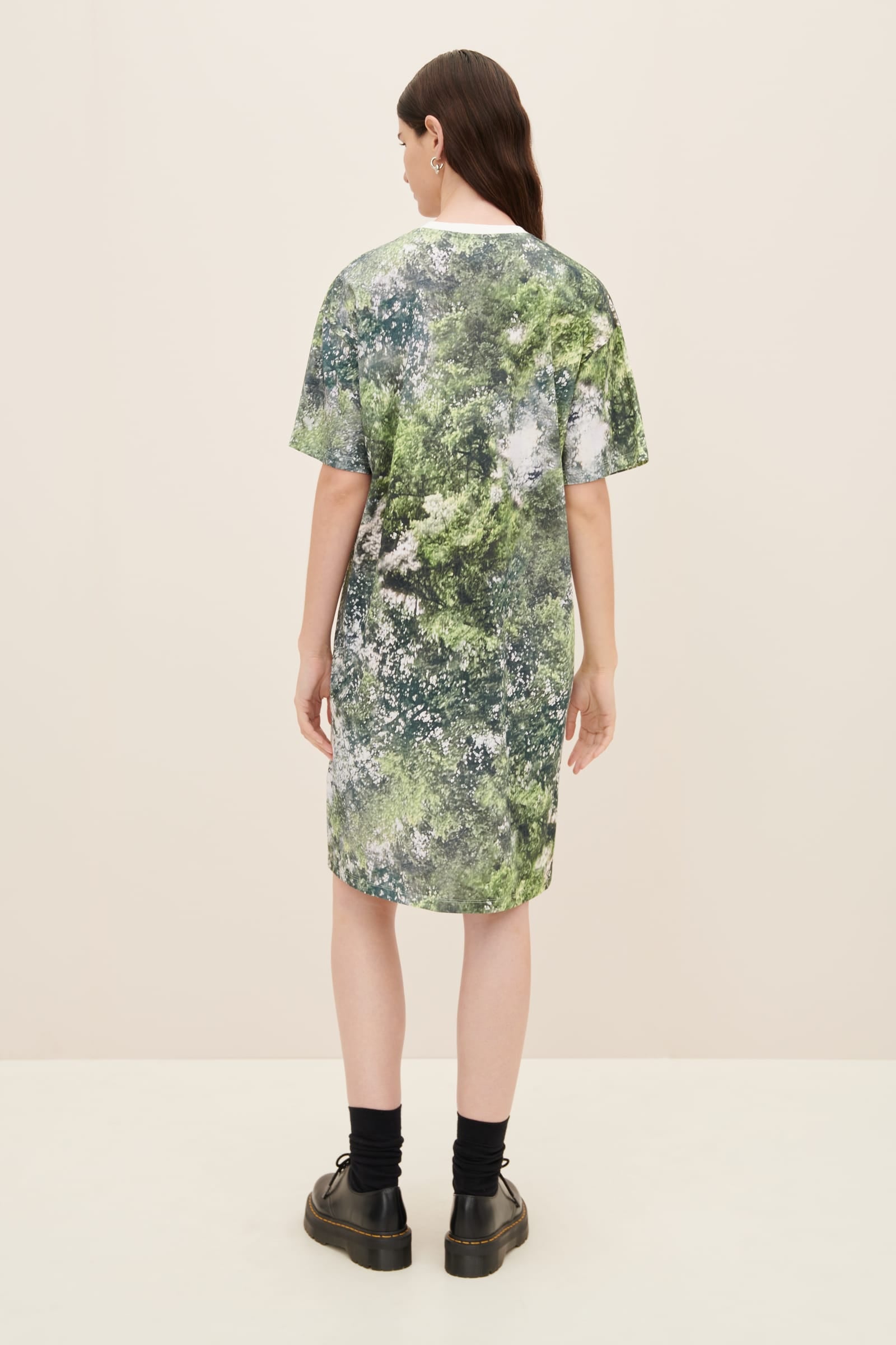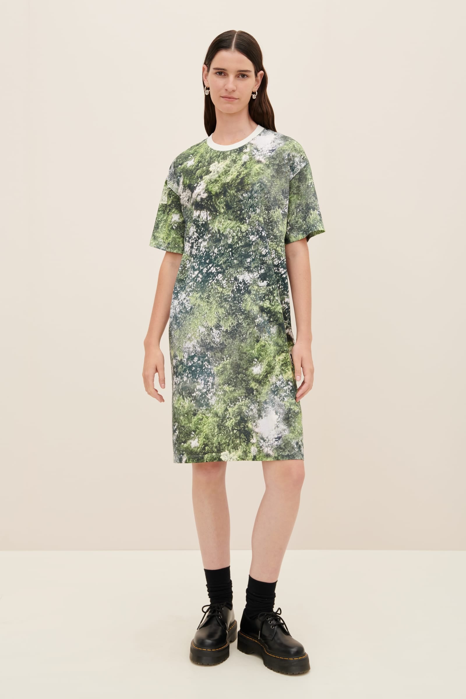 The Foliage Dress is a relaxed fit boxy tee dress with an easy-wear above-the-knee length. The simple silhouette acts as a canvas for the mesmerising print which evokes the feeling of looking up at a forest canopy through to the skies beyond. It is finished with a contrast white neckline. Made from midweight organic cotton jersey.
