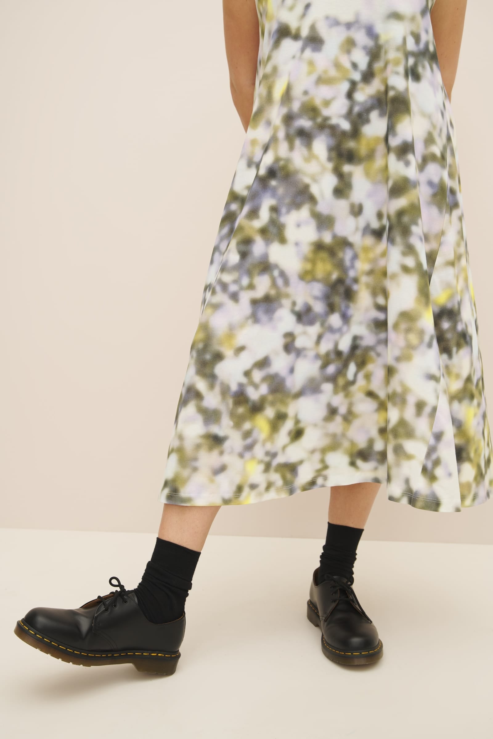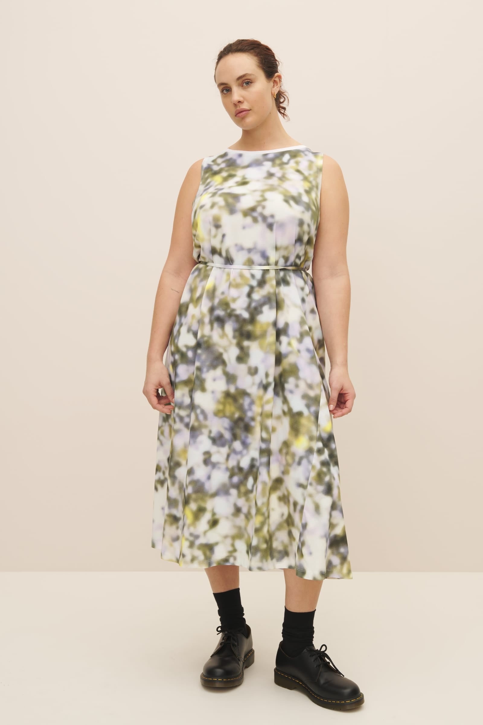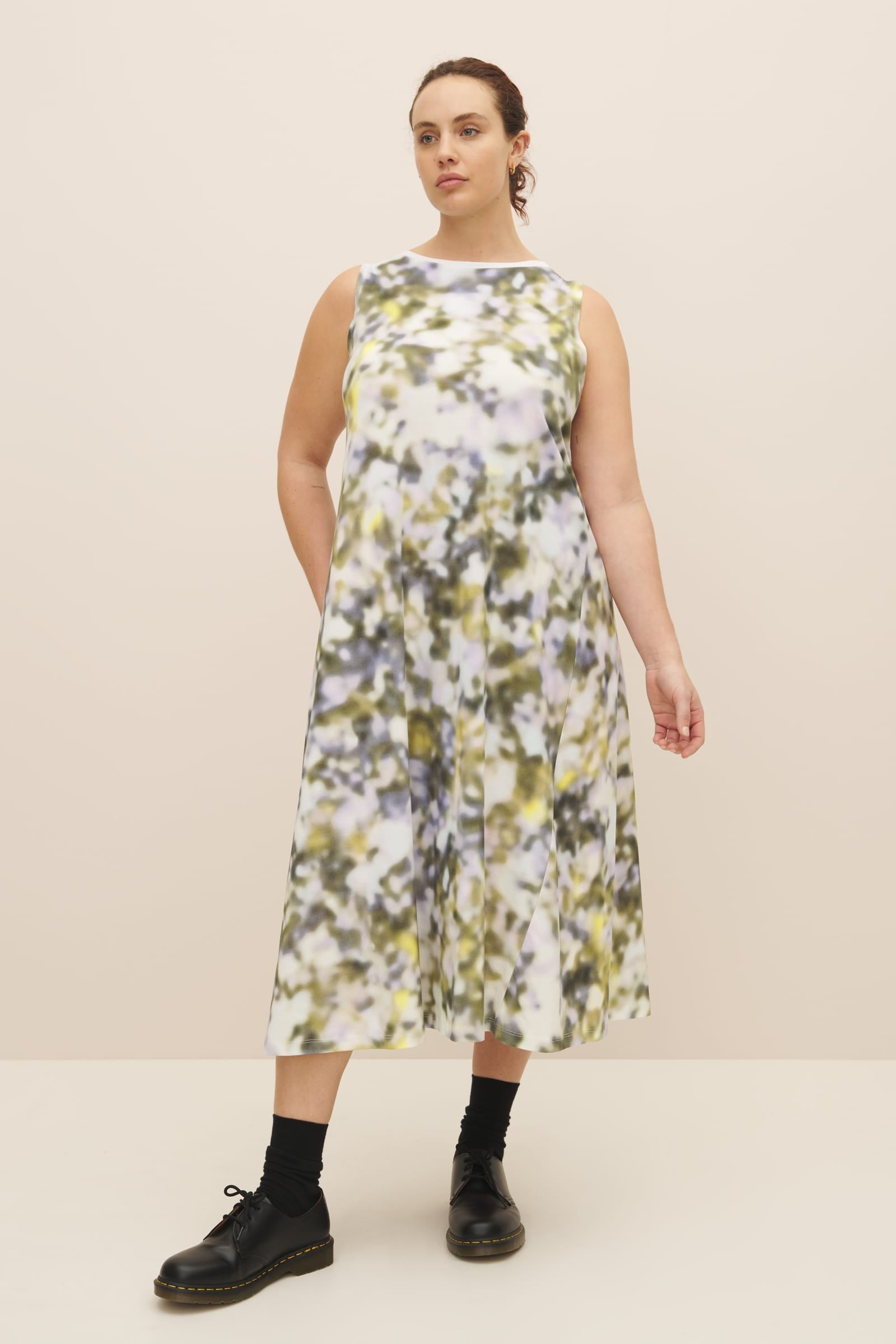 Made from 100% certified Fairtrade midweight organic cotton jersey, the Komorebi Dress is a slip-on style with a simple A-line silhouette and is a printed version of our Tank Swing Dress. It features our Komorebi print which is inspired by dappled light filtered through a forest canopy. The dress can be worn loose or cinched at the waist with the self-fabric tie.
