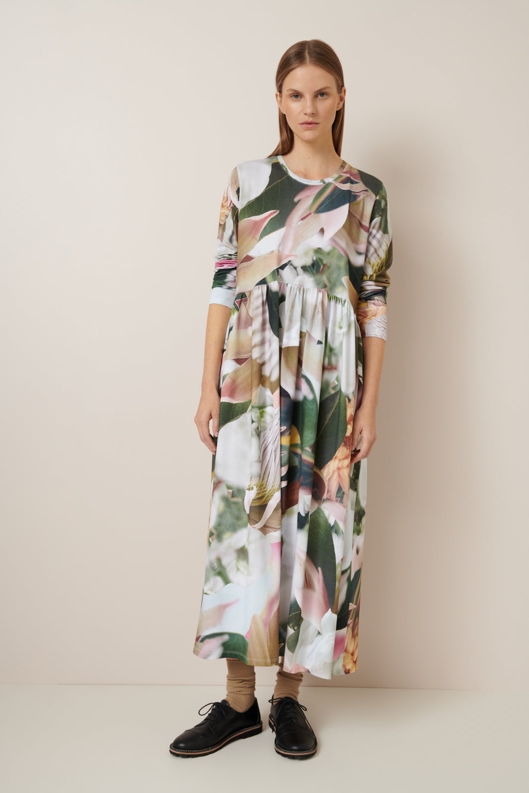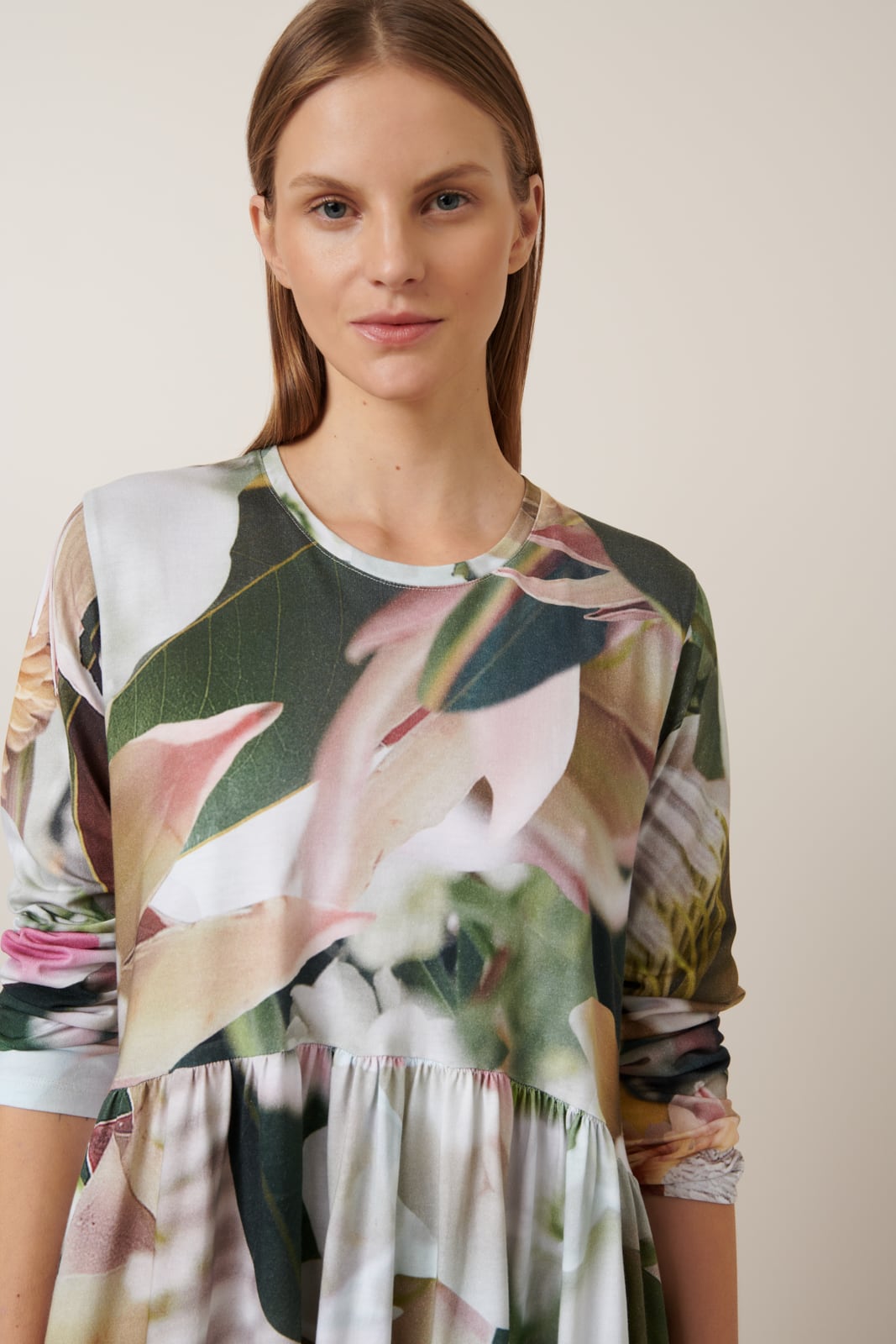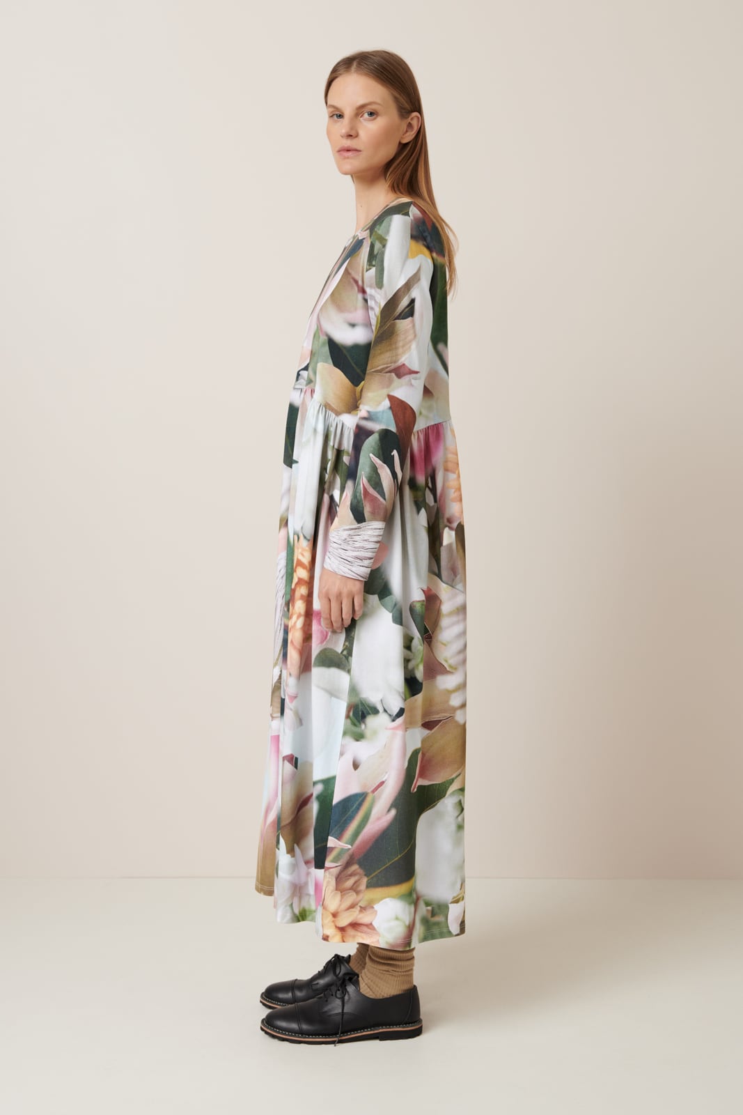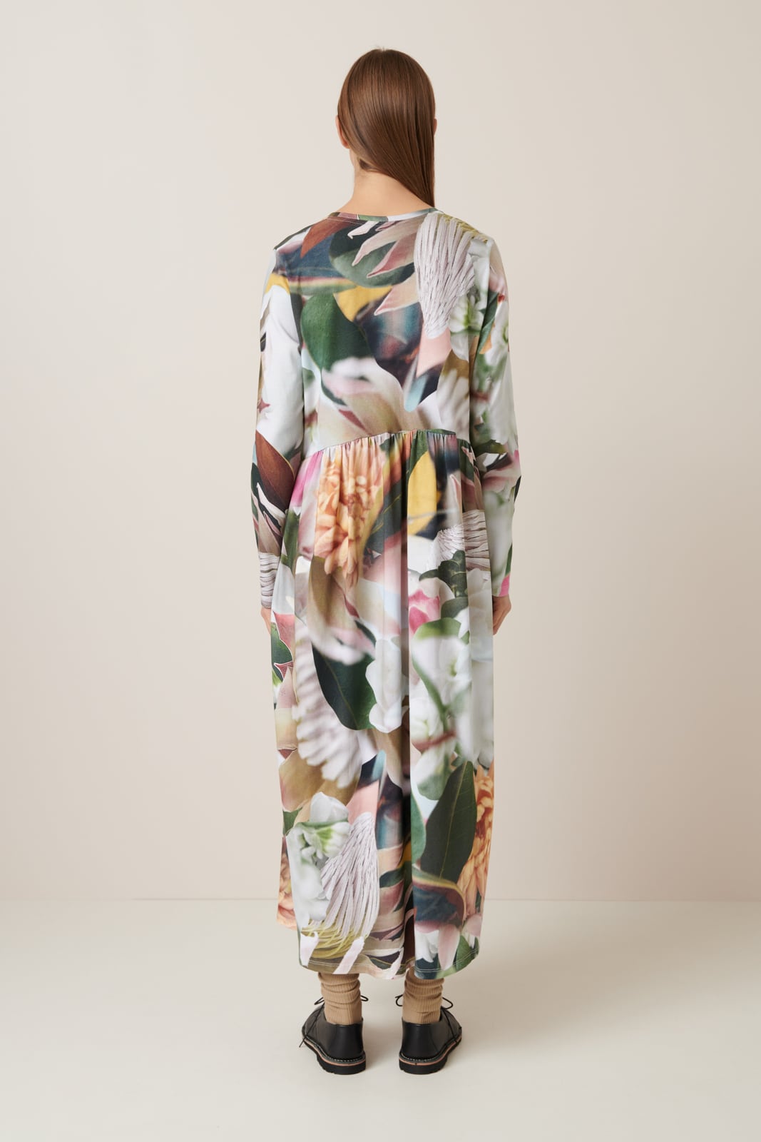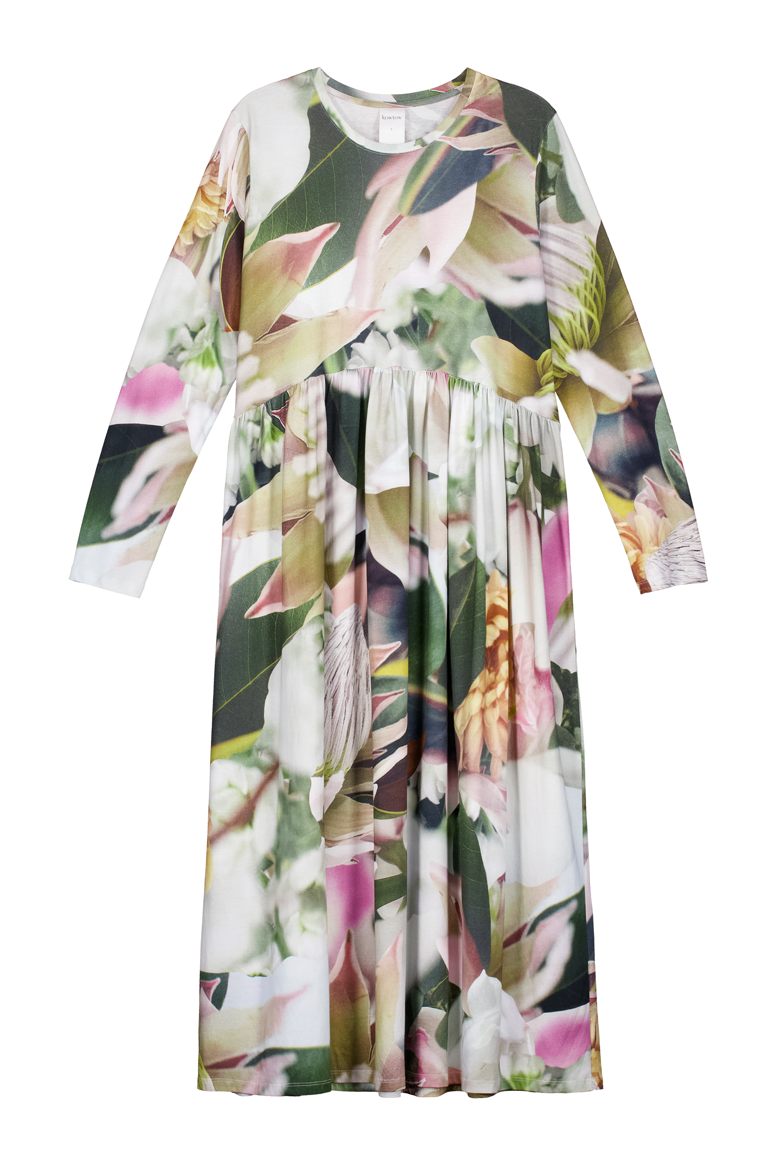 An easy, yet elegant style that is relaxed through the body with close fitting long sleeves. It features a curved, gathered waist that adds fullness. A digitally printed version of our Long Sleeve Gather Dress in our signature Protea print made from midweight organic cotton jersey.