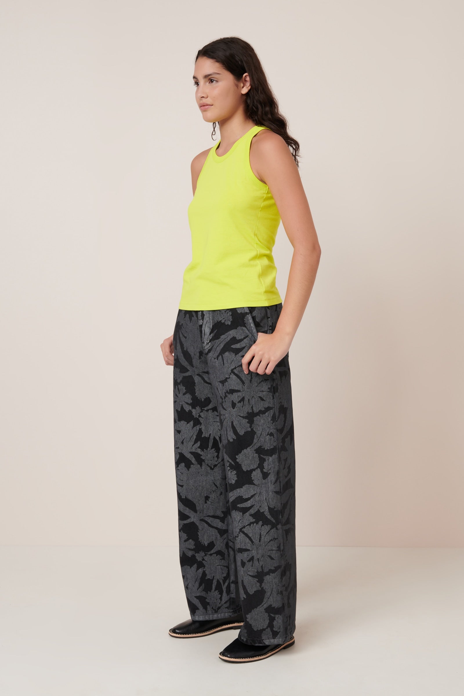 A fitted singlet with a racer back design, featuring ribbed detailing around neckline and armholes. Made from mid-weight organic cotton jersey in a bold Fluro Yellow.