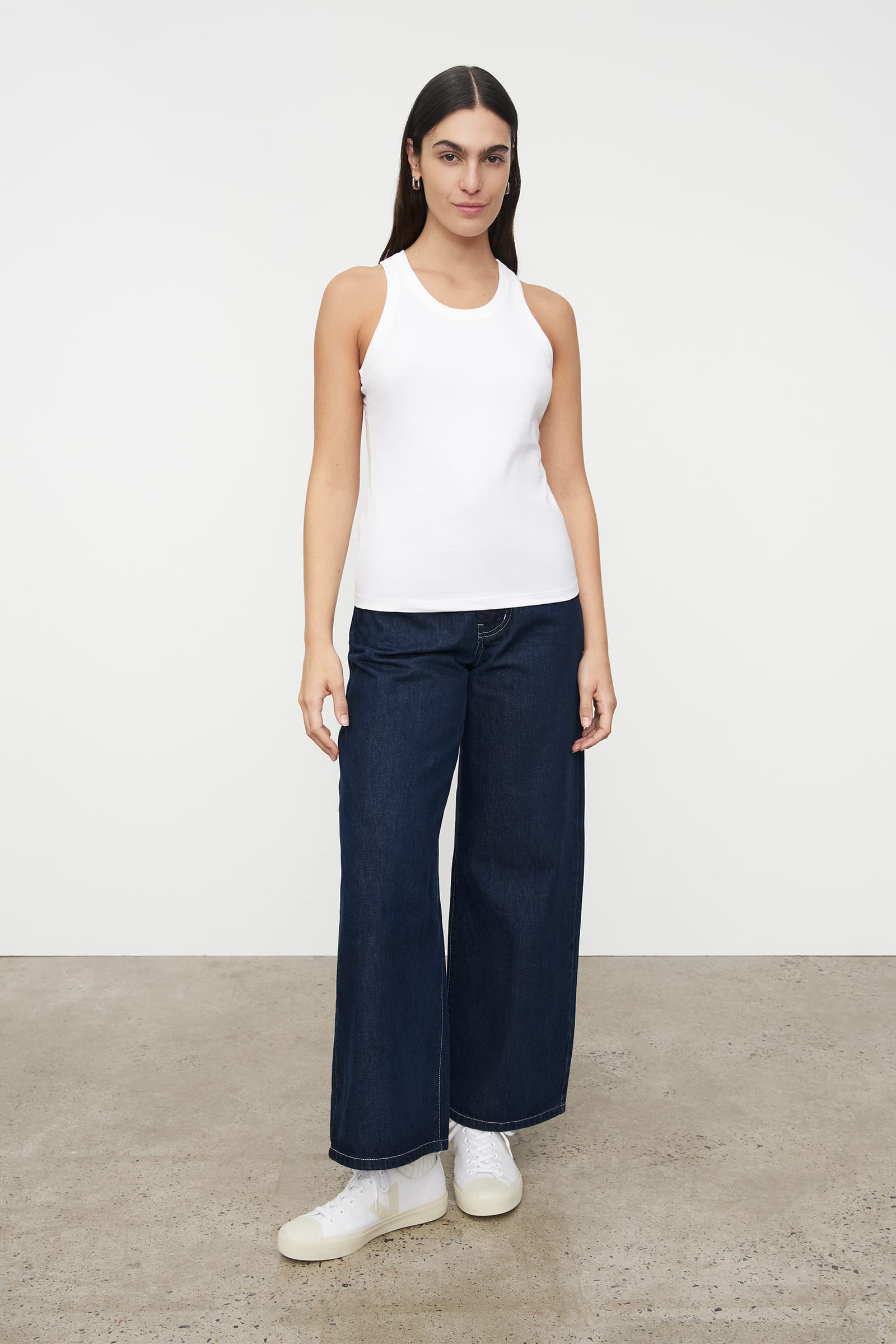 A fitted singlet with a racer back and ribbed binding around neck and armholes, made from mid-weight organic cotton jersey.