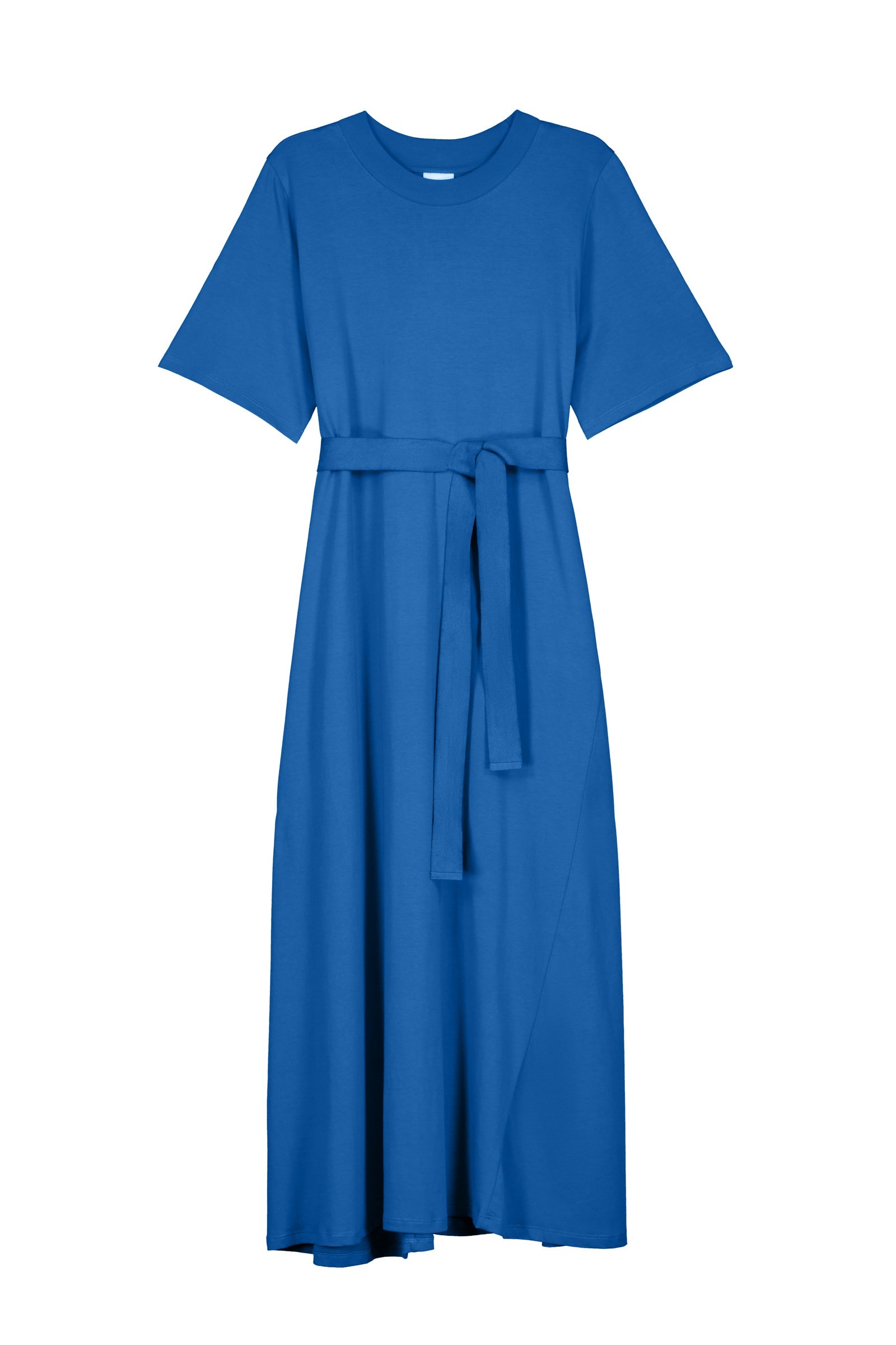 A perfect everyday staple, the T-Shirt Swing Dress is a full length, a-line dress with a wide ribbed neck. It features our signature twisted side seams and a removable, woven belt for added versatility. Crafted from midweight organic cotton jersey in a vivid Azure.