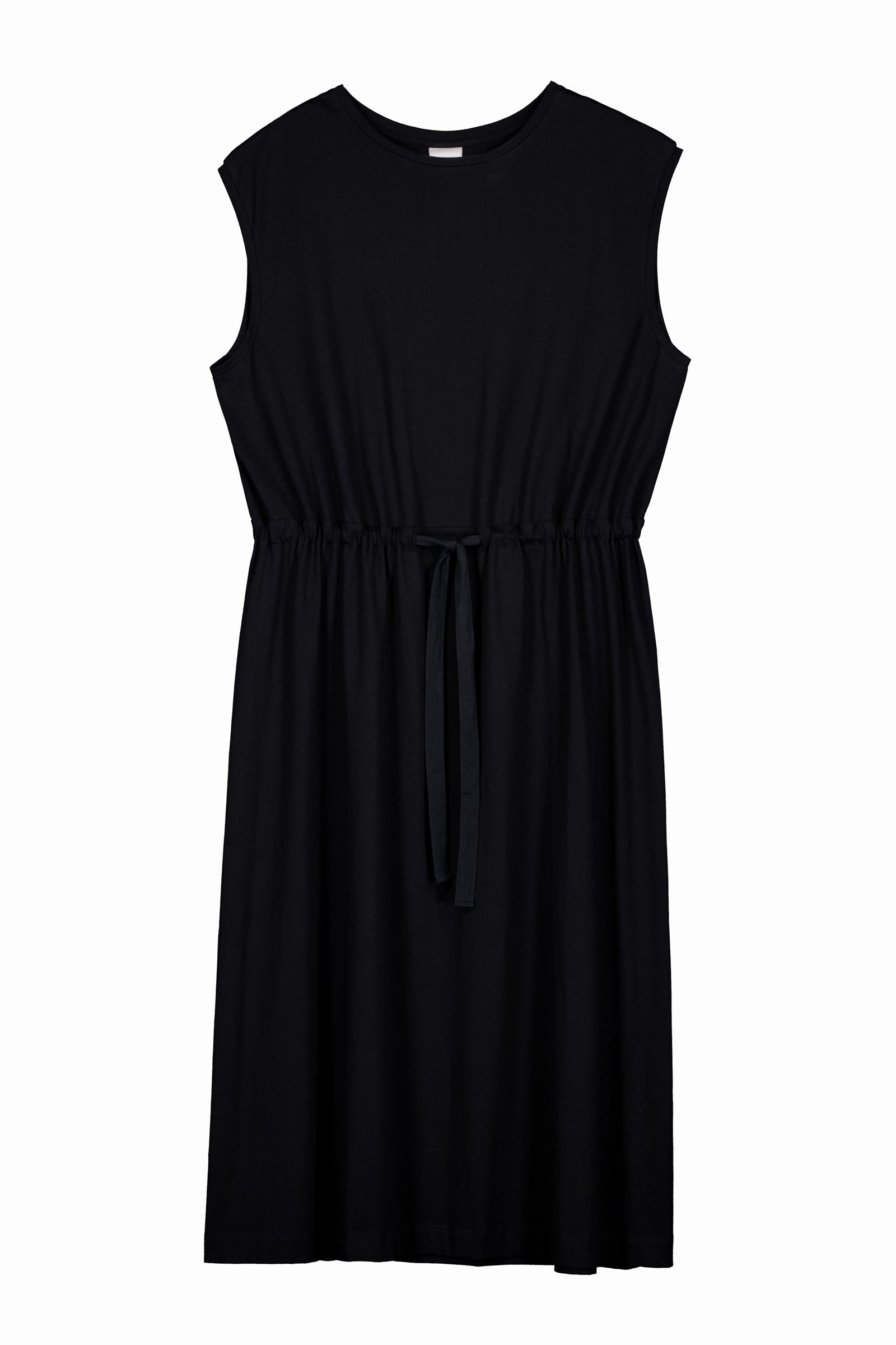 The Wave Dress draws inspiration from utilitarian design with a functional drawcord and a pleat at the back. It is midi-length, with an oversized fit and an exaggerated shoulder length that forms an elegant cap sleeve. Made from soft midweight organic cotton jersey.