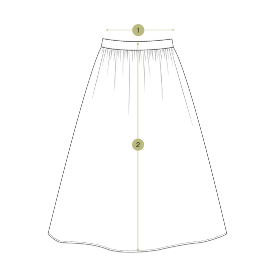 These individual product measurements have been taken from the garment pattern. The bust, waist, waistband, hip & hem measurements have been doubled to show the full circumference.