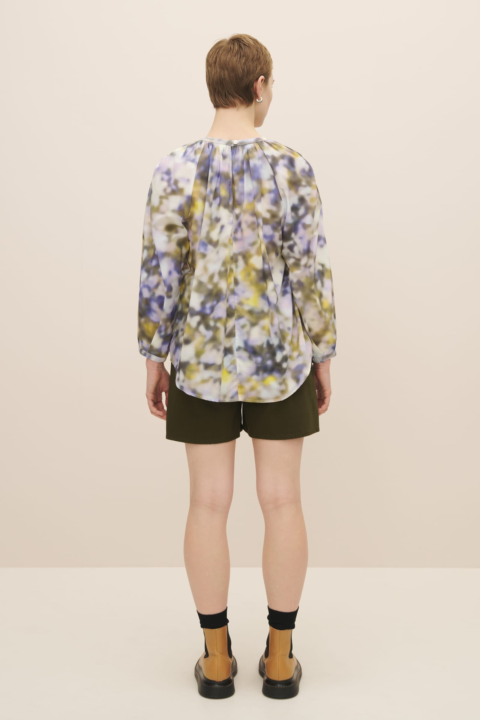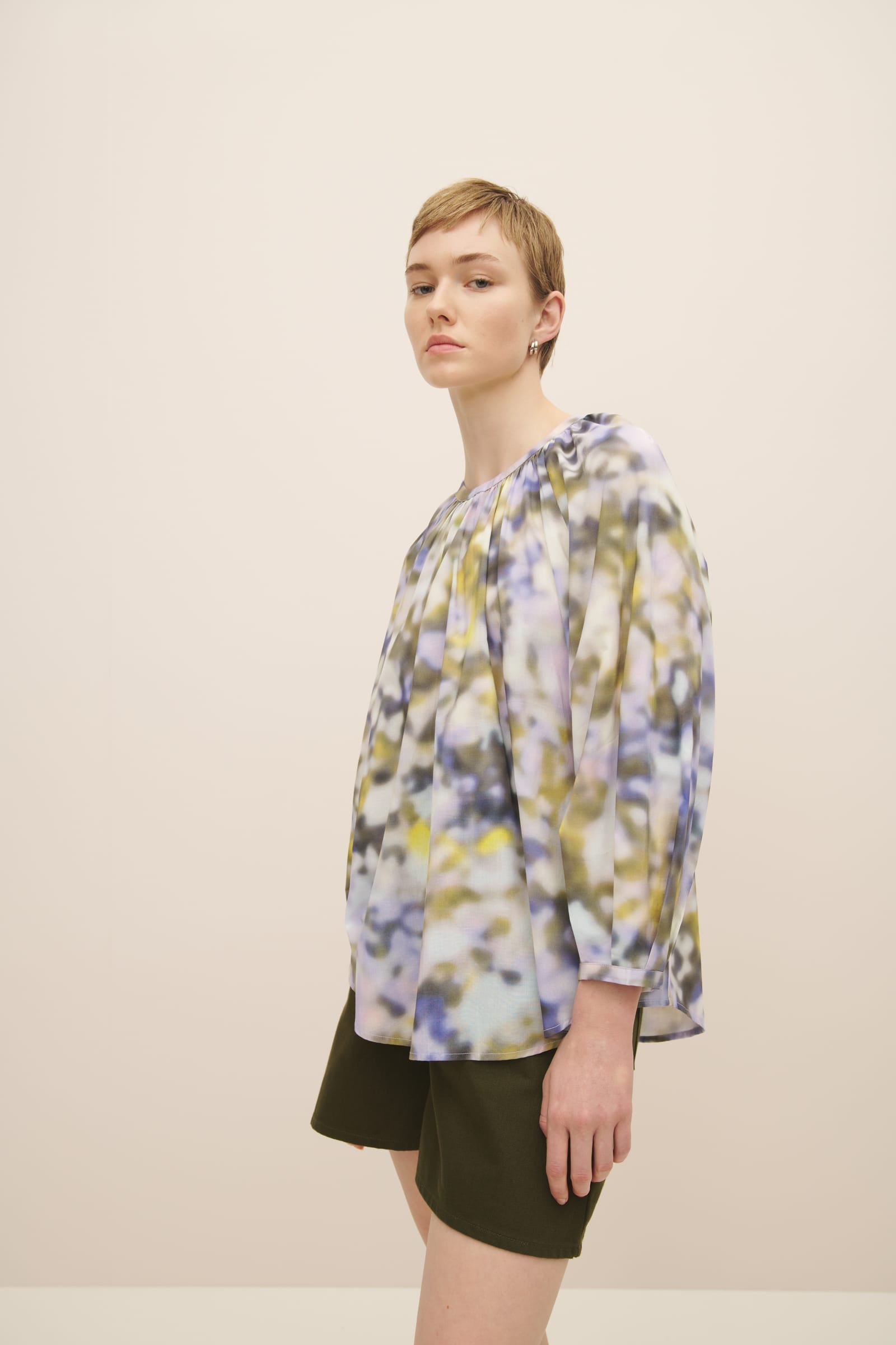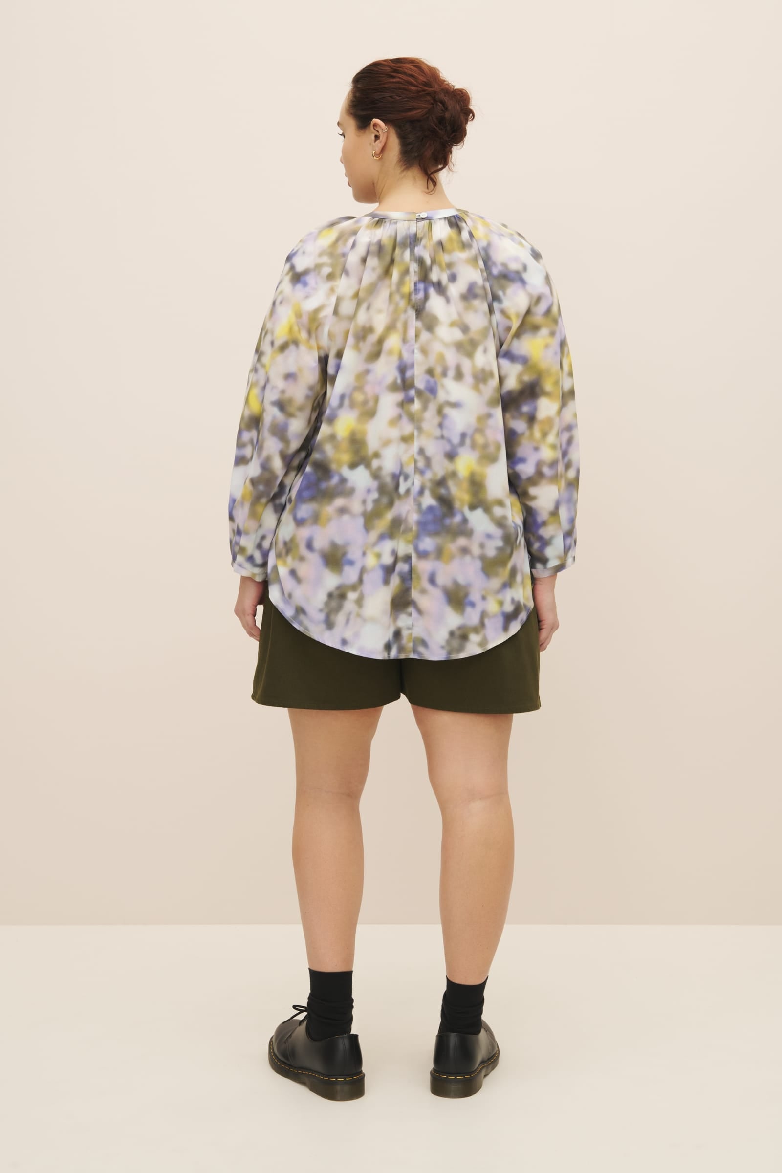 Digitally printed in our Komorebi print and made from 100% certified Fairtrade lightweight organic cotton voile, the Zinnia Top balances elegance with ease. It features a gathered neckline and pleated sleeves for subtle volume, while a curved hem ensures ease of wear. It has an oversized fit with raglan sleeves, and fastens at the back with a nut button. Our Komorebi print was inspired by dappled light filtered through a forest canopy.