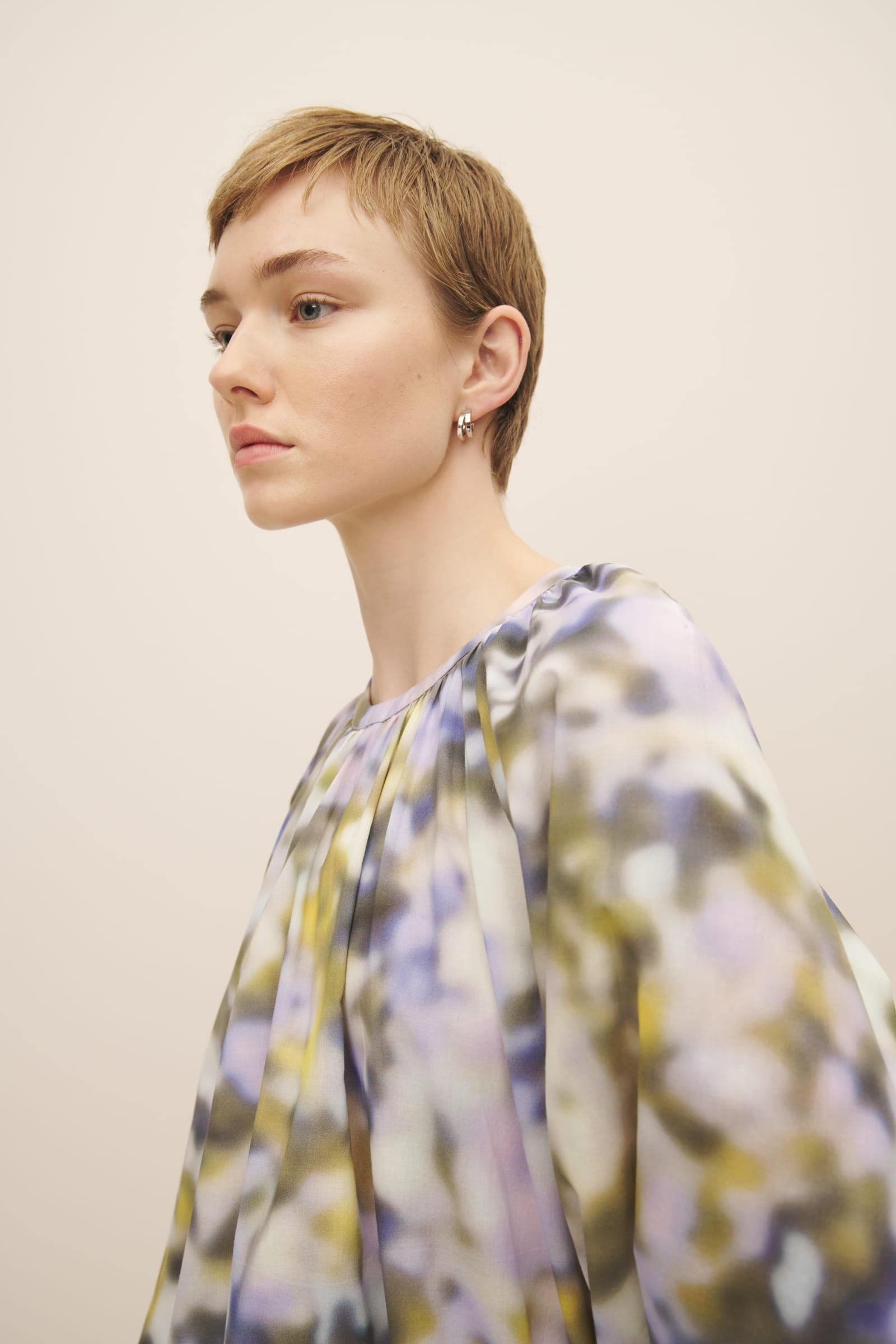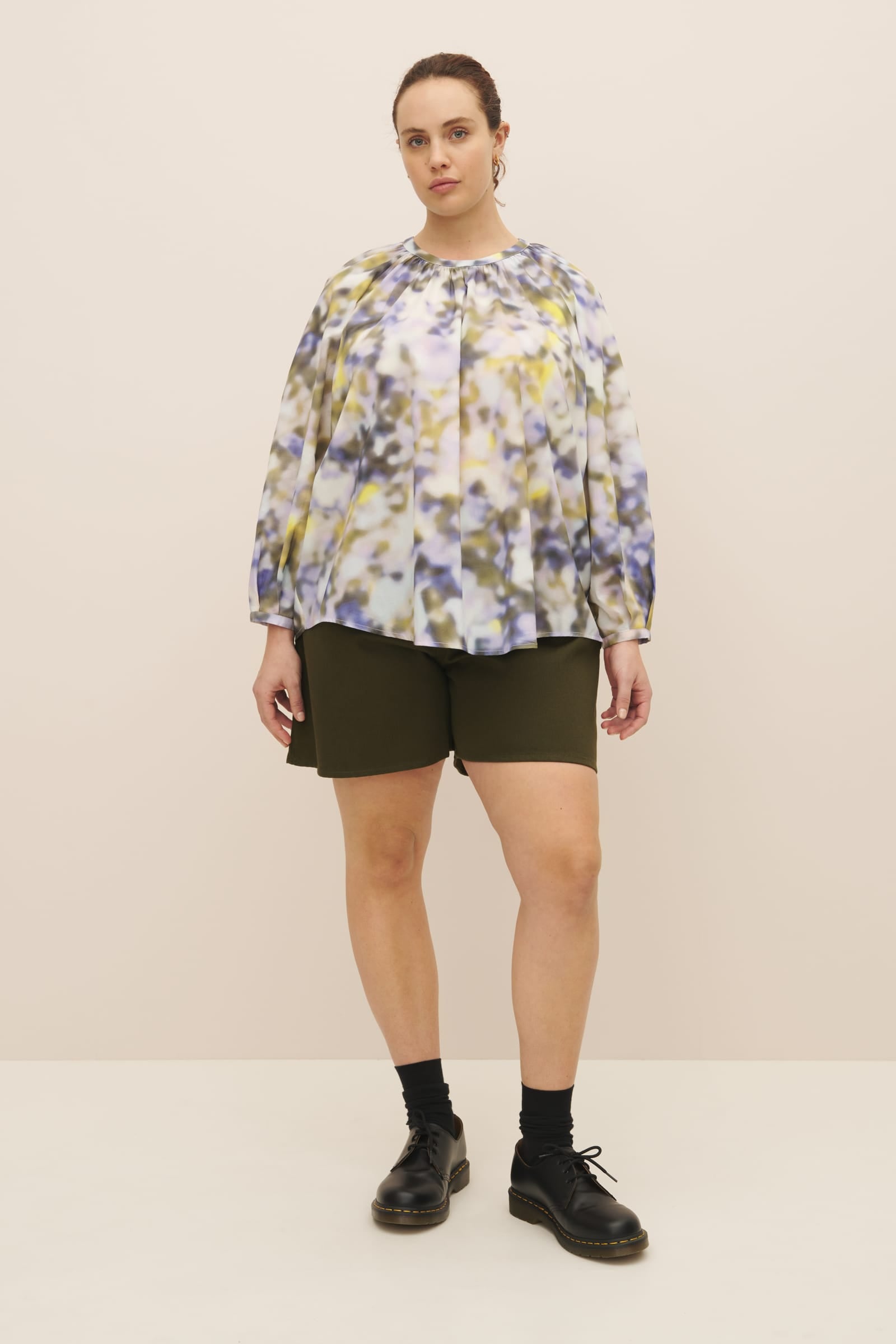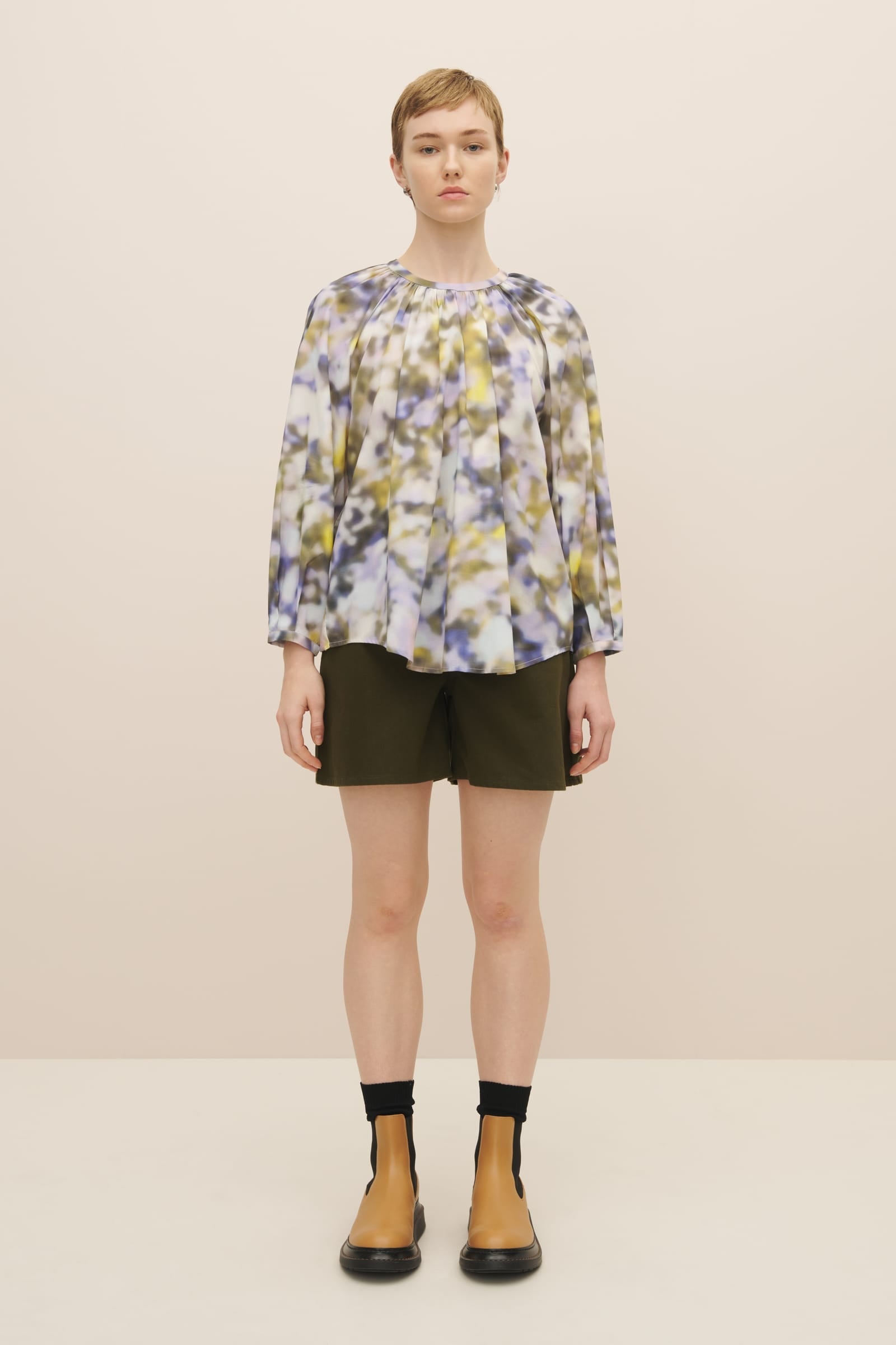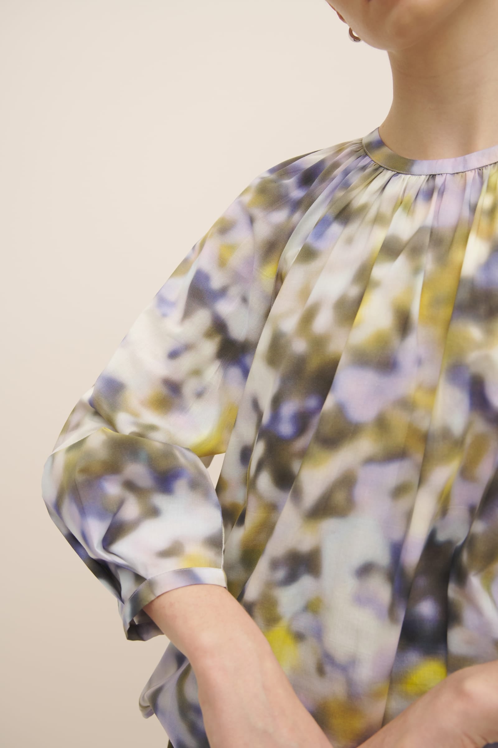 Digitally printed in our Komorebi print and made from 100% certified Fairtrade lightweight organic cotton voile, the Zinnia Top balances elegance with ease. It features a gathered neckline and pleated sleeves for subtle volume, while a curved hem ensures ease of wear. It has an oversized fit with raglan sleeves, and fastens at the back with a nut button. Our Komorebi print was inspired by dappled light filtered through a forest canopy.