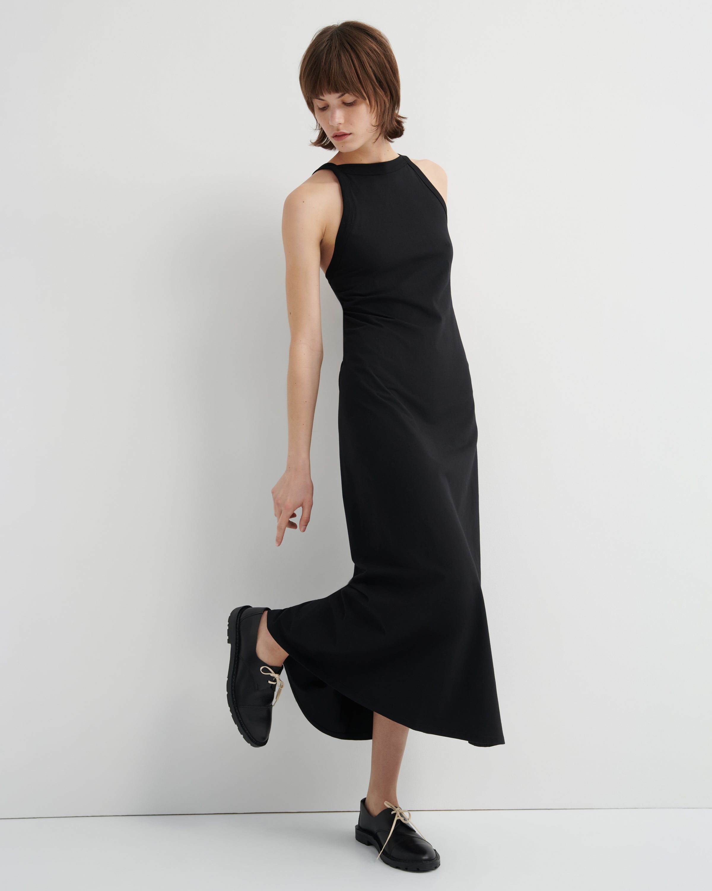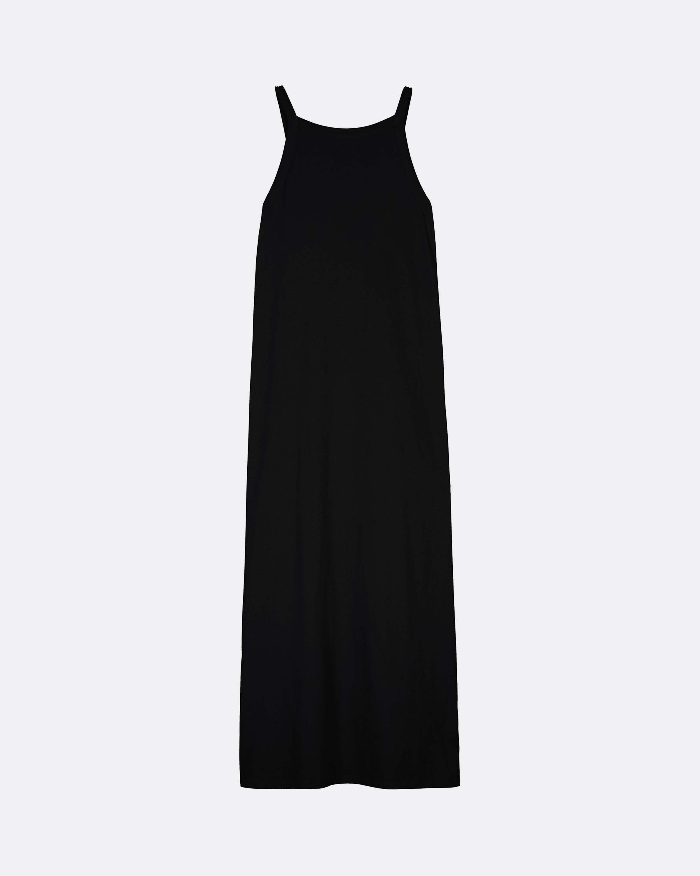 A versatile addition to any wardrobe. A full-length, form-hugging, slip-on silhouette with a high neckline and low square back.