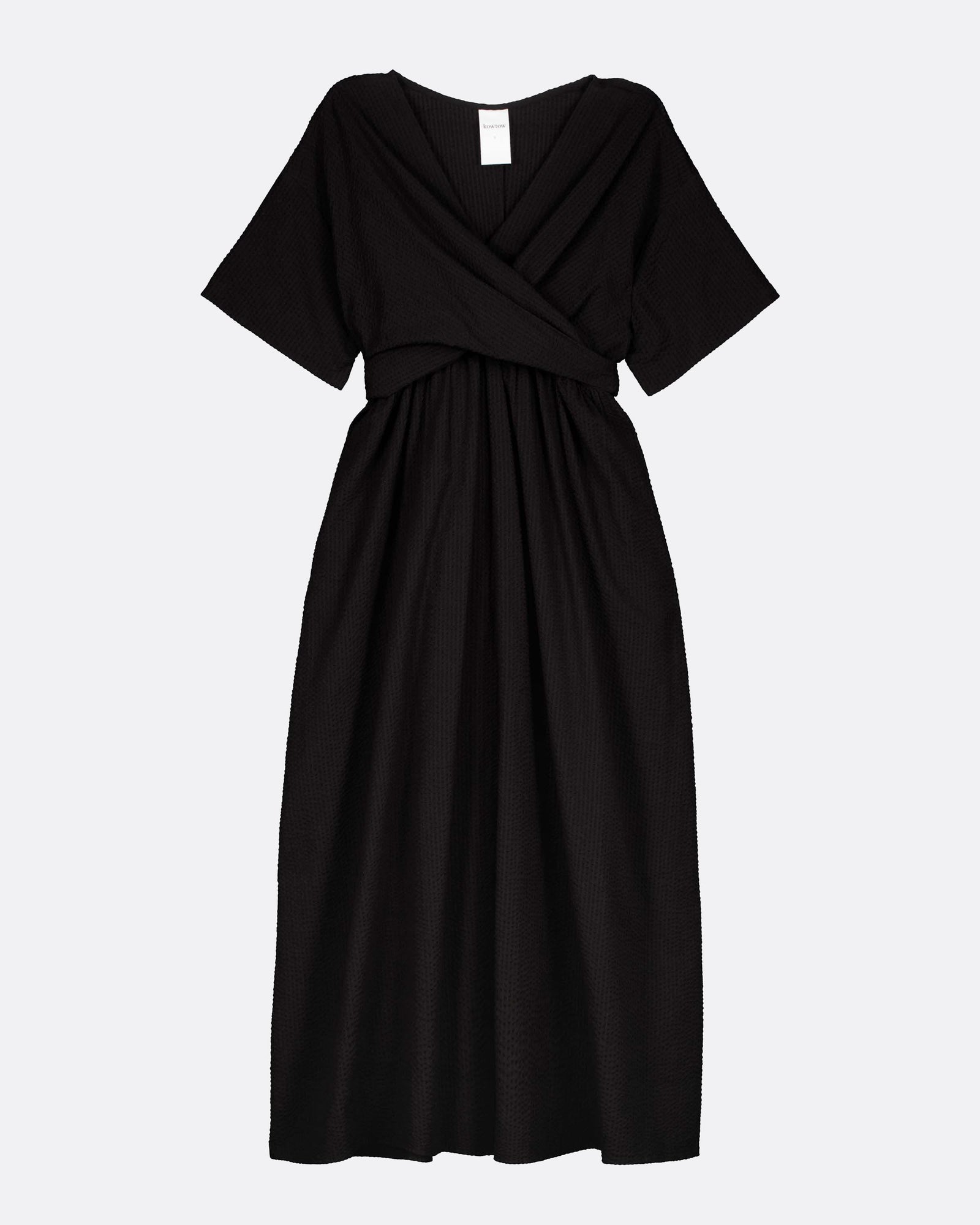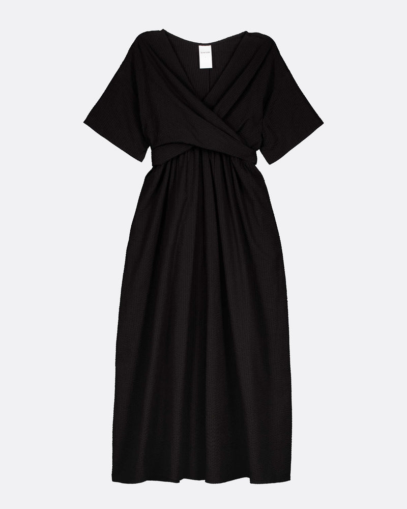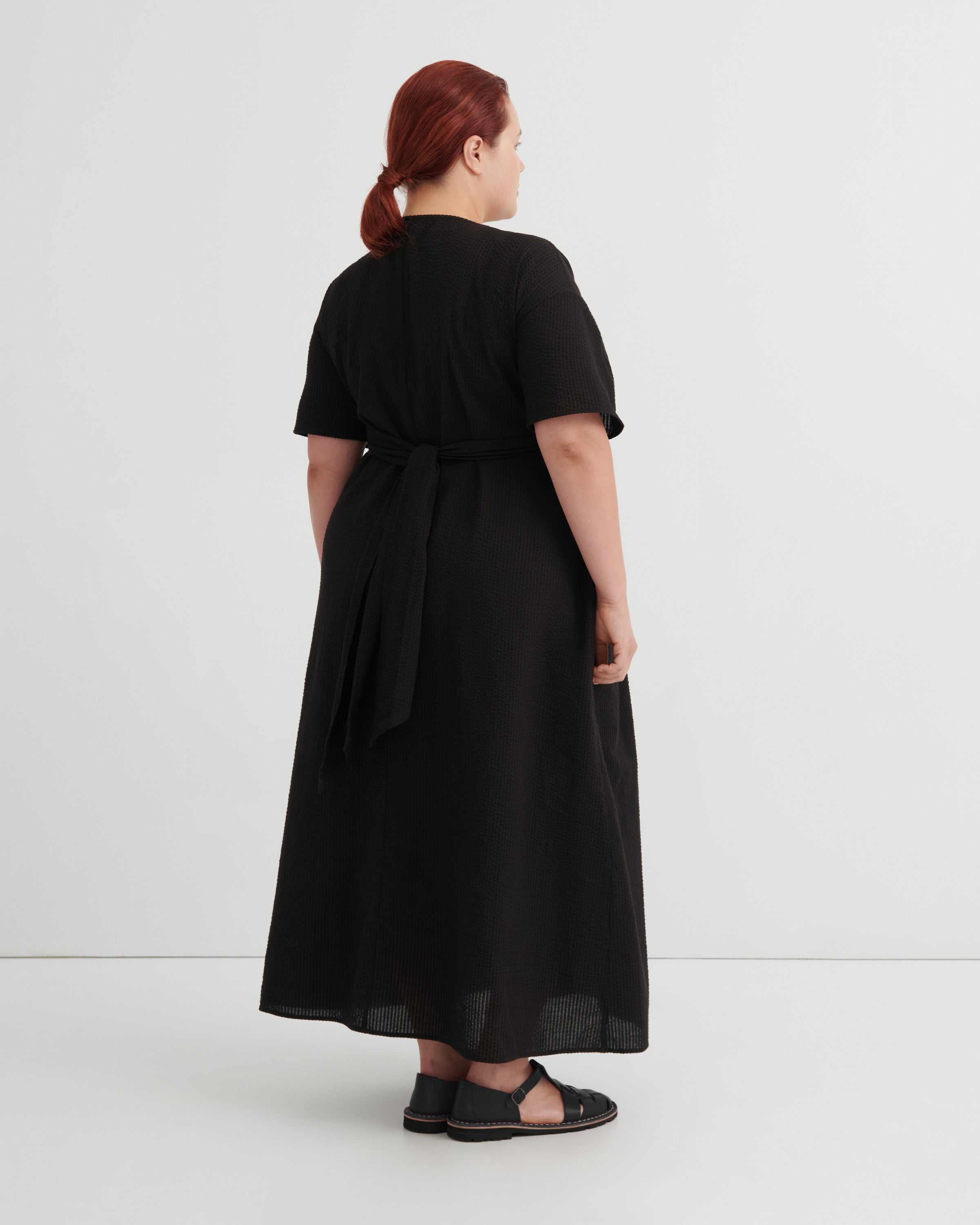 The Composer Dress is defined by its wrap front detail, creating a flattering v-neckline. Crafted from our new textural organic cotton seersucker, it features a standard fit with subtle shaping through the back bodice and inseam pockets for effortless functionality.