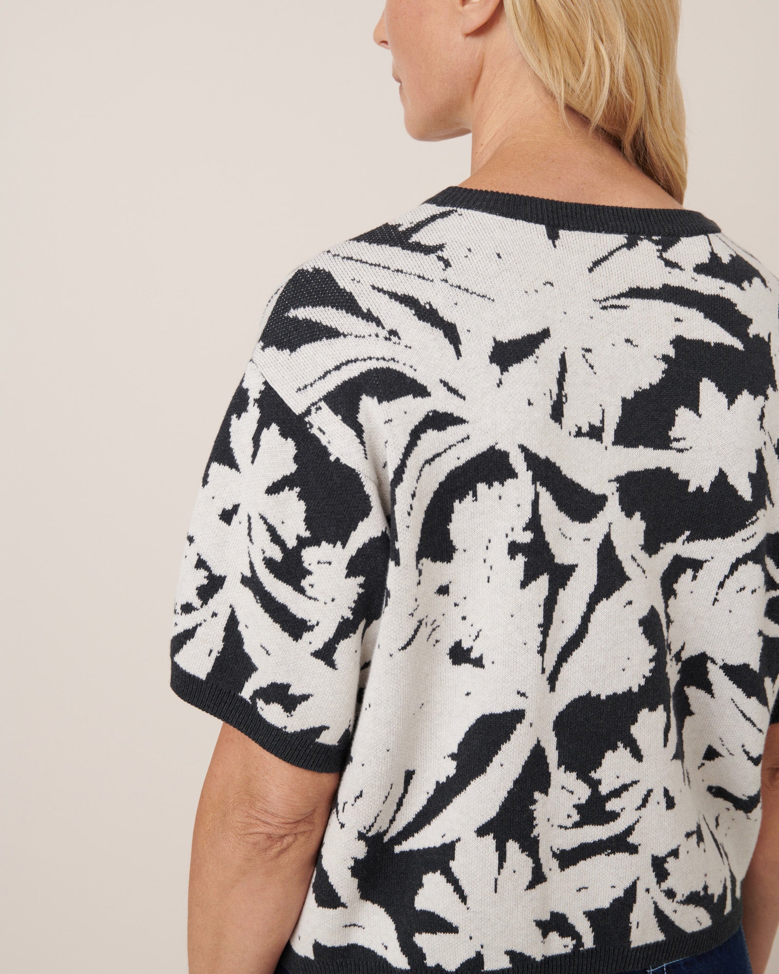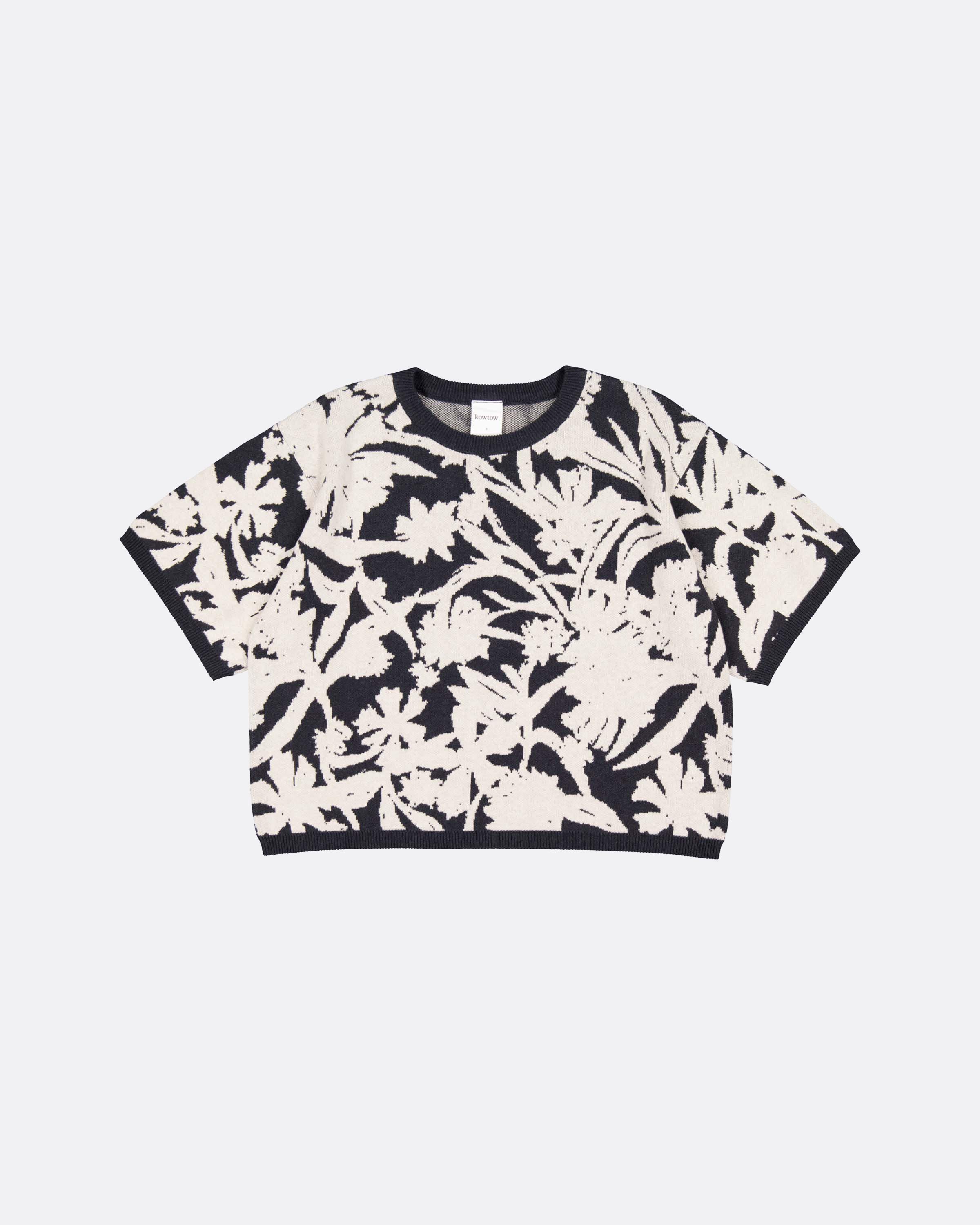 The Etched Top is a lightweight knit top with a relaxed fit, showcasing our Etched Denim pattern reimagined in a jacquard knit design. Slightly cropped through the body, it features contrast ribbing at the neckline, hem and cuffs for a polished finish. Crafted in a jacquard stitch in soft organic cotton.
