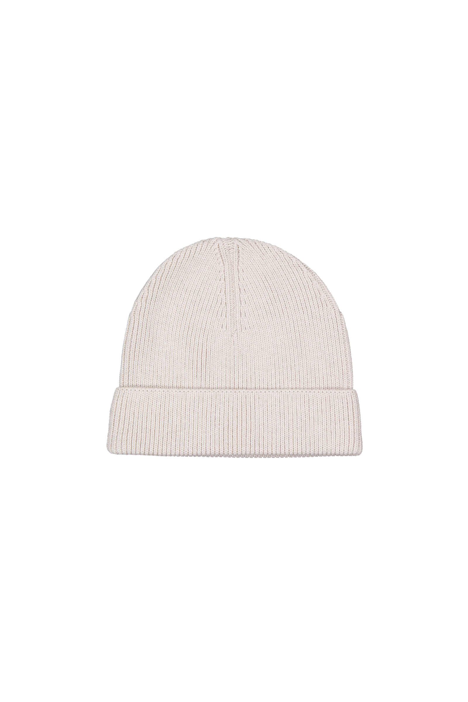 A rib-knitted beanie with a rolled hem. Made from organic cotton, it has been individually knitted to prevent yarn waste during production.