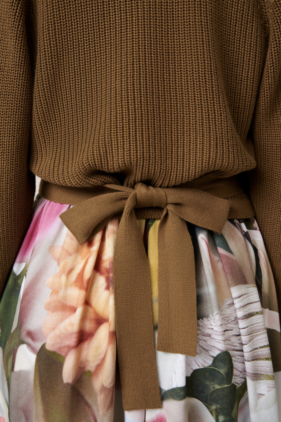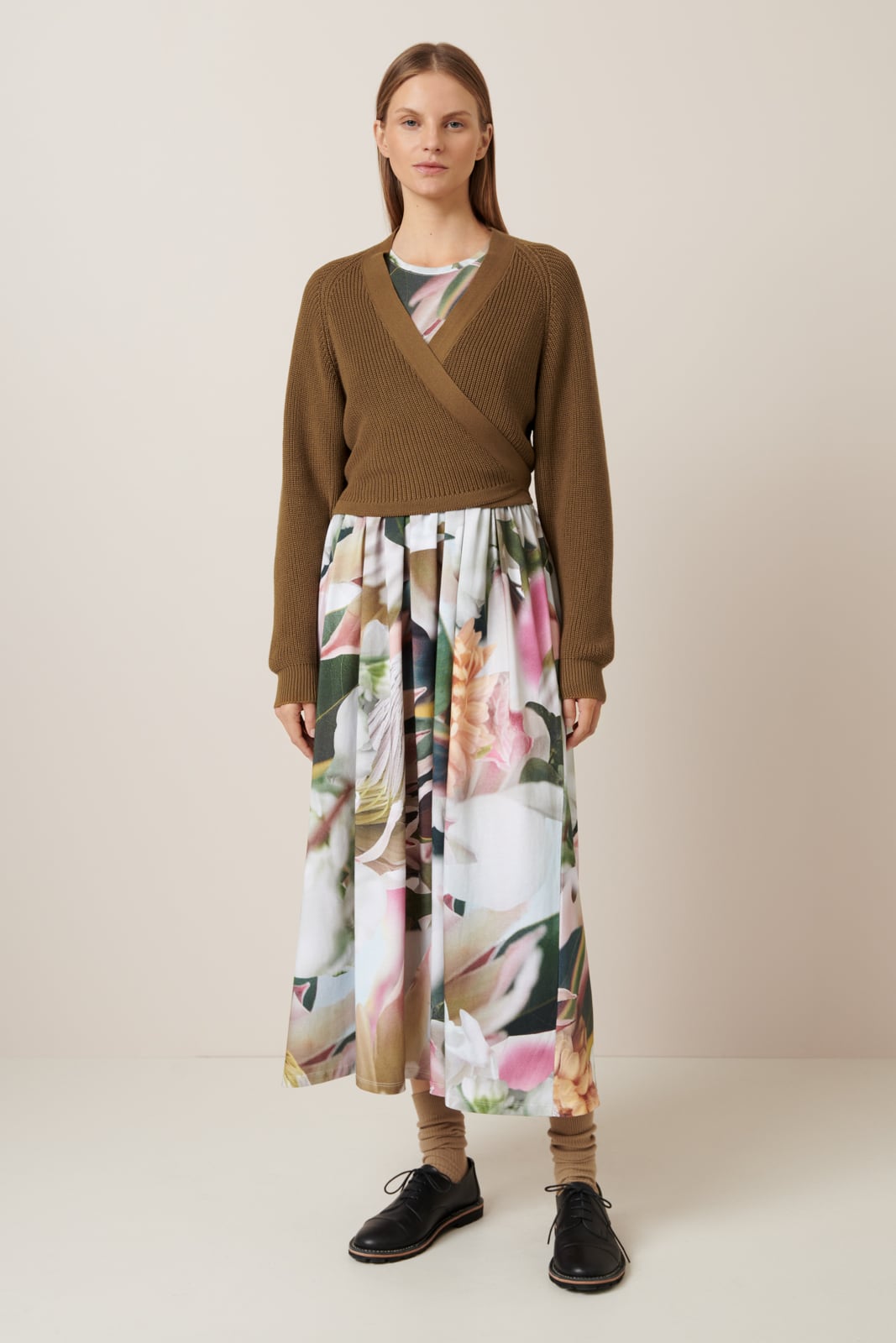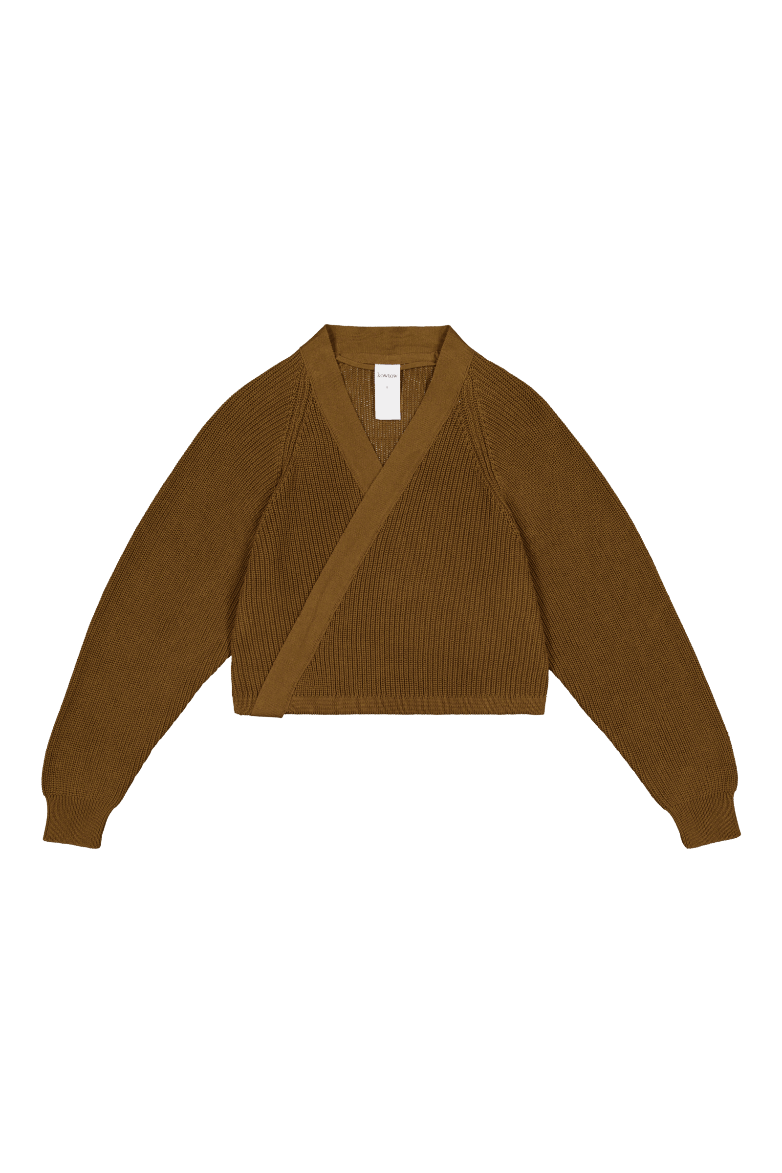 A ballet style wrap cardigan, made from organic cotton and knitted in a tuck stitch. The Composure Cardigan has a generous fit through the body, and is slightly cropped in length. A versatile piece that can be worn loose, or cinched in at the waist with narrow tie fastenings. Great for layering over your favourite dress or a pair of jeans.