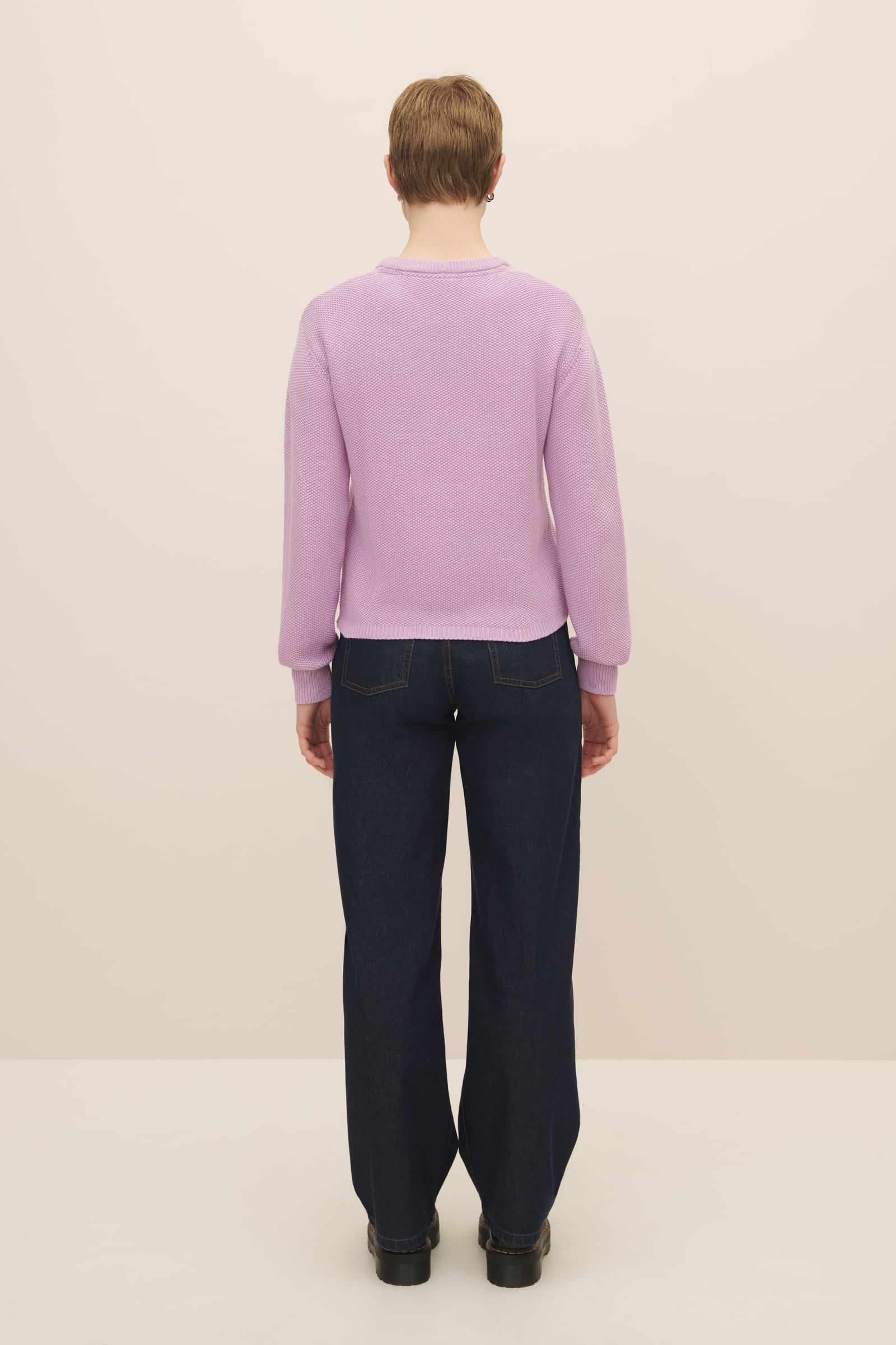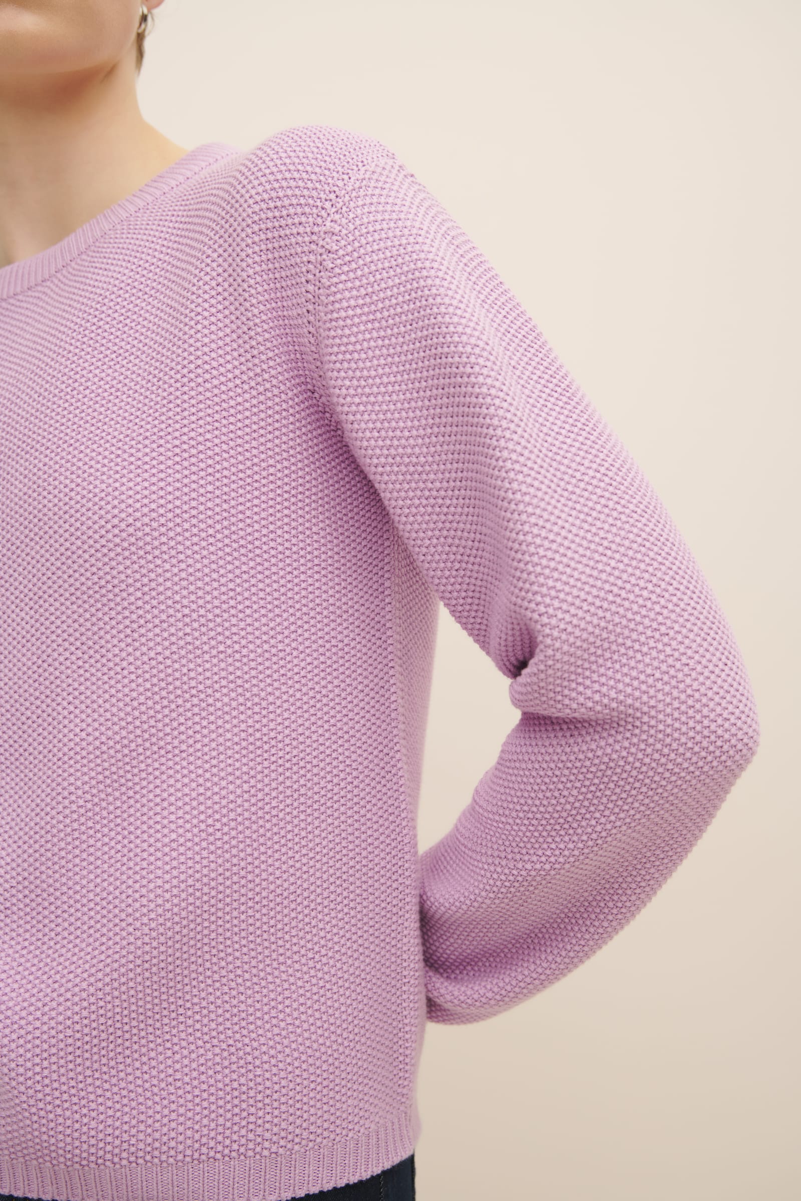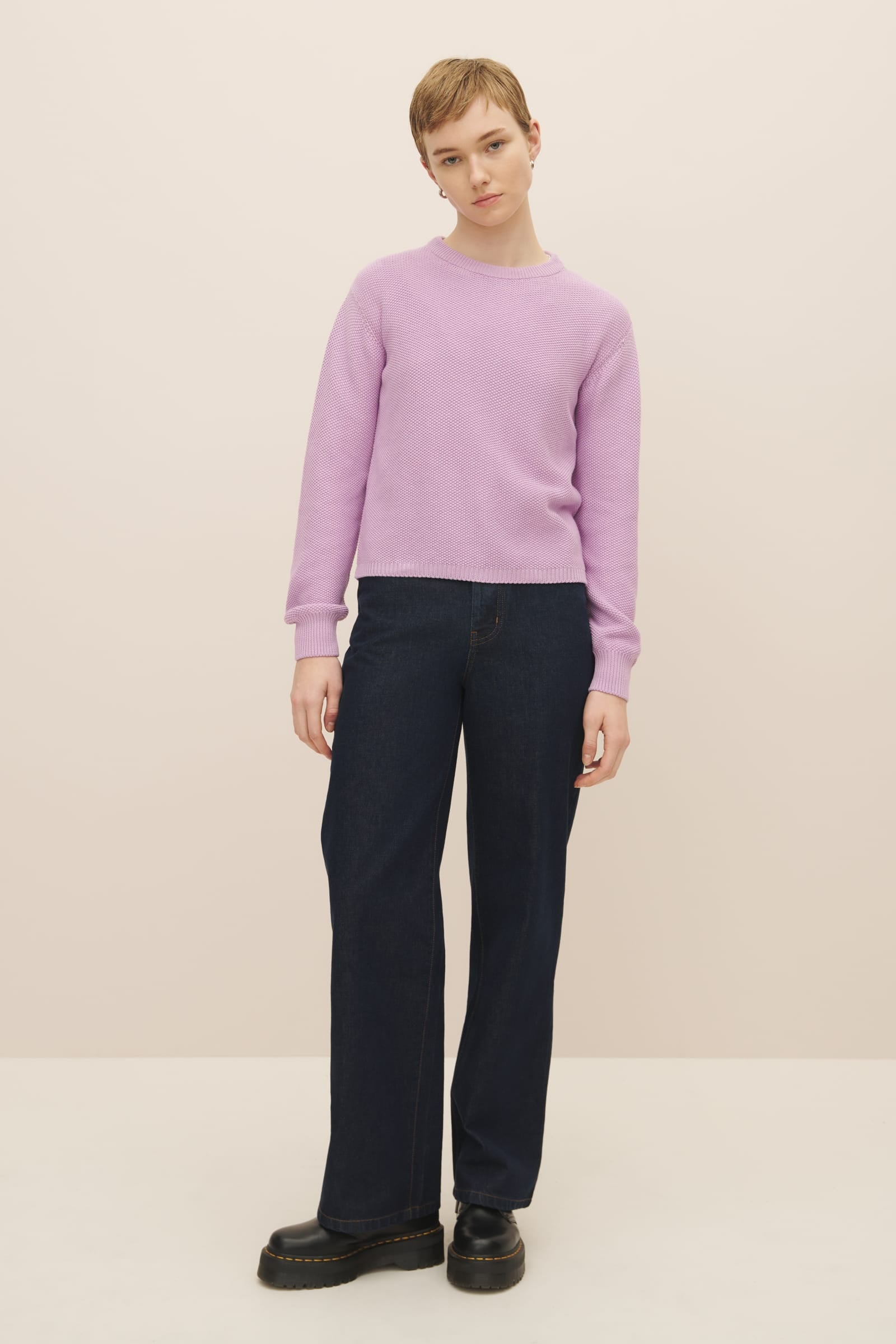 A crew neck jumper made from 100% certified Fairtrade organic cotton and knitted in seed stitch. The Escape Crew is designed for a standard fit, and is finished with a narrow rib at the neckline, hem and cuffs. The perfect trans-seasonal piece.