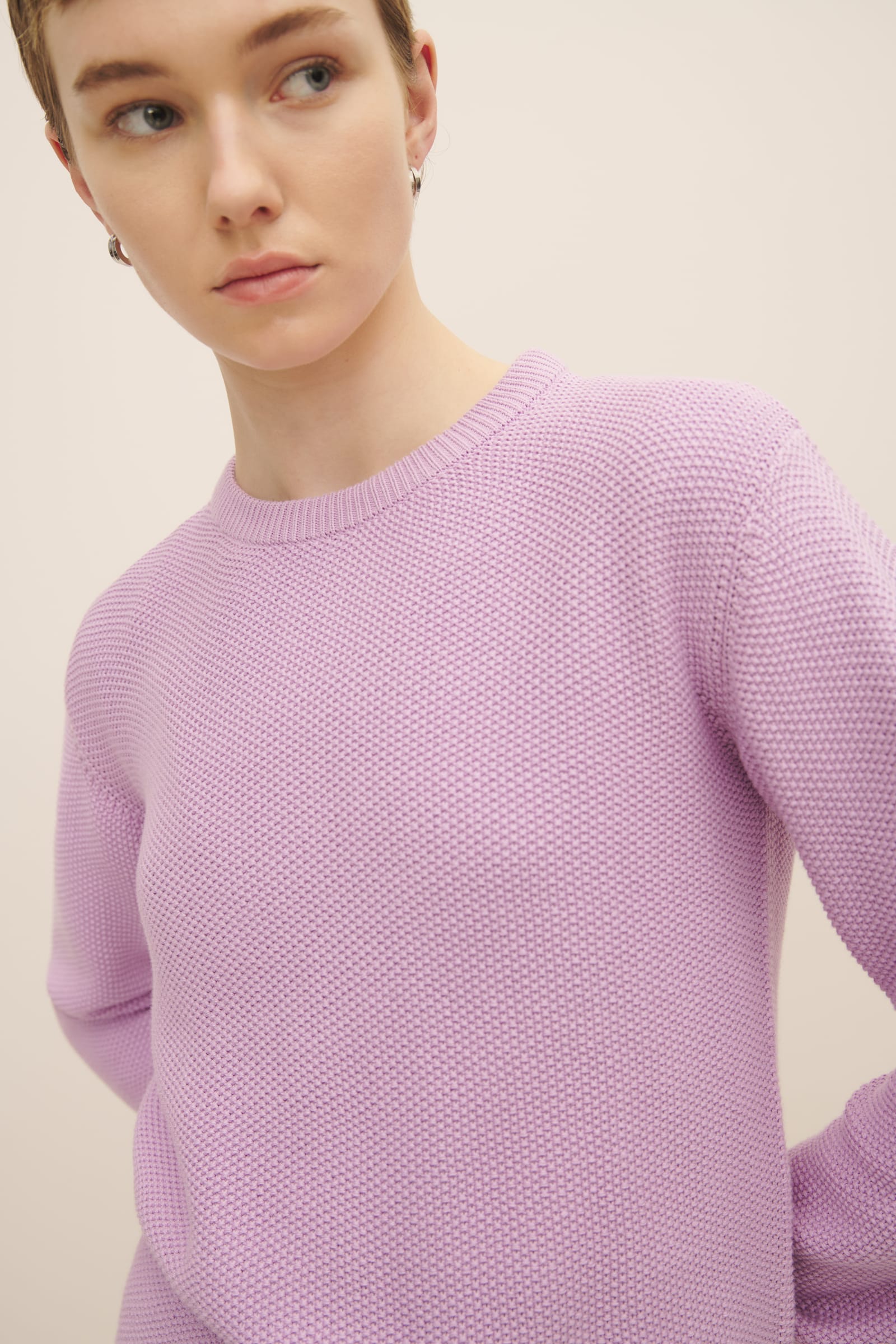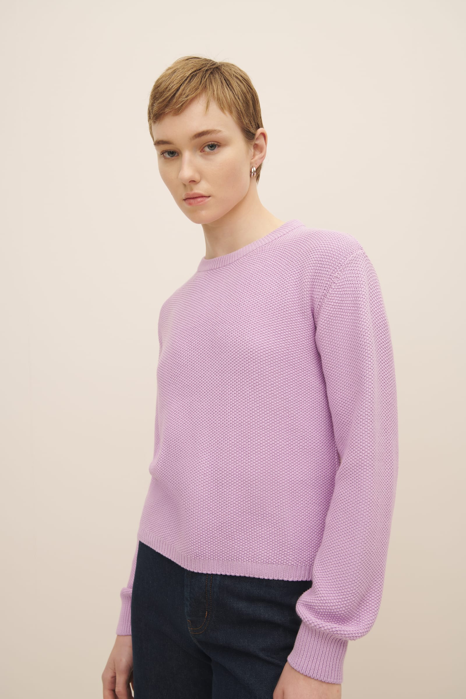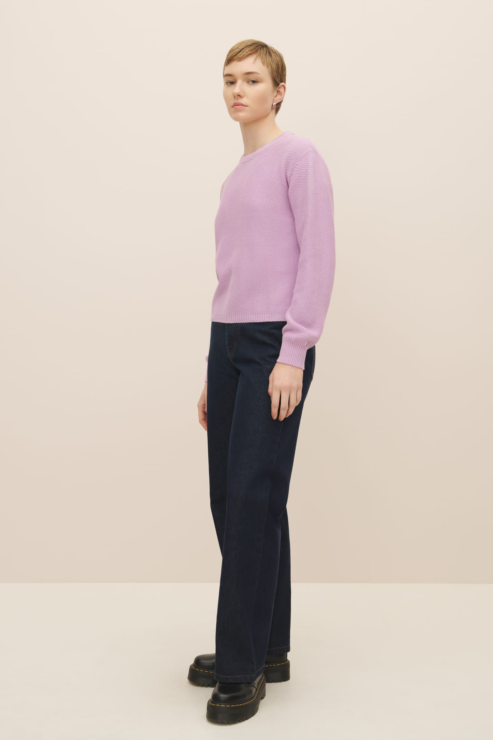 A crew neck jumper made from 100% certified Fairtrade organic cotton and knitted in seed stitch. The Escape Crew is designed for a standard fit, and is finished with a narrow rib at the neckline, hem and cuffs. The perfect trans-seasonal piece.
