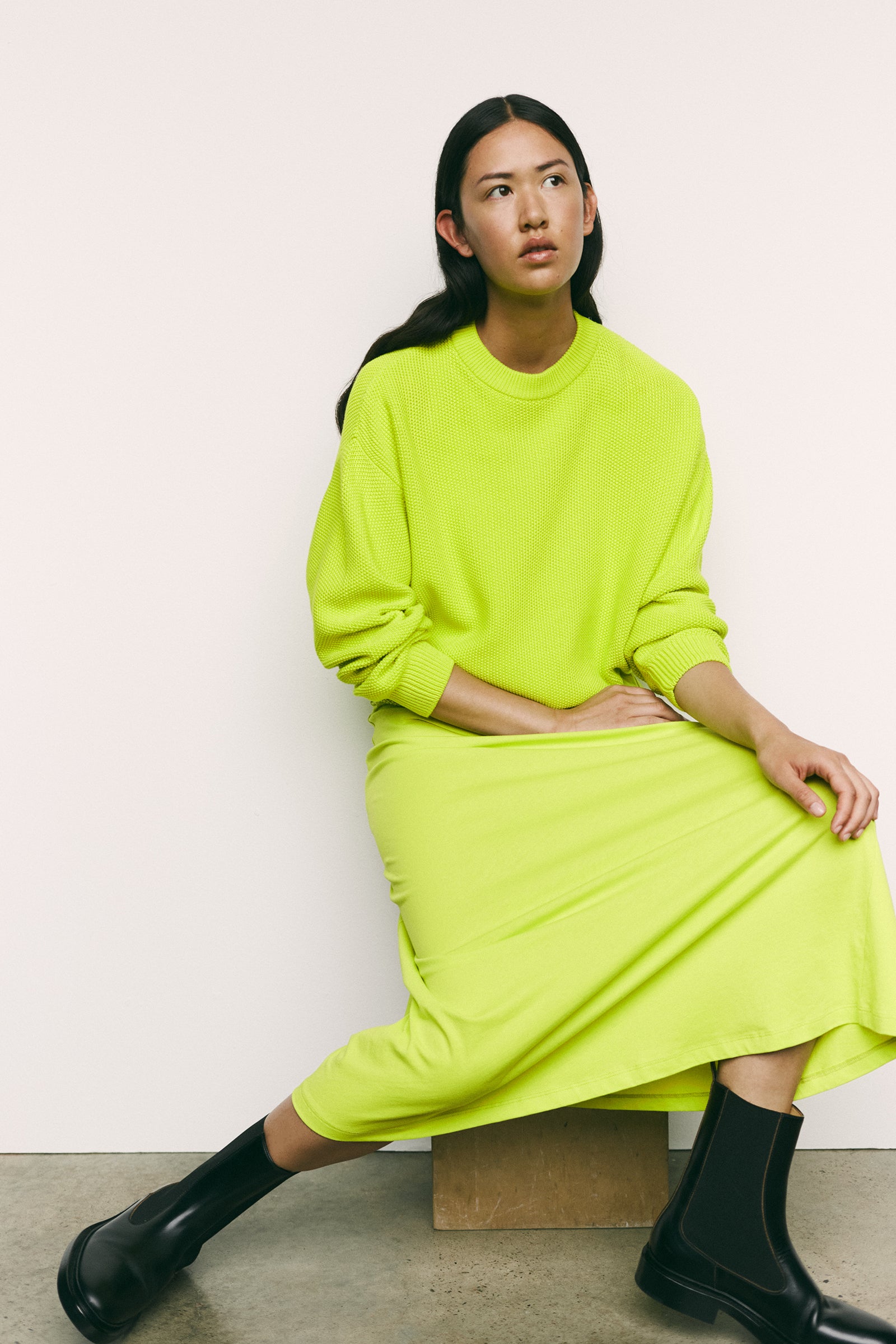 A relaxed take on our Escape Crew, the Hero crew is an easy-wear style in a bold Fluro Yellow colourway. Designed for an oversized fit, it features a crew neckline and is knitted in a soft organic cotton seed stitch. Finished with a narrow rib at the neckline, hem and cuffs for a refined touch.