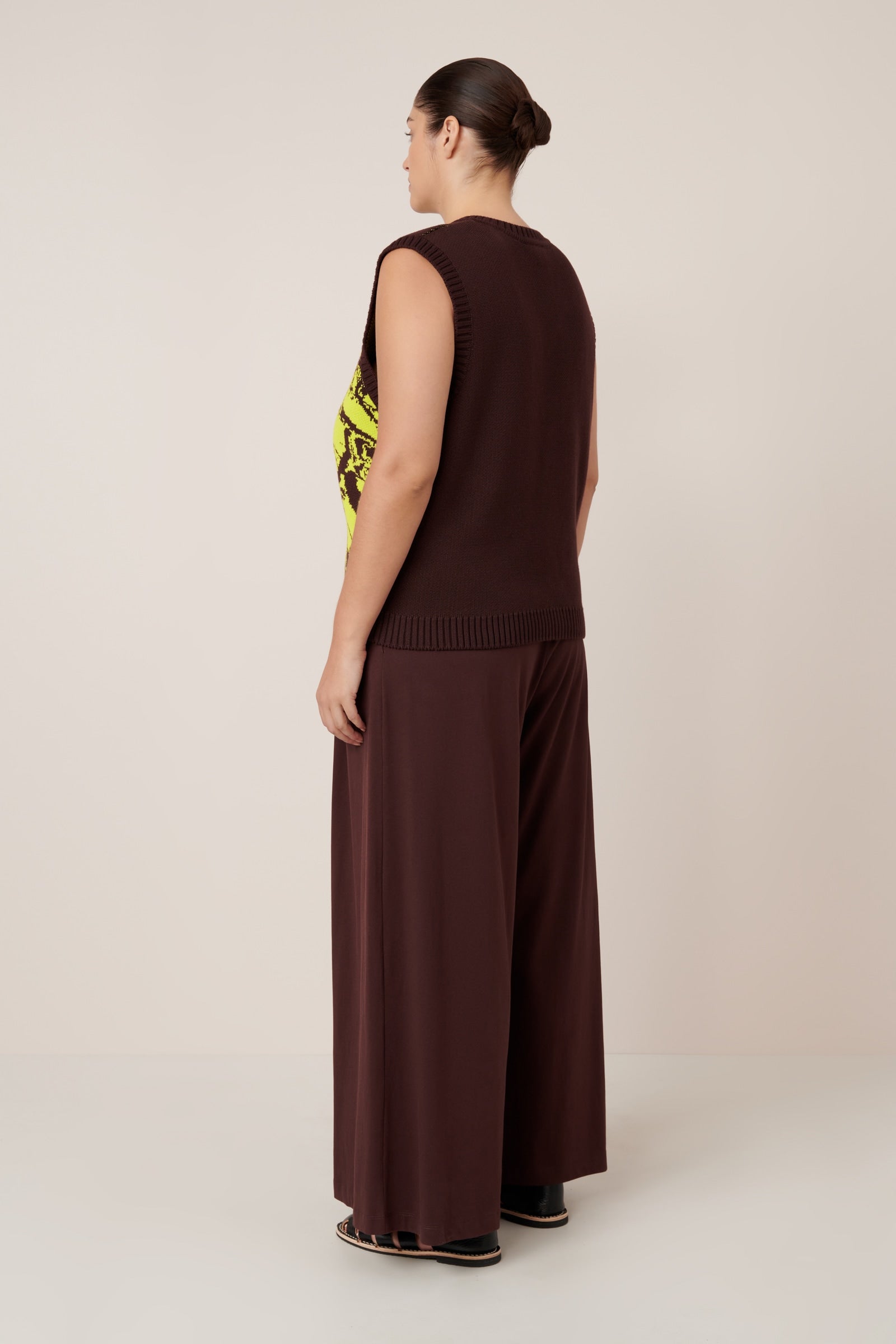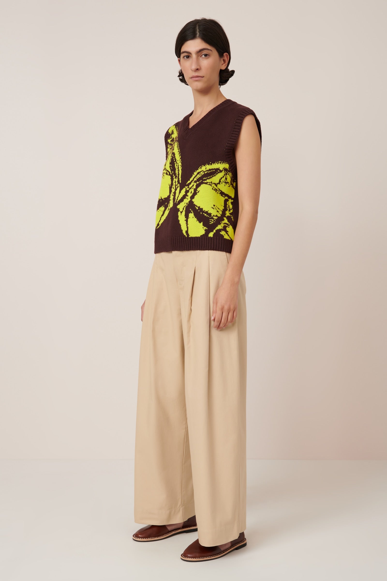 The Wingspan Vest offers a relaxed fit with a flattering v-neck and ribbed detailing at the neckline, hem, and armholes. A bold fluro yellow butterfly design on the front creates a striking contrast against the rich mahogany base, adding an eye-catching colour clash to this simple yet distinctive piece. Style on its own or layer over your favourite tee.