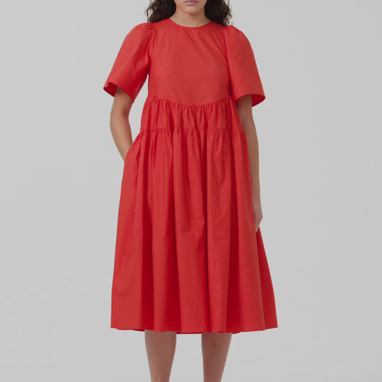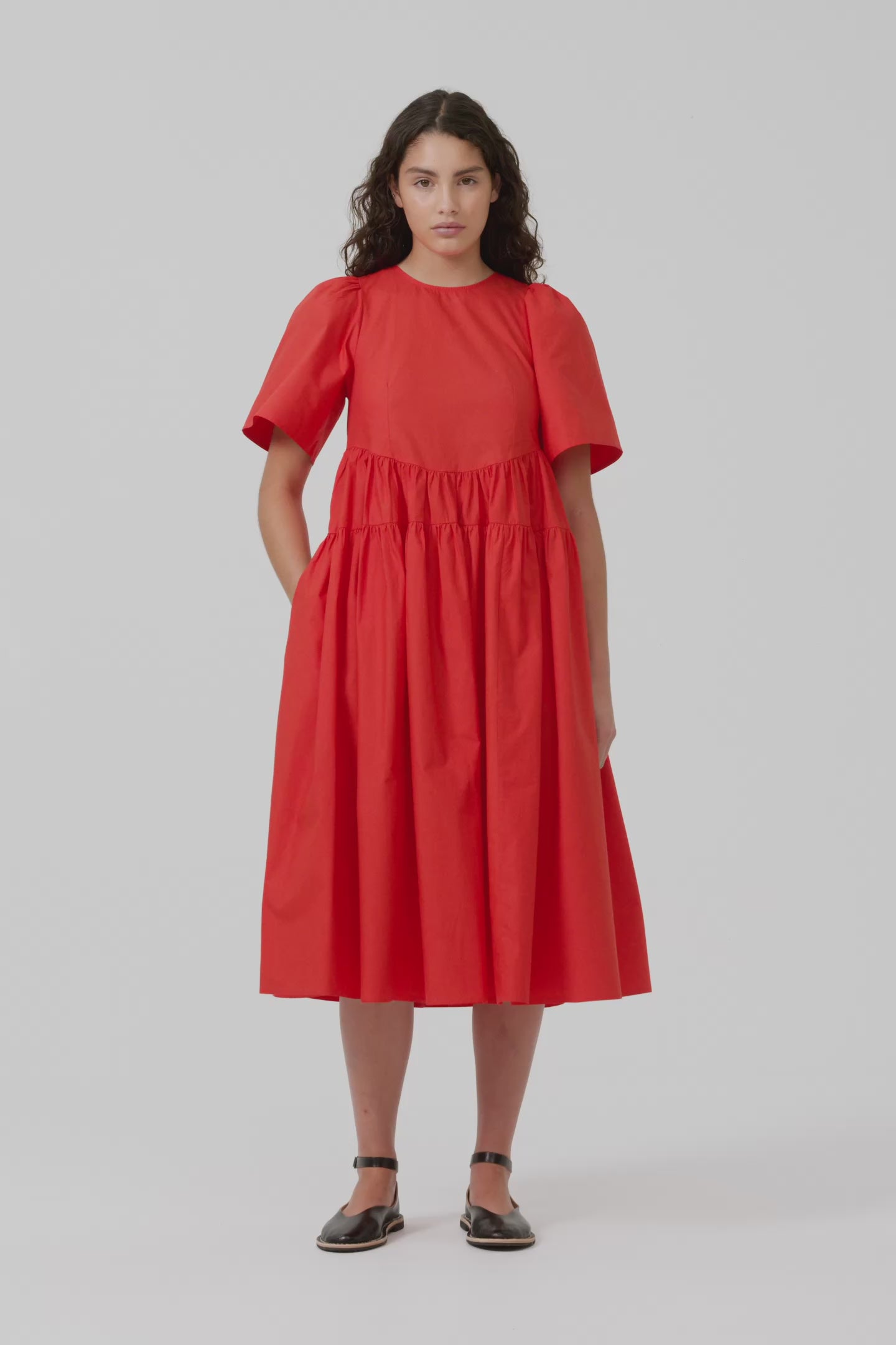The Maquette Dress makes a statement with its voluminous, two tiered gathered skirt that falls to a flattering midi-length. It features puff sleeves, inseam pockets and a key-hole closure with a shell button at the back neck. Designed for a standard fit, this dress is crafted from a crisp organic cotton poplin.