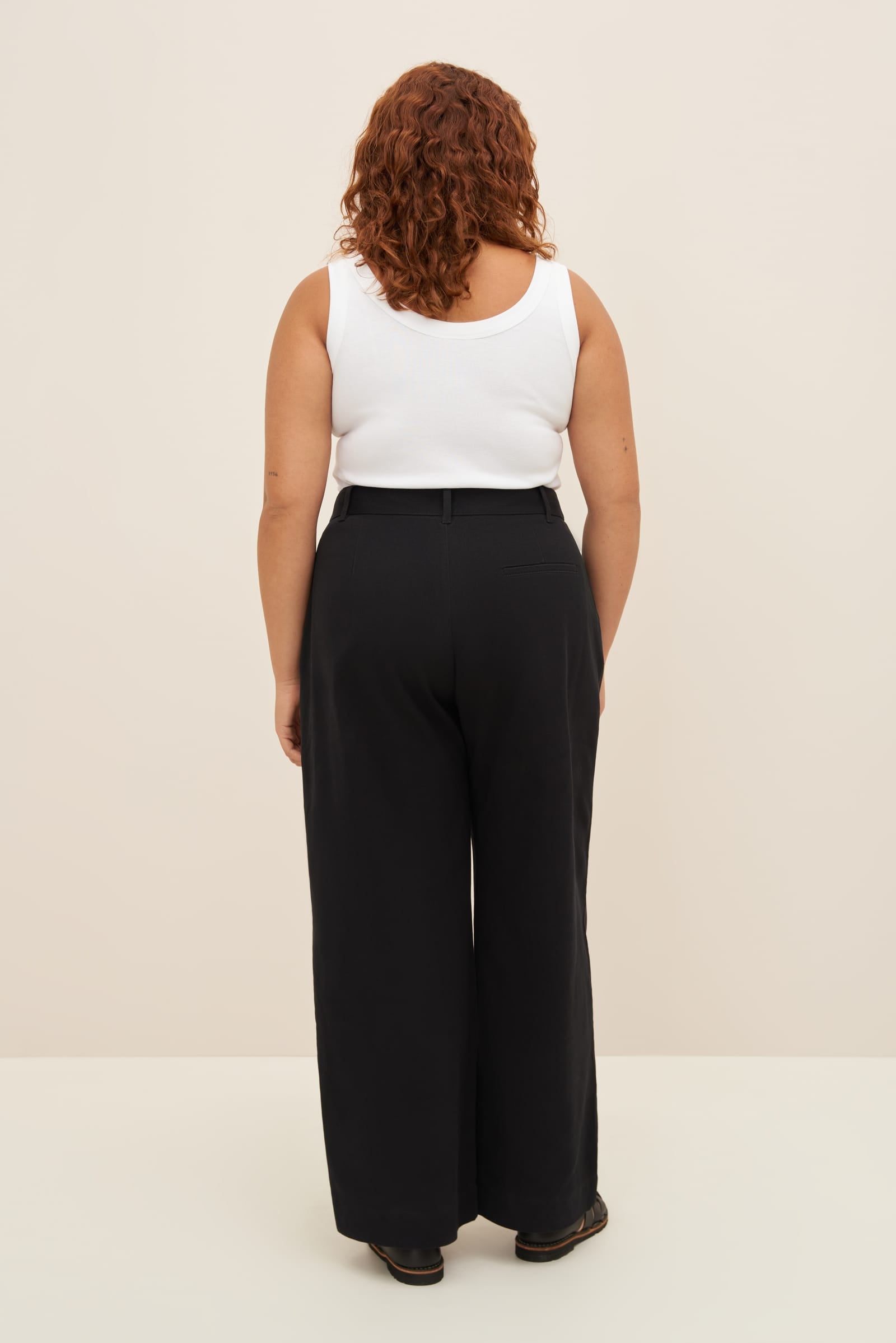 A high-waisted pant with a straight wide leg and front pleats. The pants have angled side pockets, a single back welt pocket, and fasten with a concealed button fly. Made from 100% certified Fairtrade organic cotton in a softened drill.