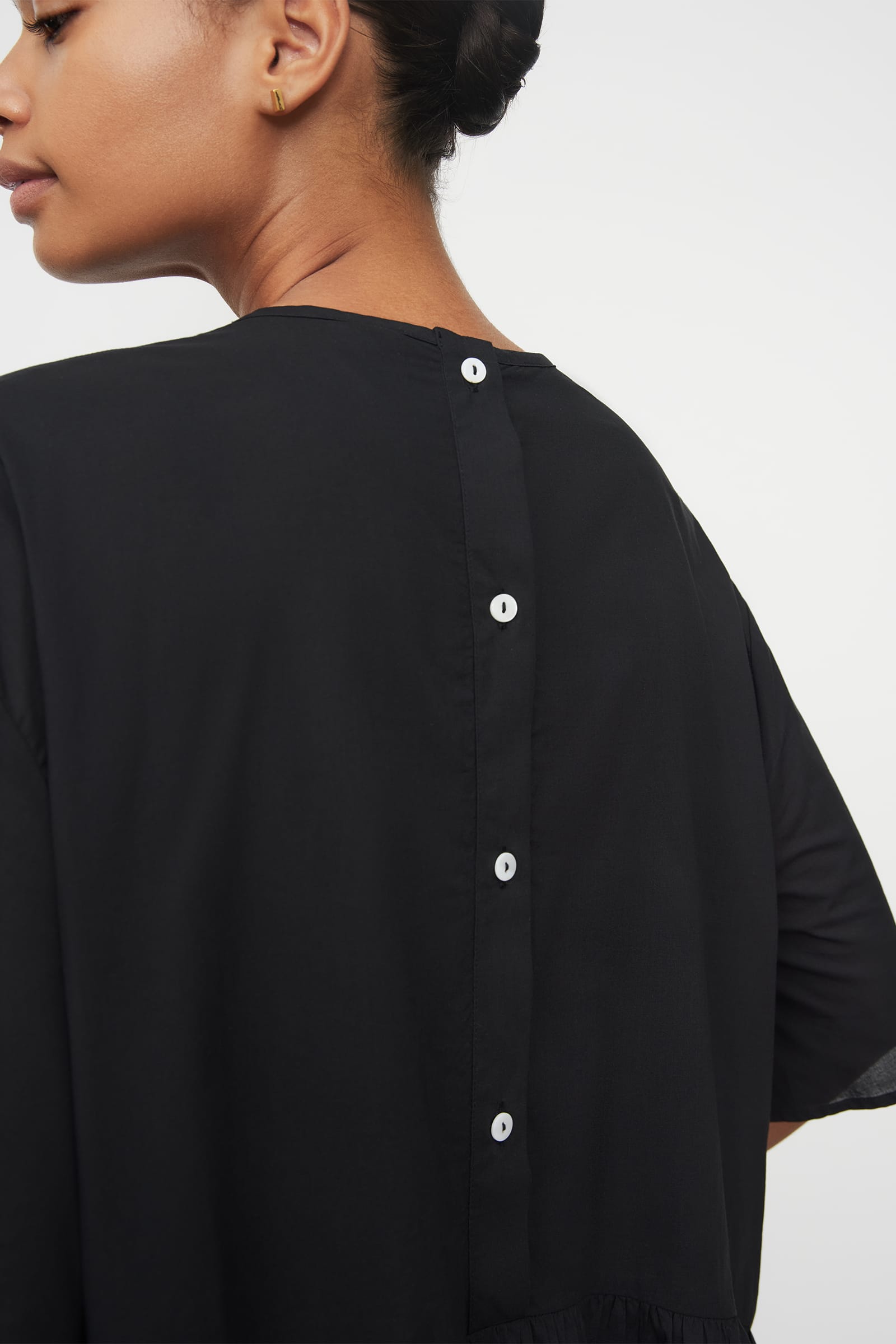 An easy everyday dress, made from 100% certified Fairtrade lightweight organic cotton voile. The Agnes Dress has an oversized fit and falls to a midi length. It features gathers at the neckline and waist, and drop shoulders with short flared sleeves. Fastens with agoya shell buttons at the centre back.