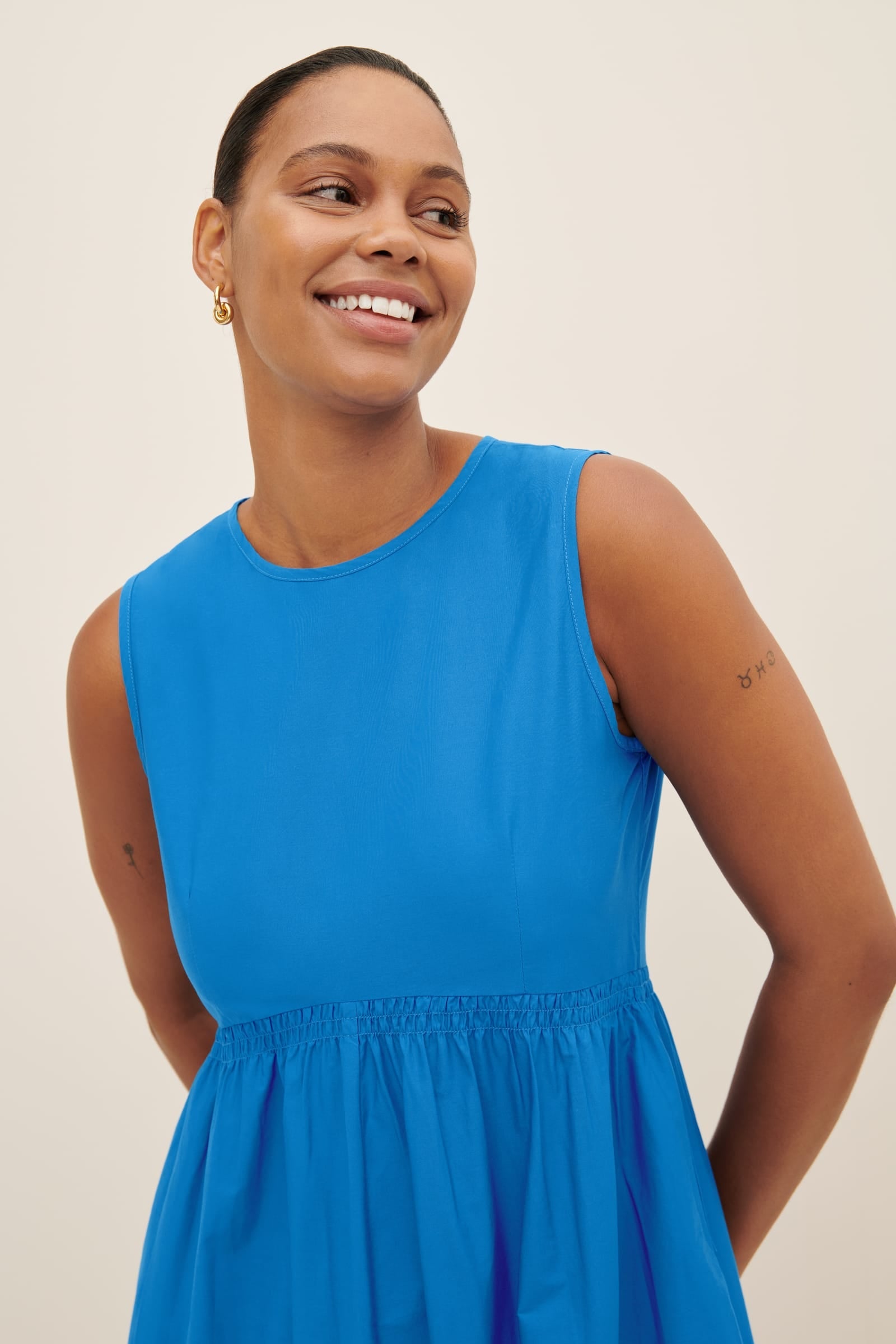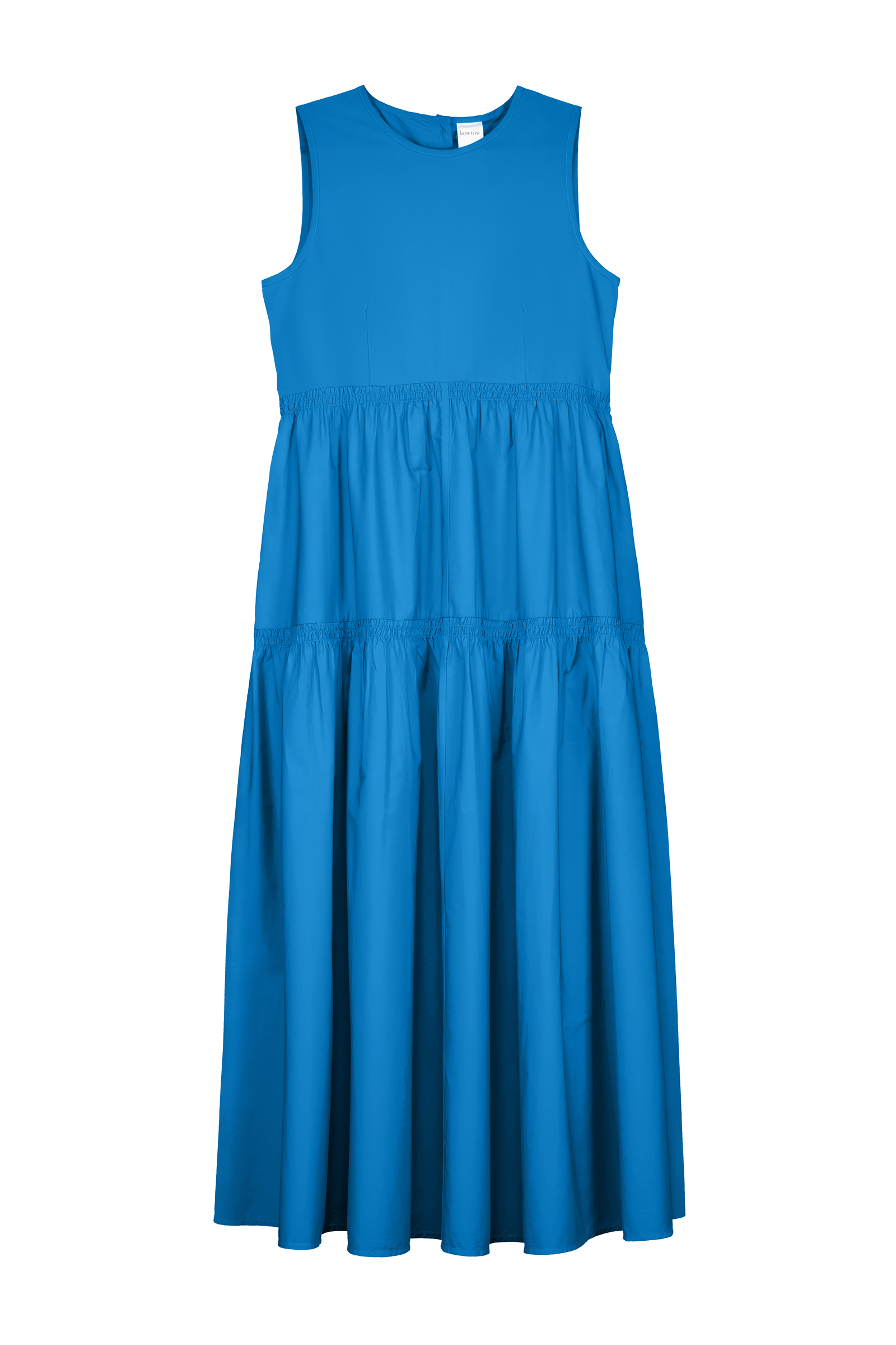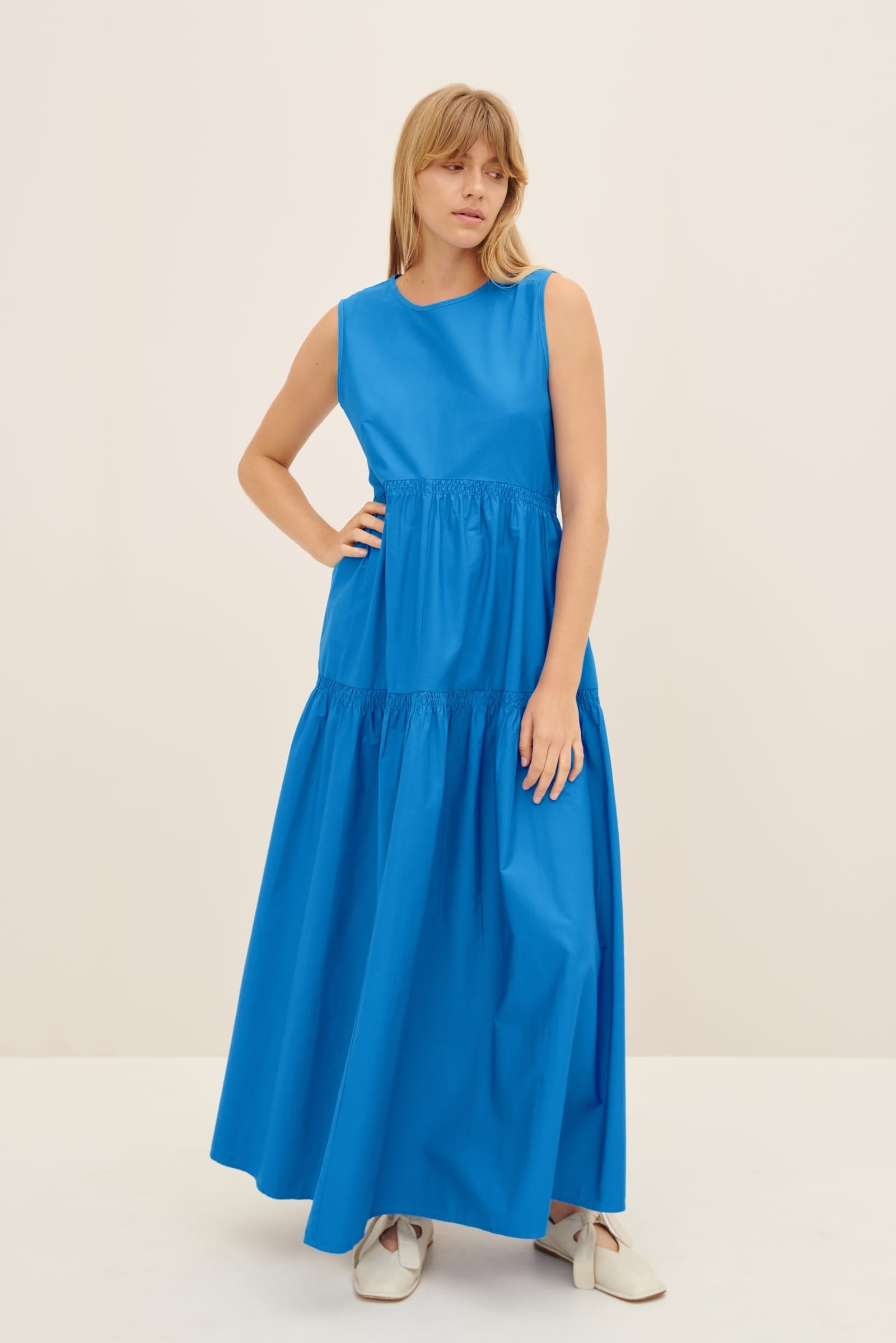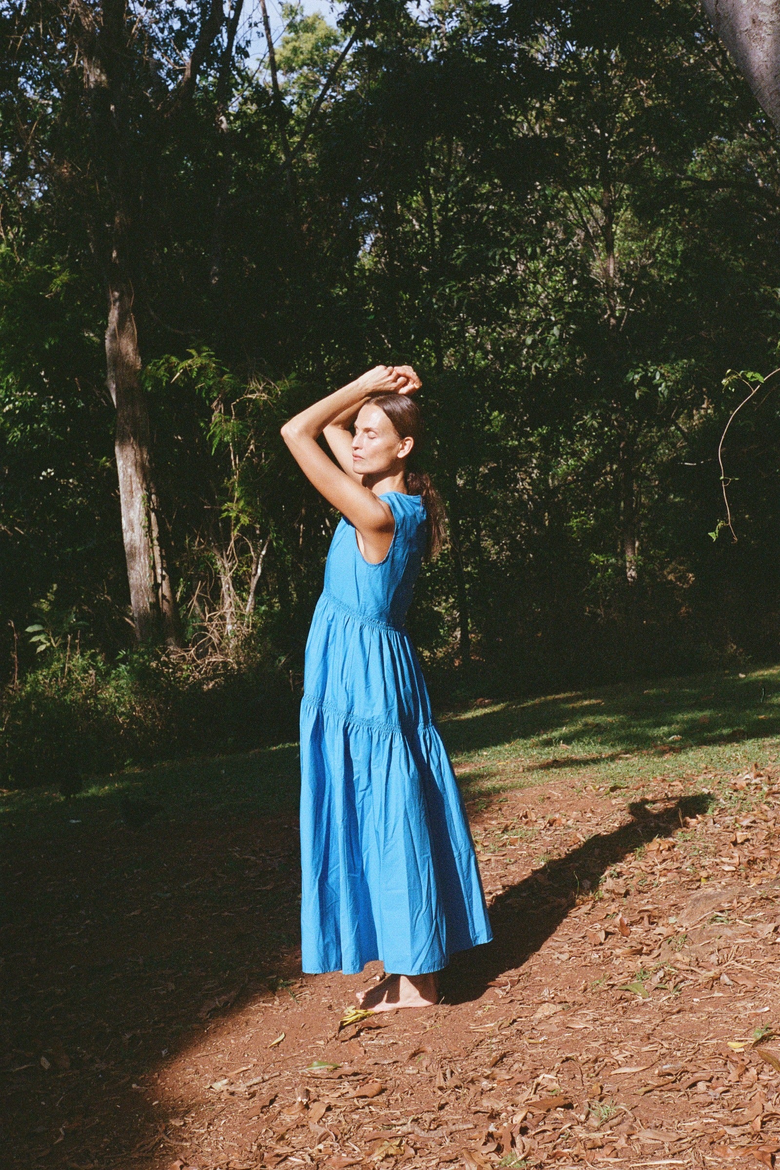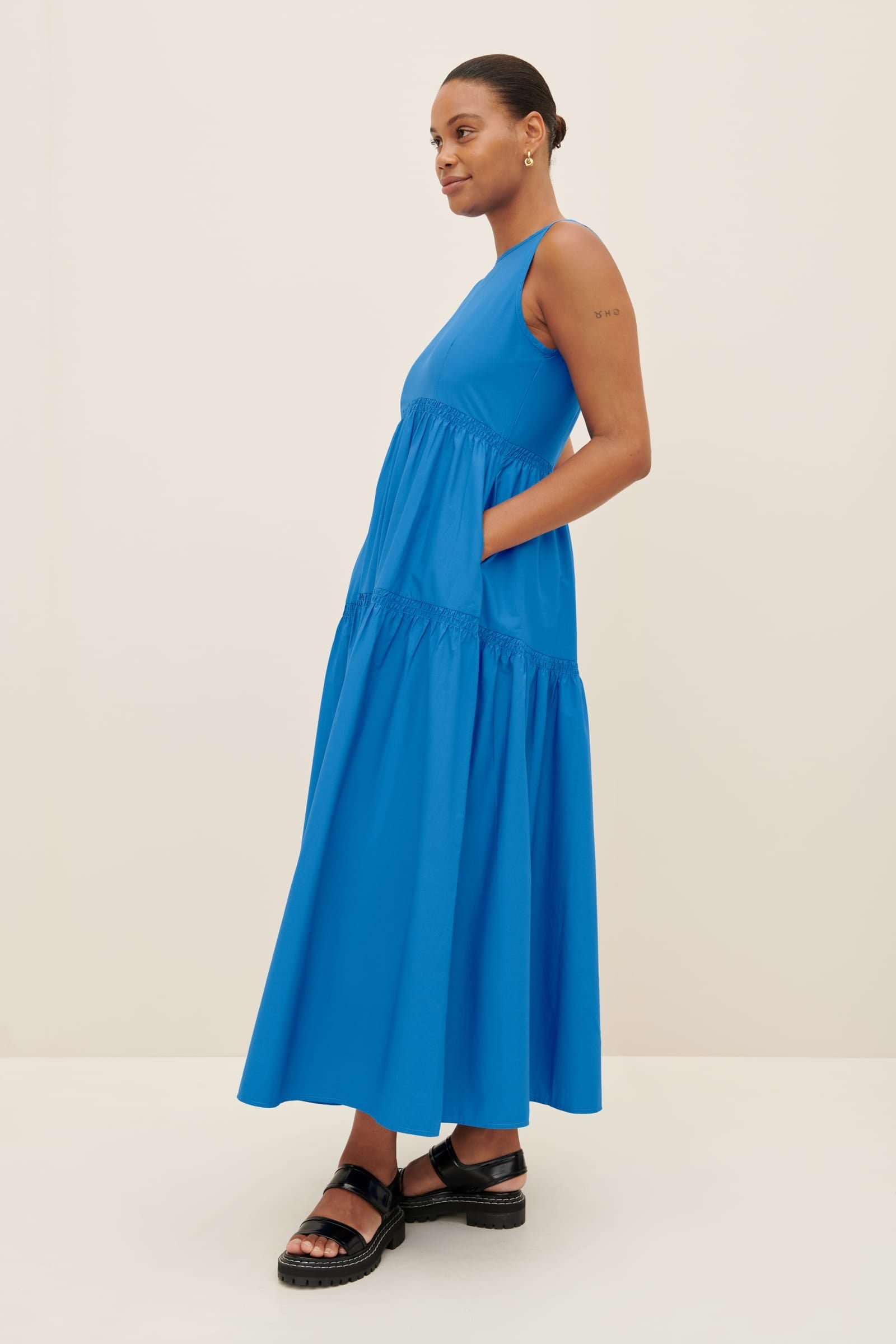 An effortless style in a standout blue hue inspired by the ocean, made from organic cotton poplin shirting. The Aurora Dress has a standard fit with a structured bodice that fastens through the back with Agoya shell buttons. The floaty, full-length skirt features gathered tiers detailed with two rows of top-stitching.
