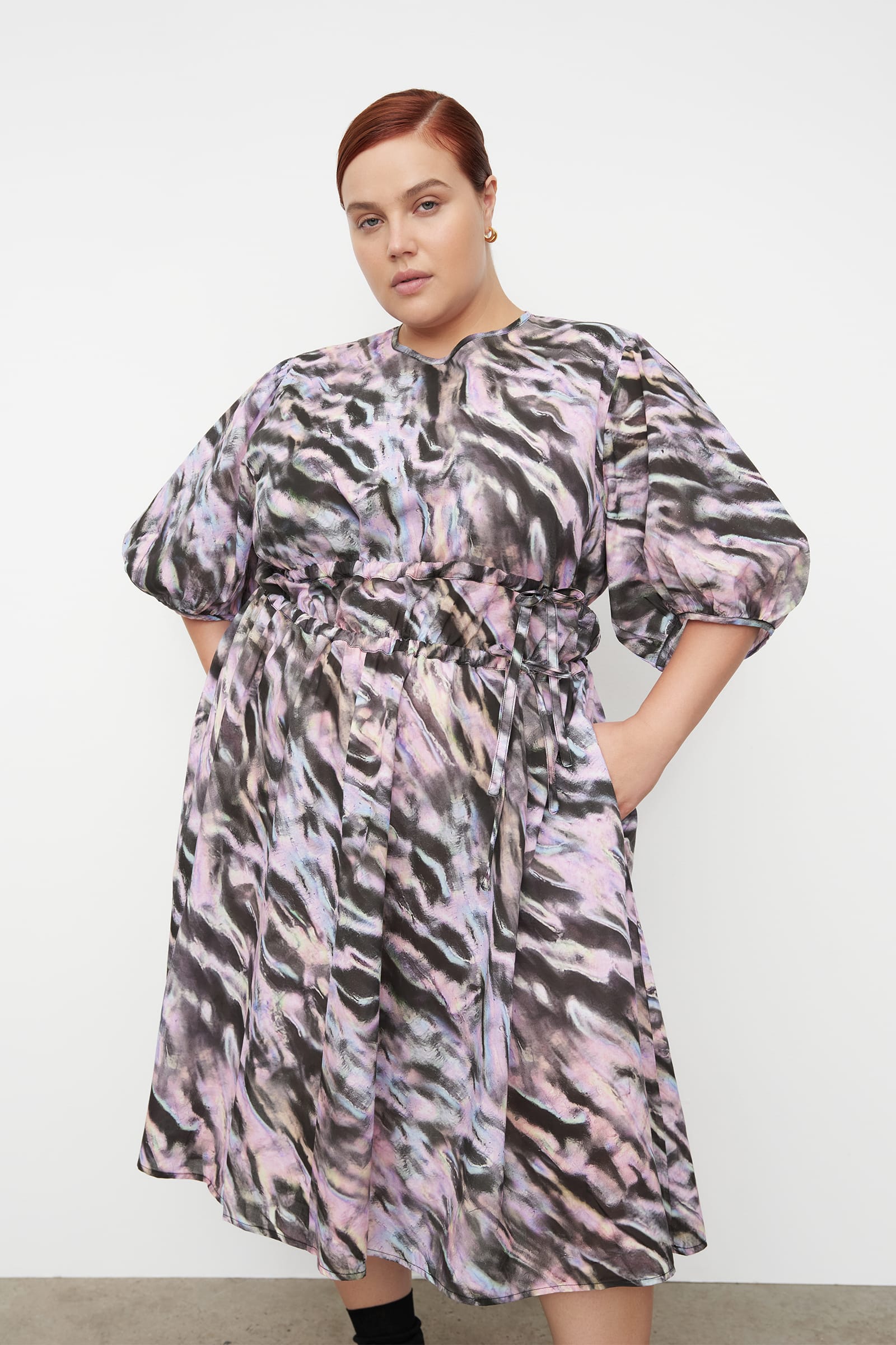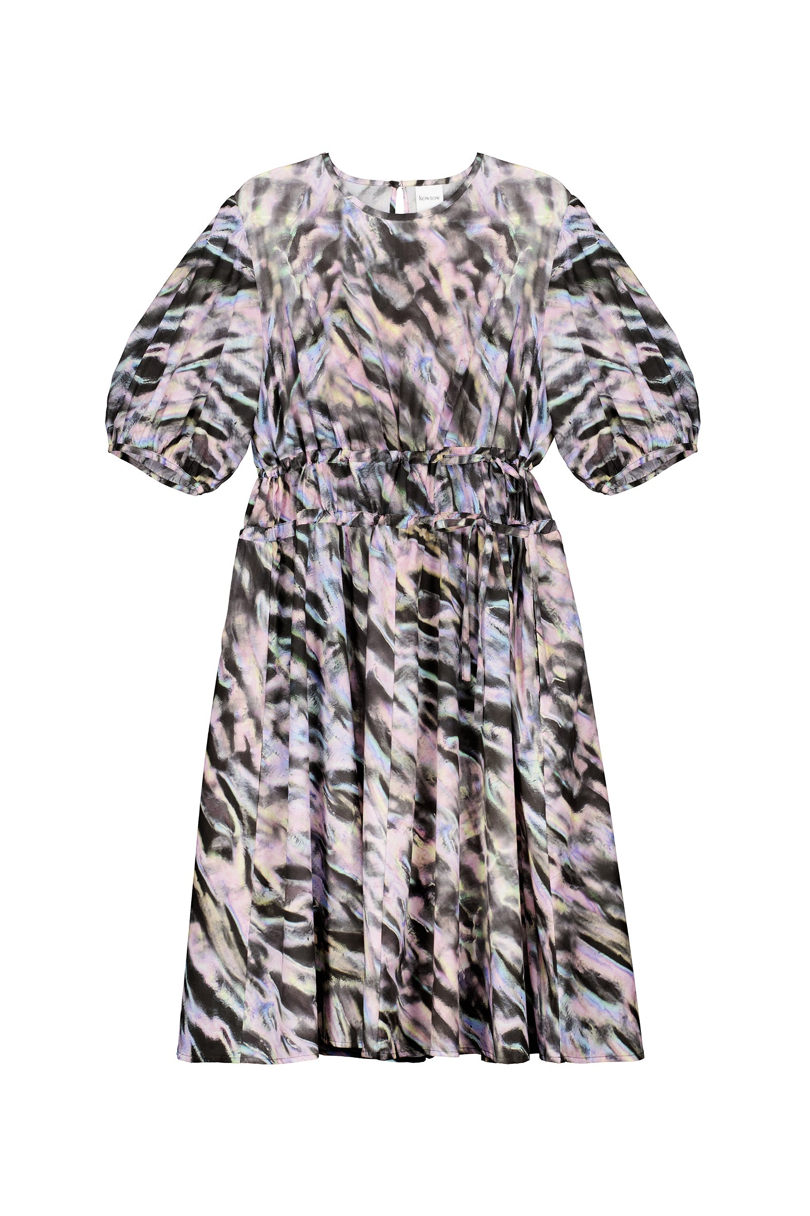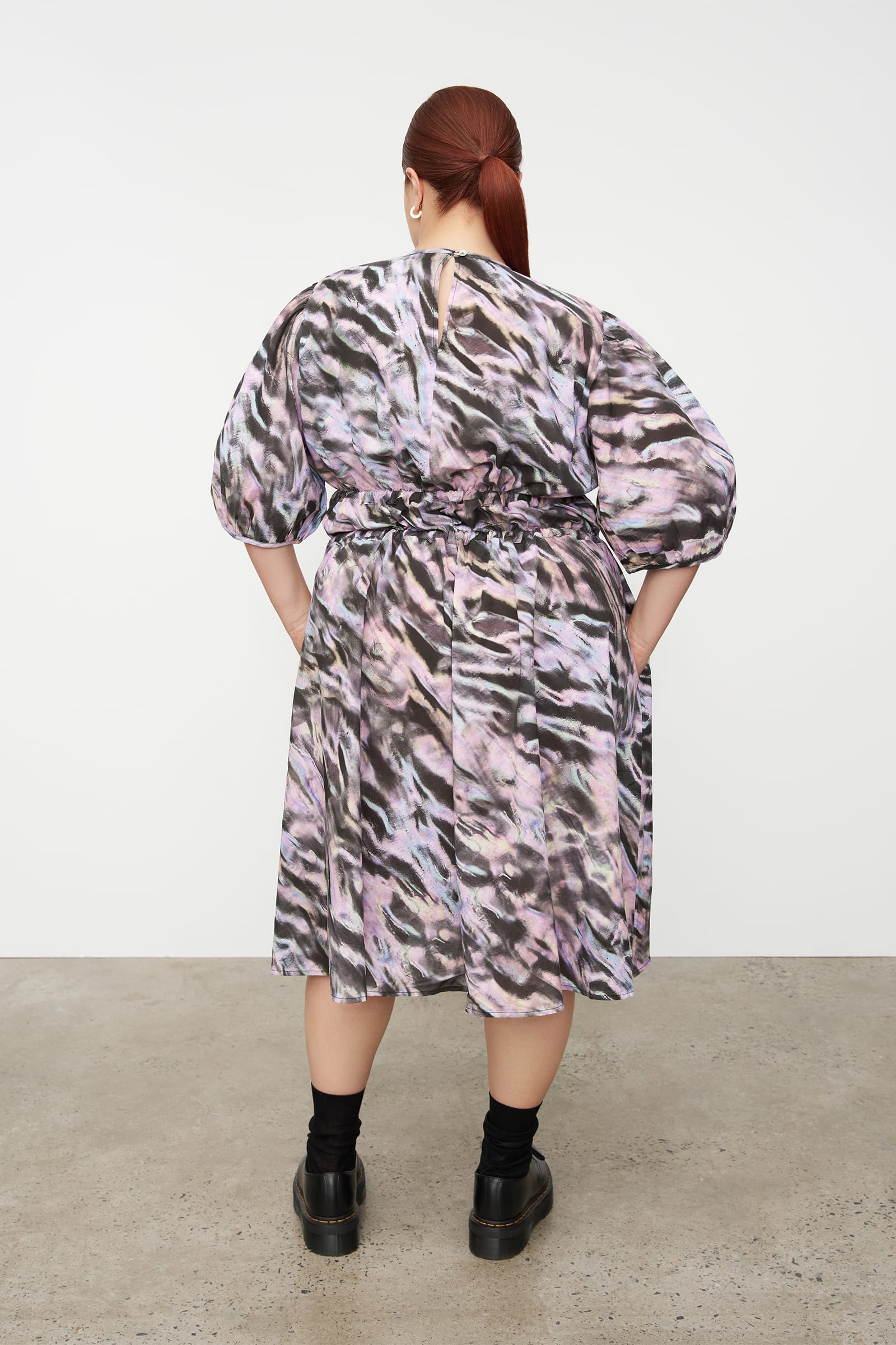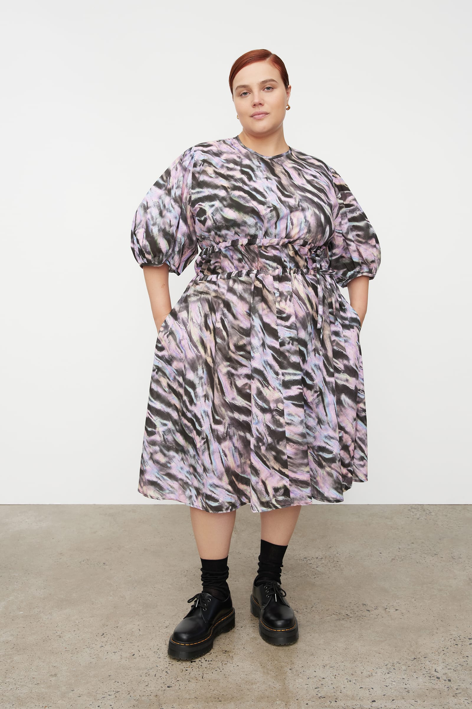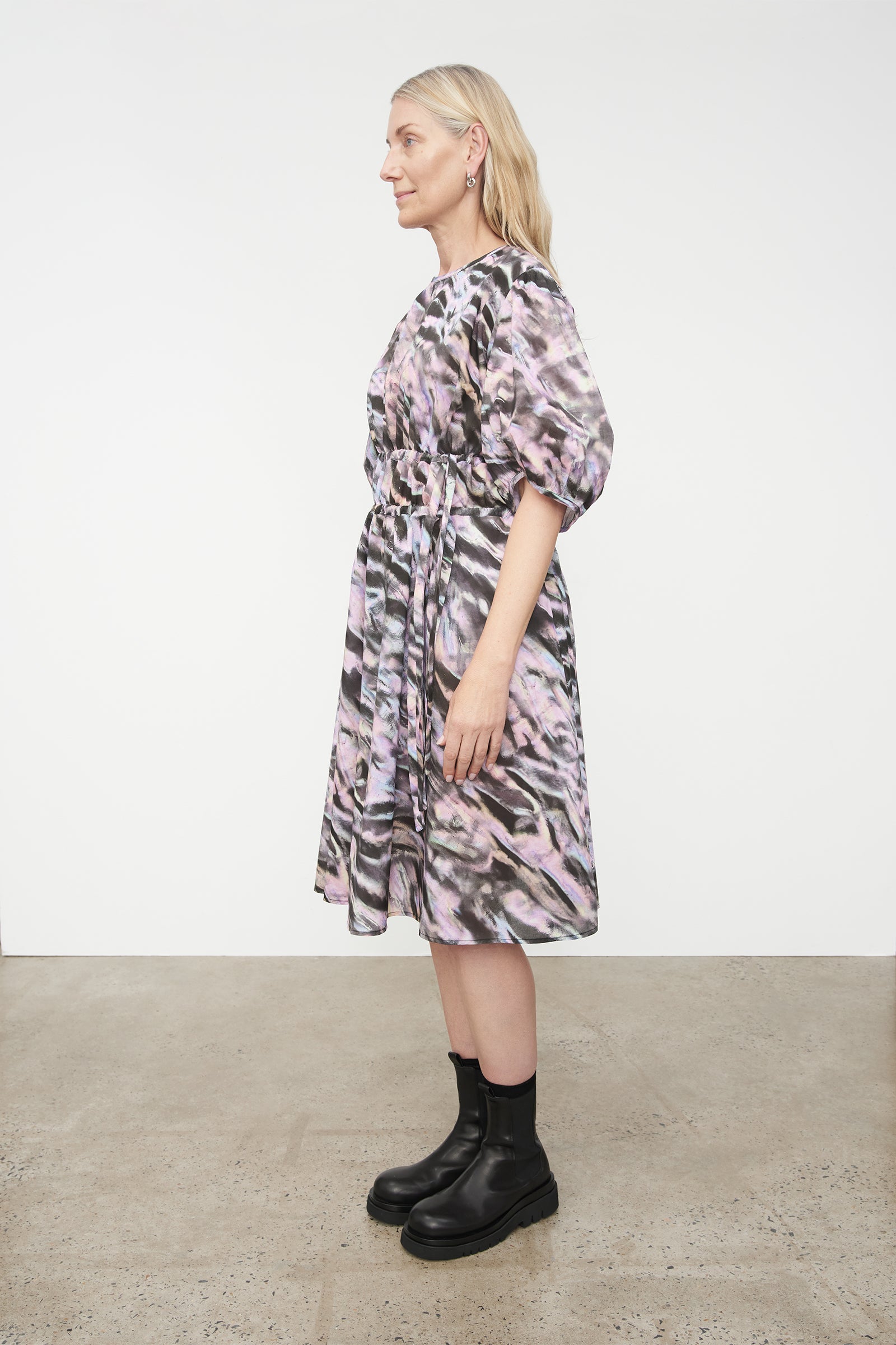 A statement dress, made from 100% certified Fairtrade lightweight organic cotton voile. The Celeste Dress has a relaxed fit and falls to knee length. It has a fitted shoulder and short balloon sleeves, and features a double drawcord waist detail for texture and customisable wear. Fastens at the back with an agoya shell button. Digitally printed with our in-house designed Iridescent print, inspired by bioluminescence in our oceans and light shifting our perception of colour.