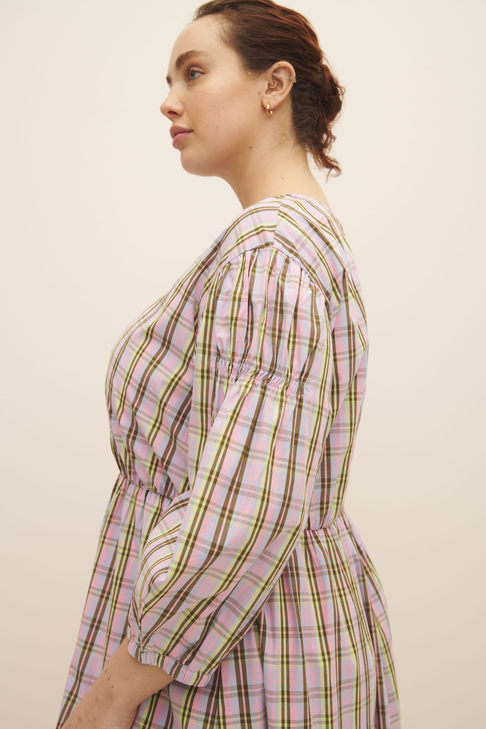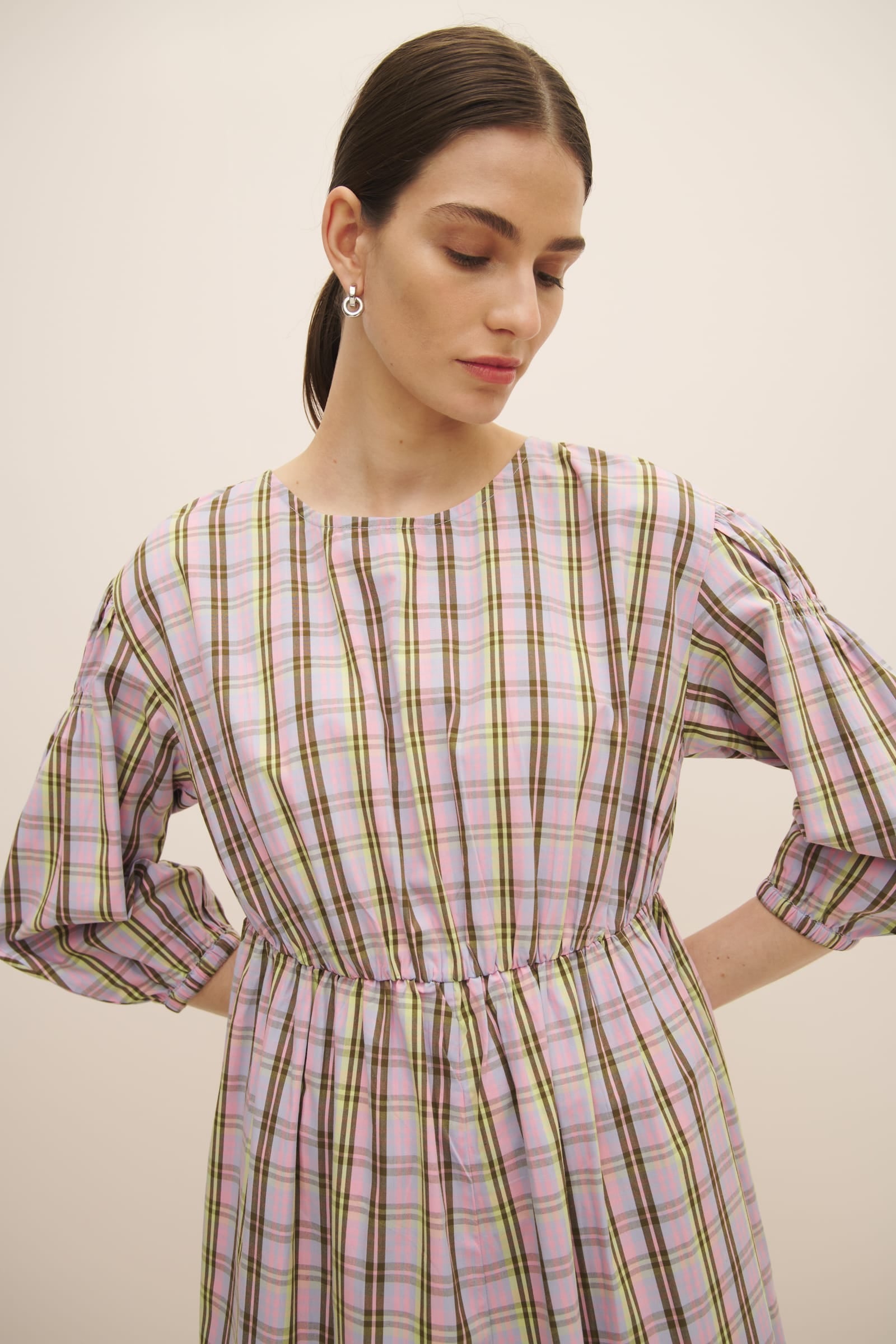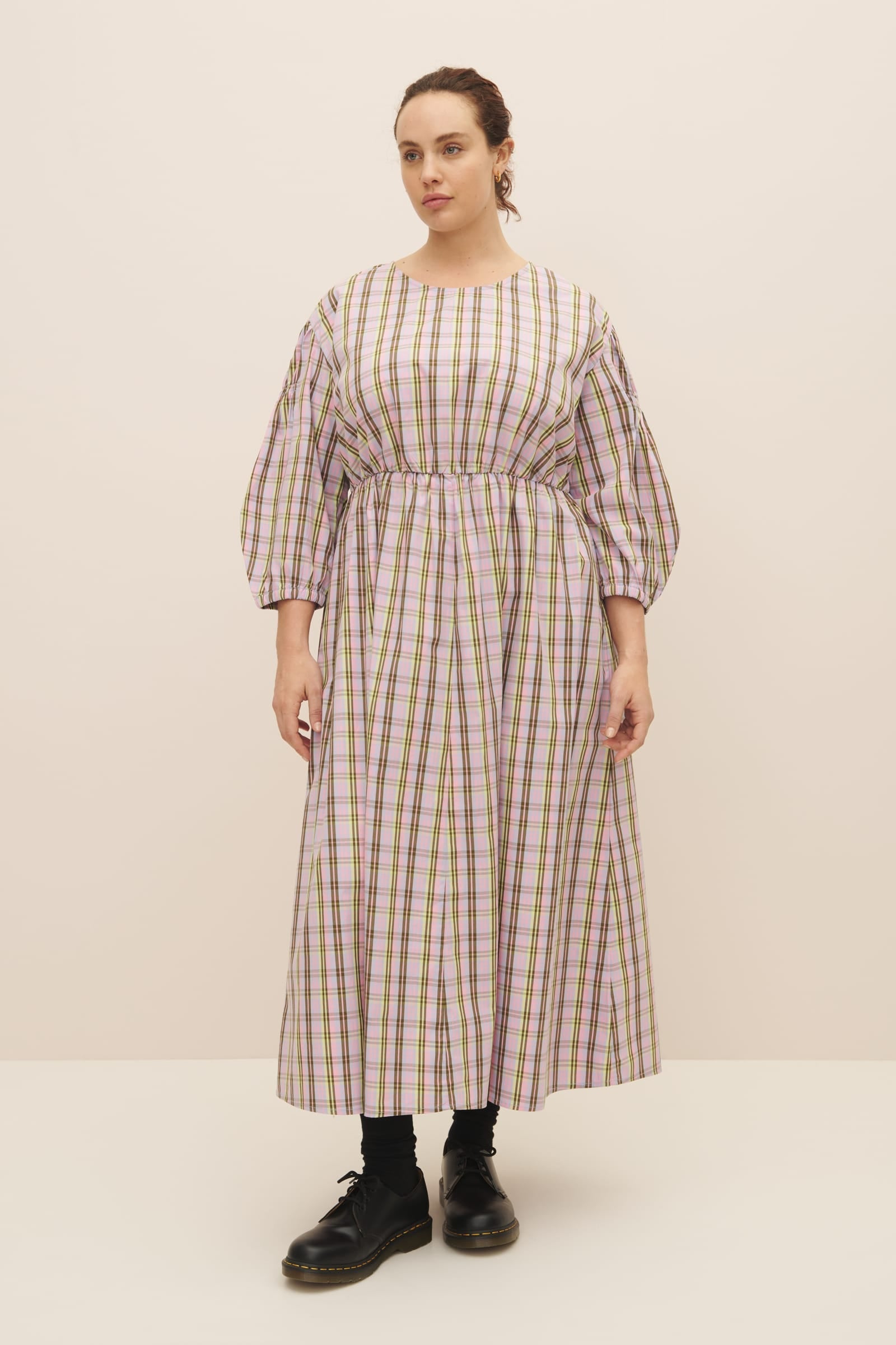 A statement dress, made from 100% certified Fairtrade organic cotton poplin shirting in a joyful woven check. The Melody Dress is defined by sculptural sleeves that feature a gathered elastic detail towards the shoulder. It has a standard fit with an elasticated waist, and fastens at the back with an agoya shell button and loop.