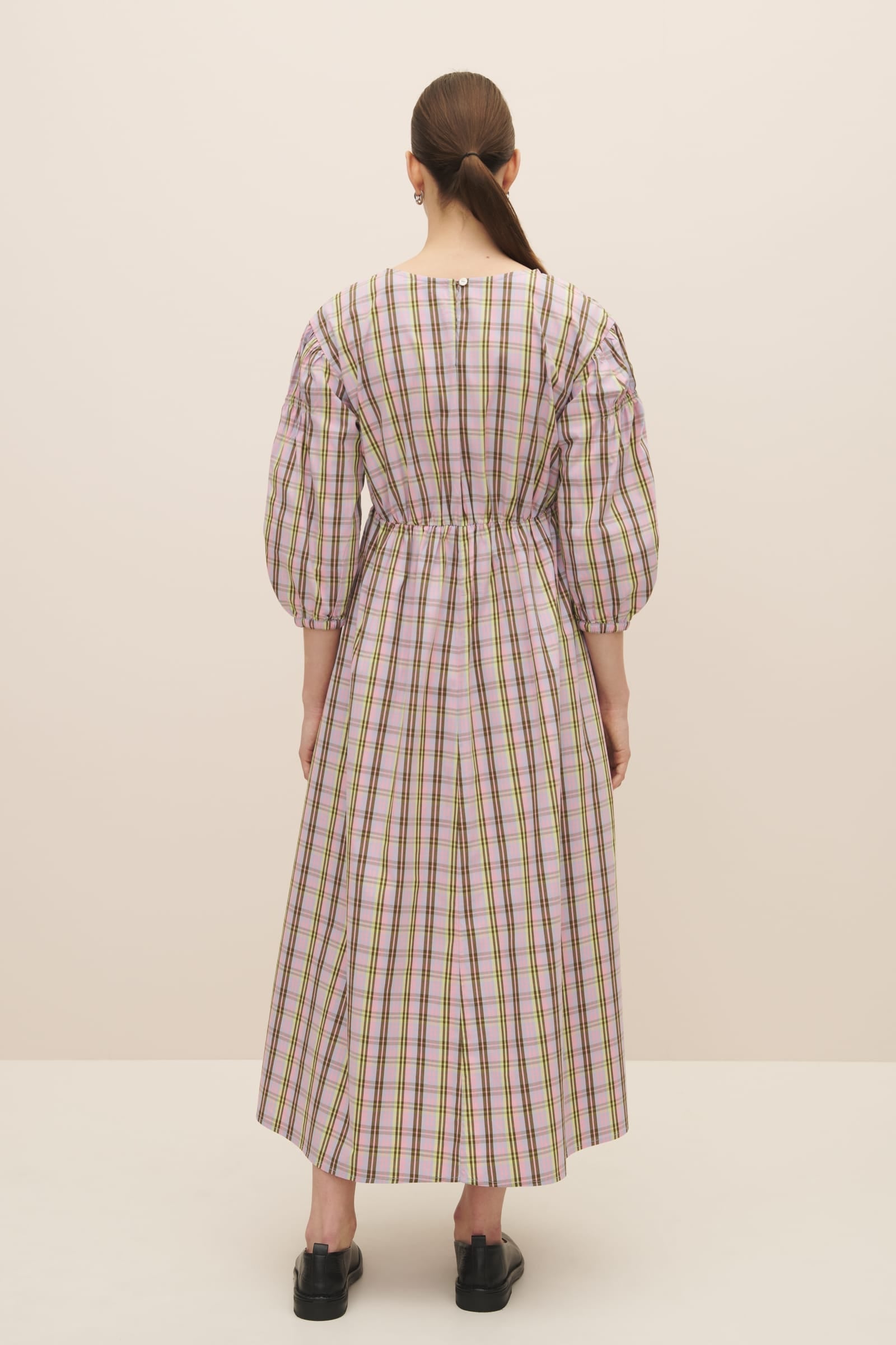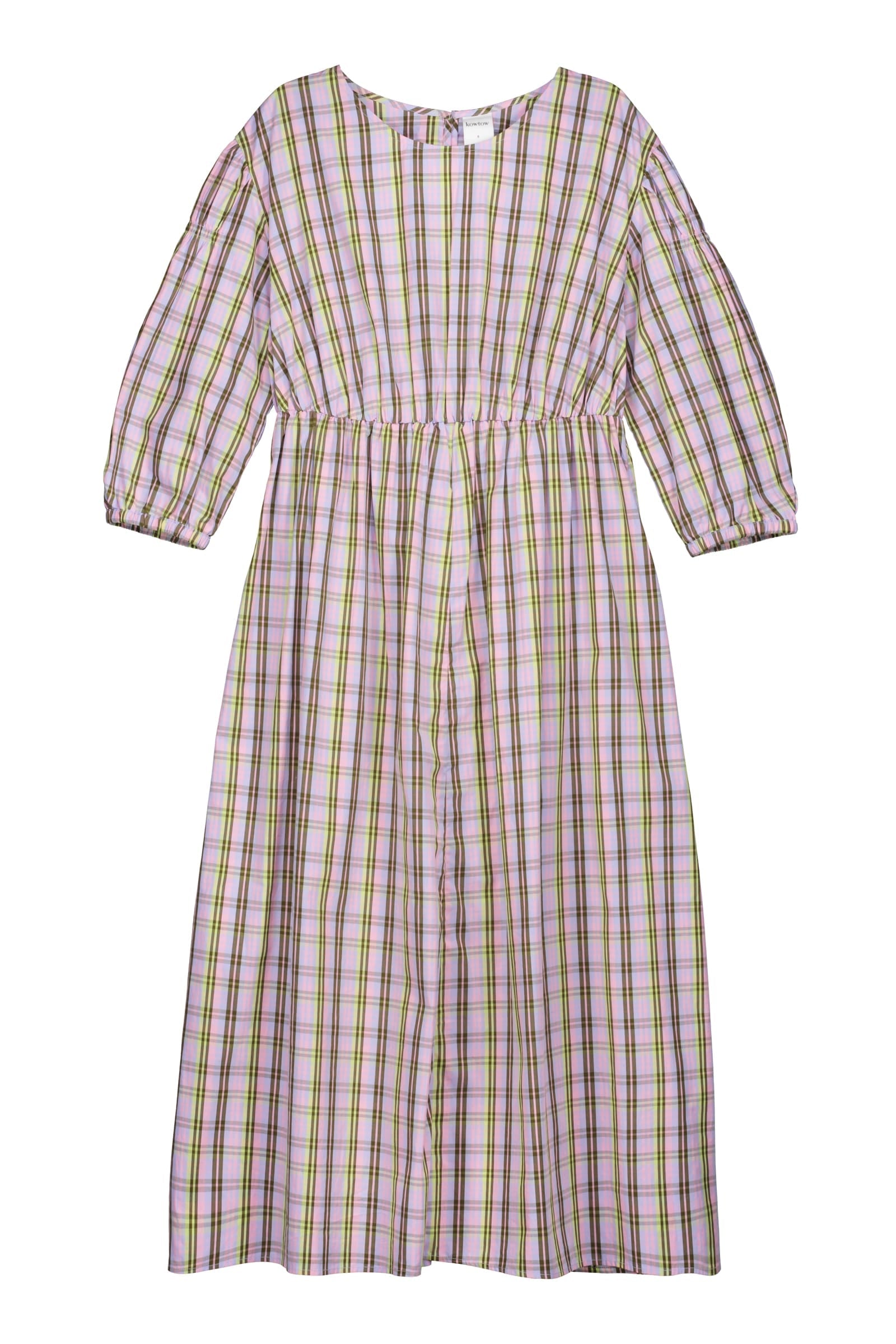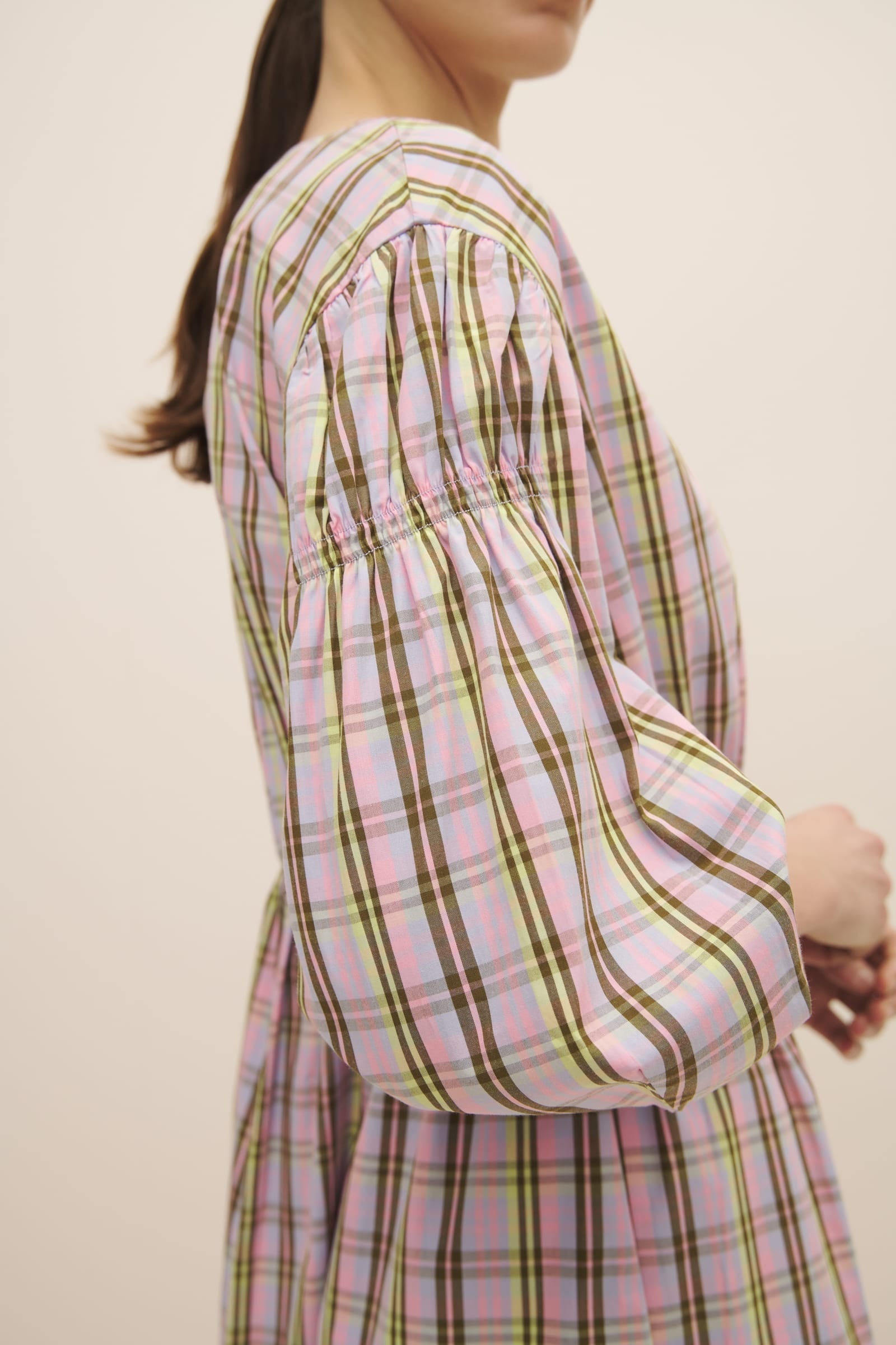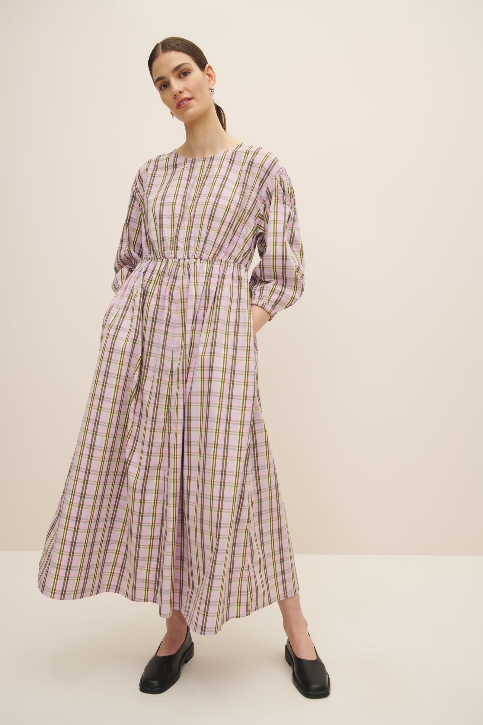 A statement dress, made from 100% certified Fairtrade organic cotton poplin shirting in a joyful woven check. The Melody Dress is defined by sculptural sleeves that feature a gathered elastic detail towards the shoulder. It has a standard fit with an elasticated waist, and fastens at the back with an agoya shell button and loop.