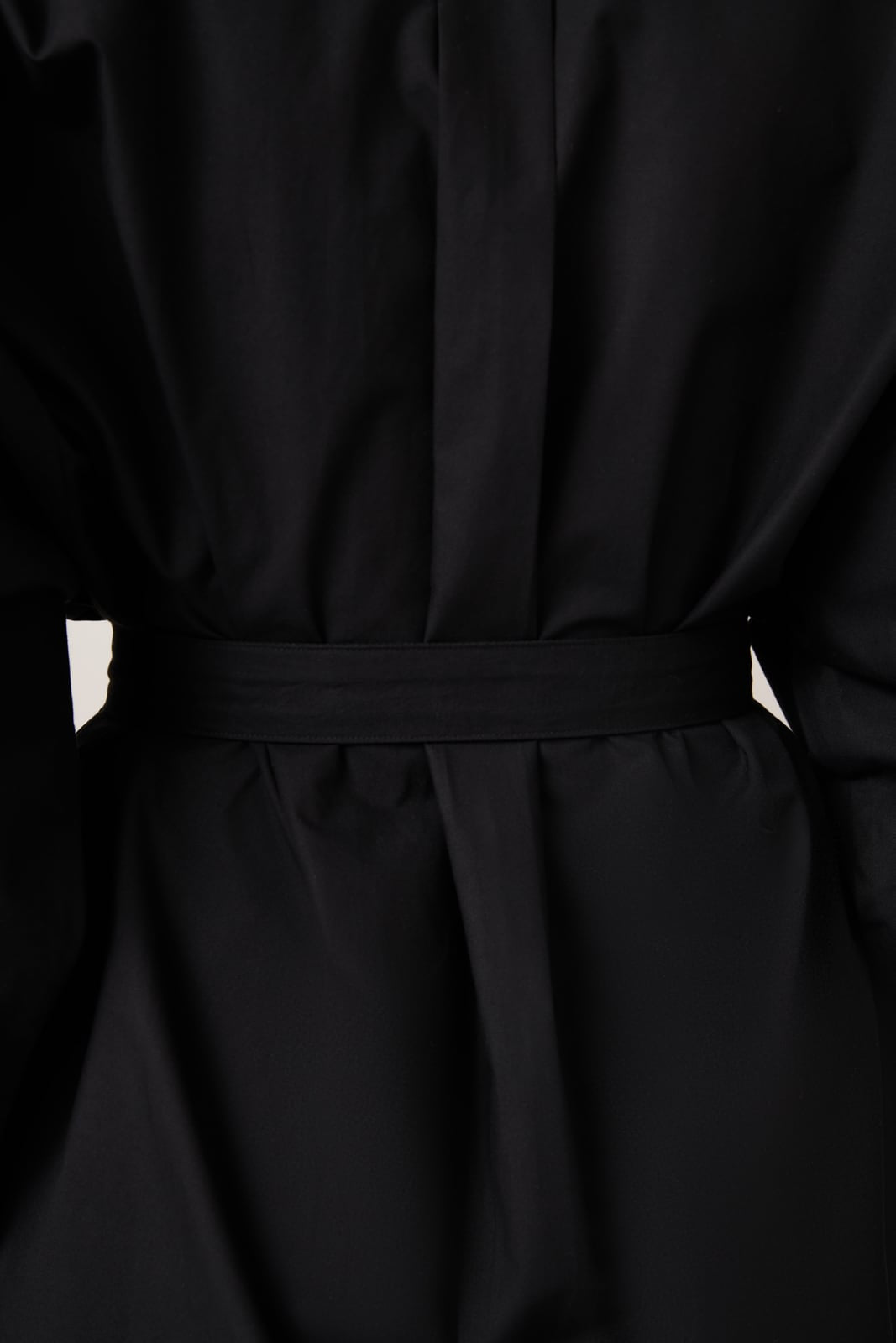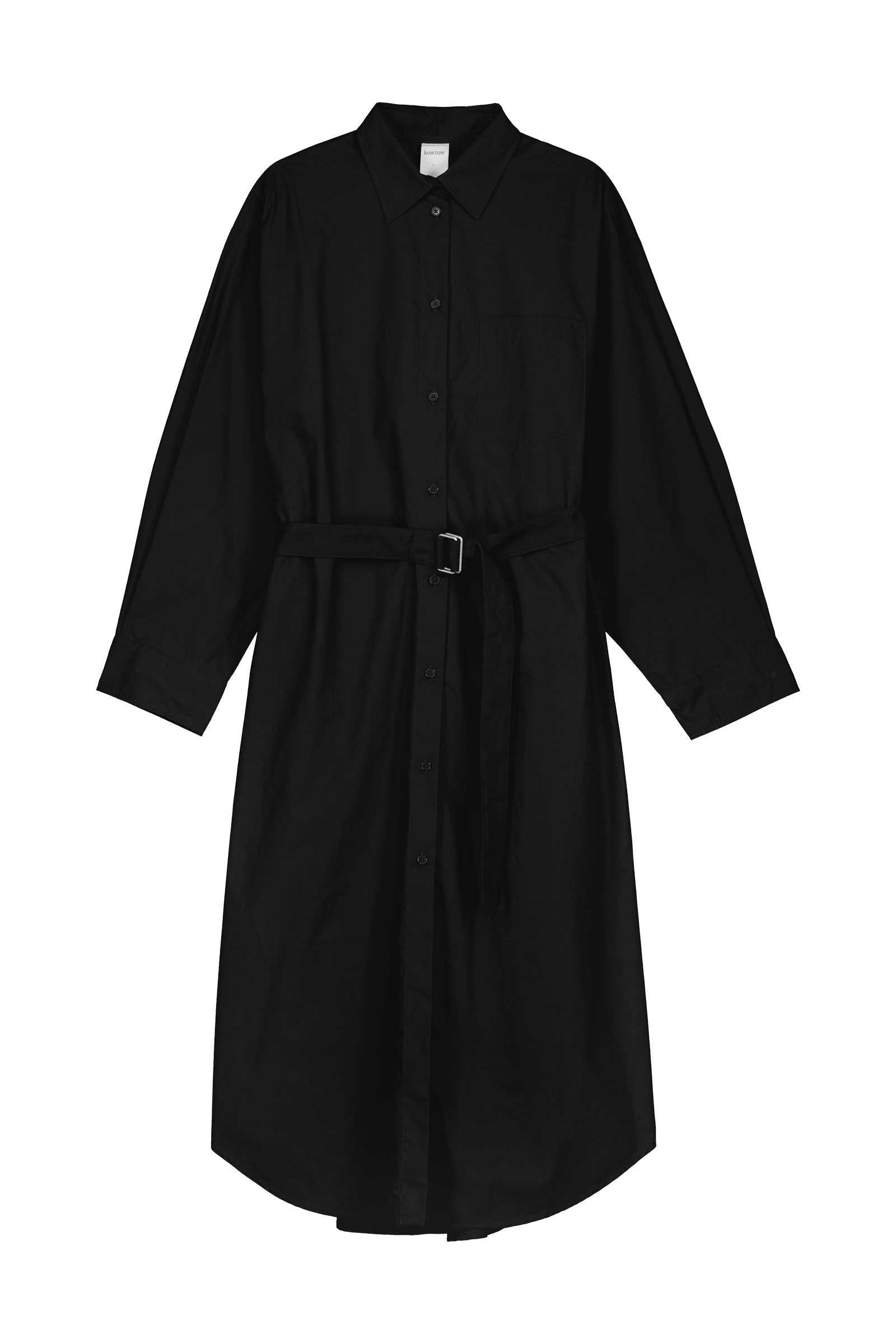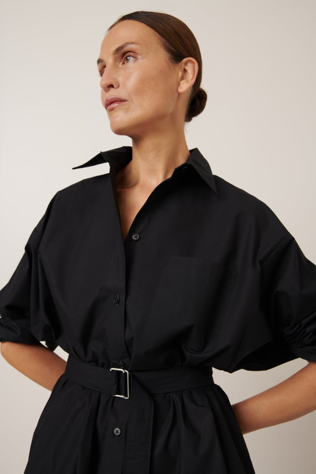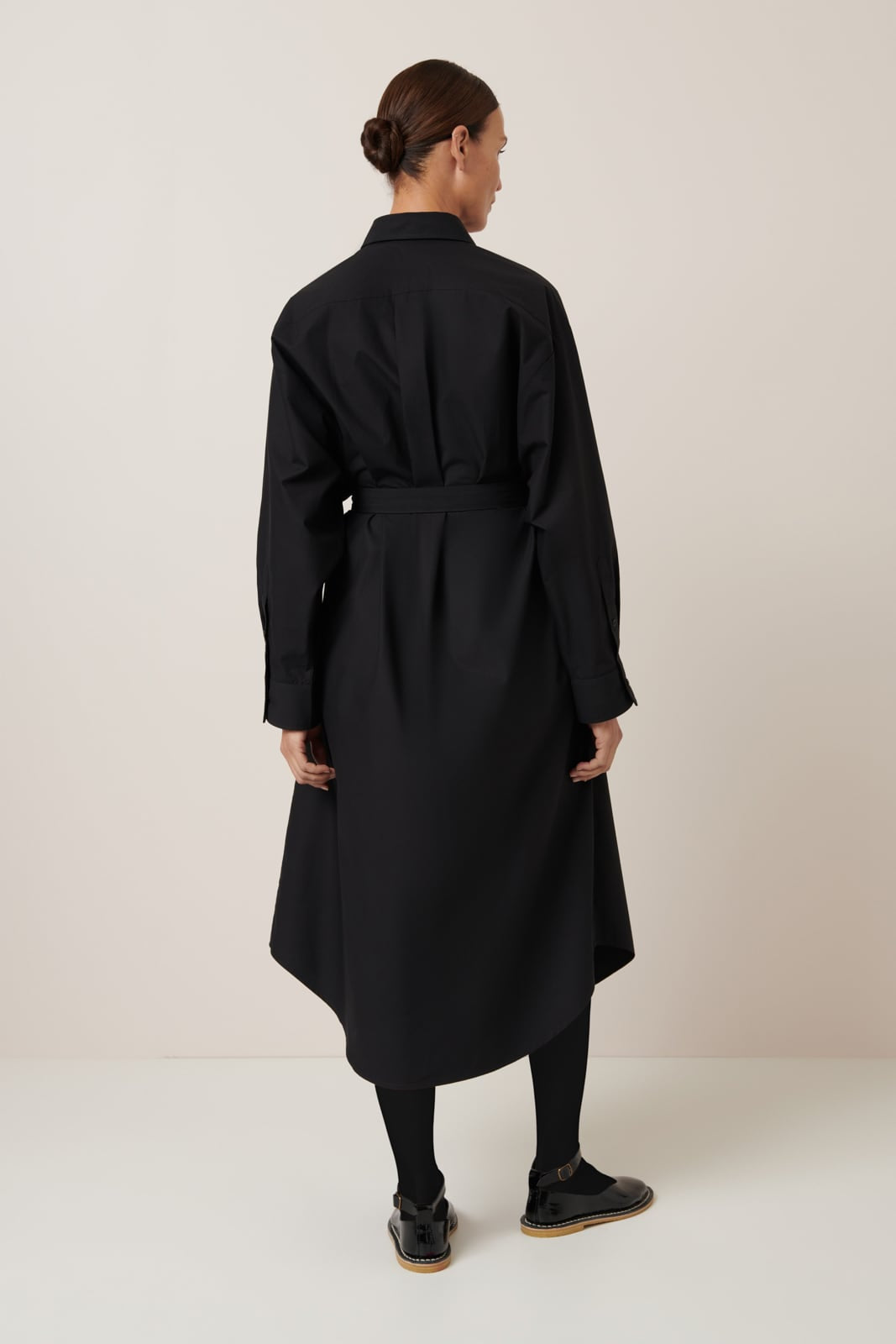 The Nova Dress is an ankle-length, oversized shirt dress that features a standard collar and a front placket finished with Tagua nut buttons. It has a drop shoulder and exaggerated batwing sleeve, it can be worn loose or cinched at the waist with the self-fabric tie. Made in organic cotton poplin.