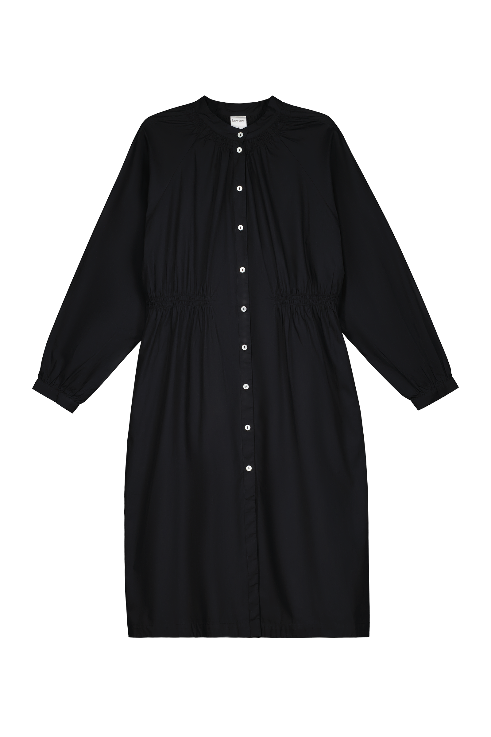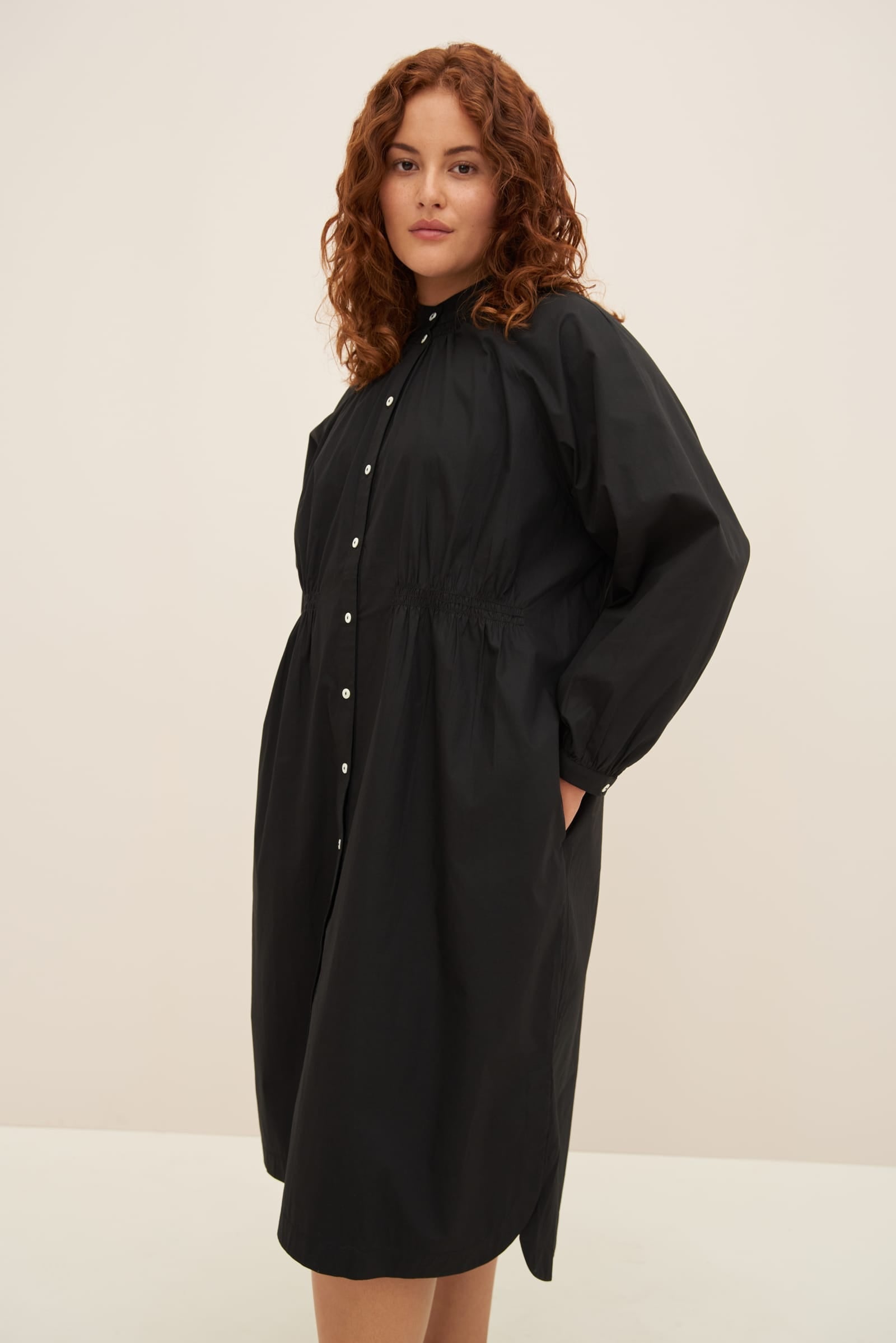 A relaxed shirt dress, made from organic cotton poplin. The Wander Dress is a below-the-knee style defined by gathers around the neckline and on either side of the waist for subtle shaping. It has a band collar and contrast Agoya shell buttons. Side splits and a rounded hem ensure ease of wear.