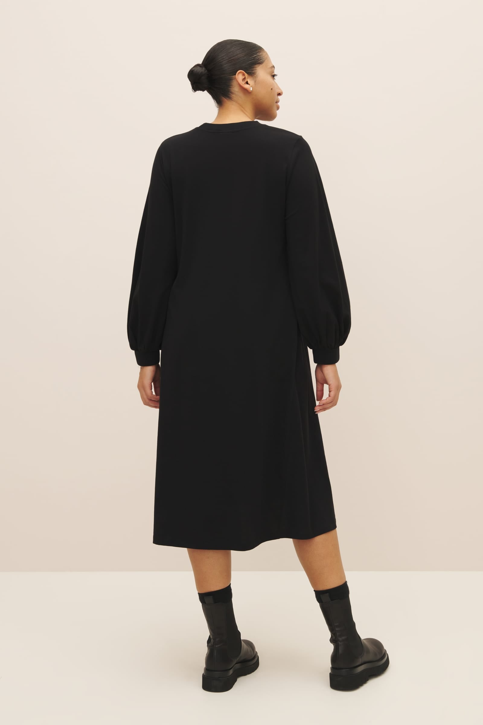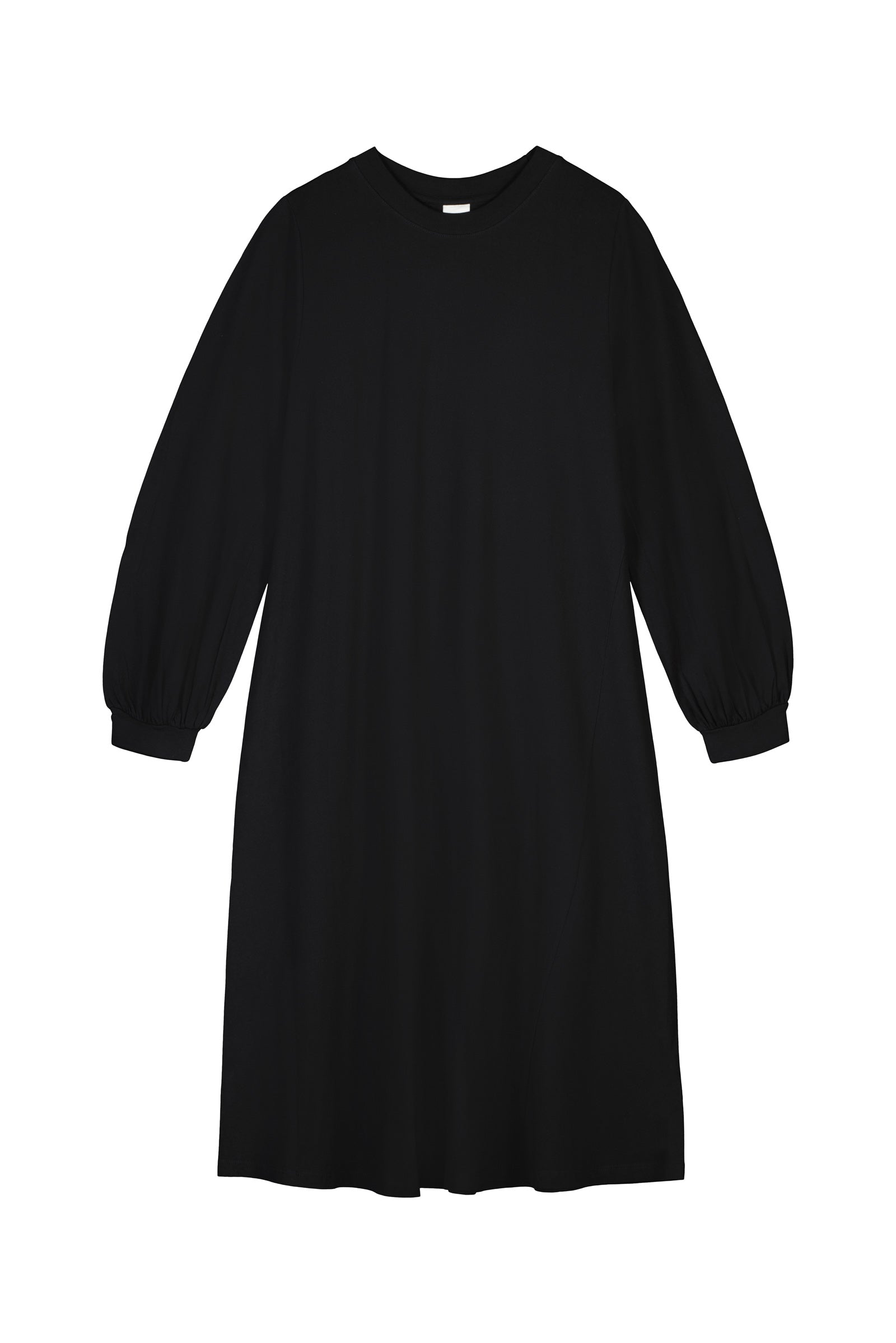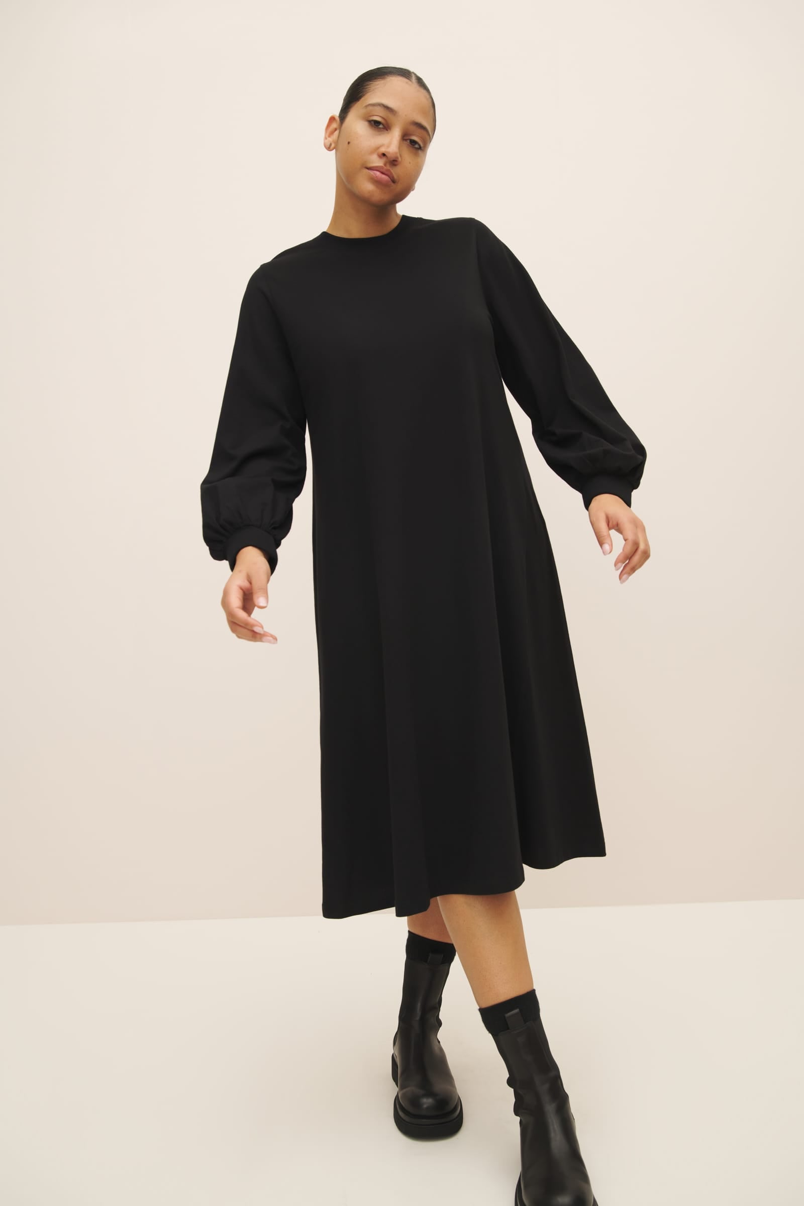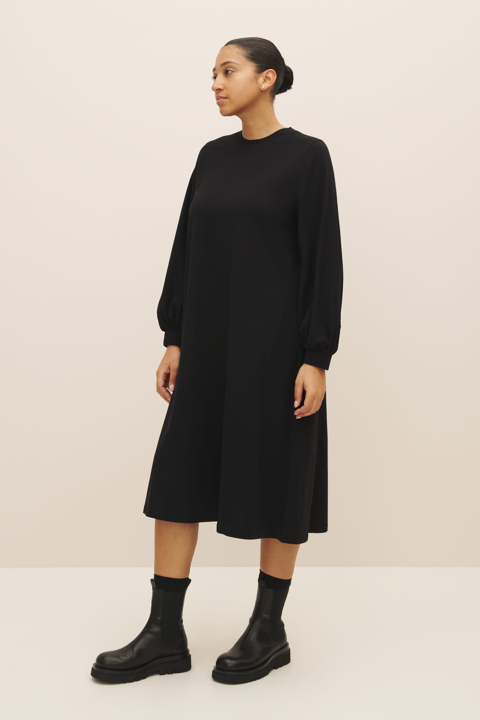 A full sleeve dress with a relaxed a-line shape, made from mid-weight organic cotton jersey. The dress is finished with a wide ribbed neckline and cuffs and features our signature twisted side seams.