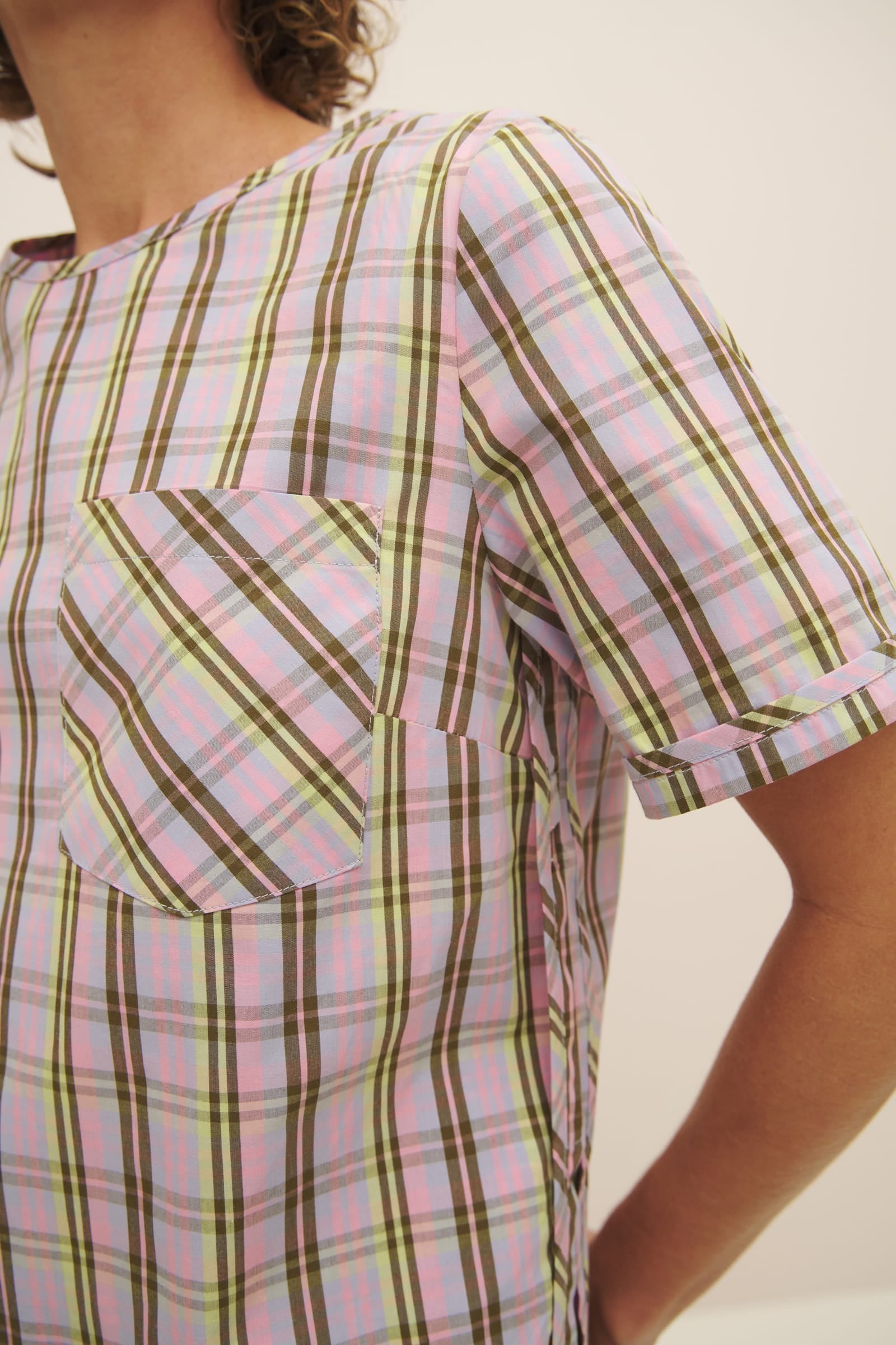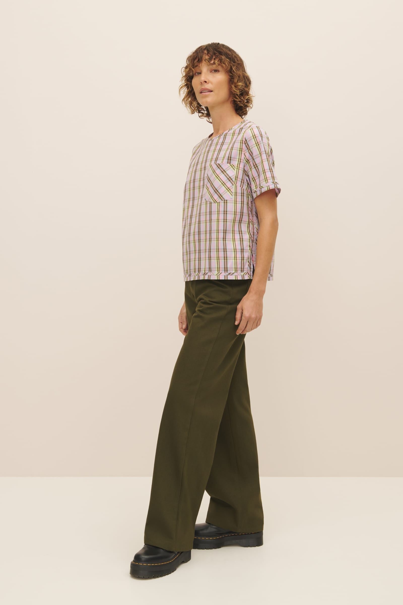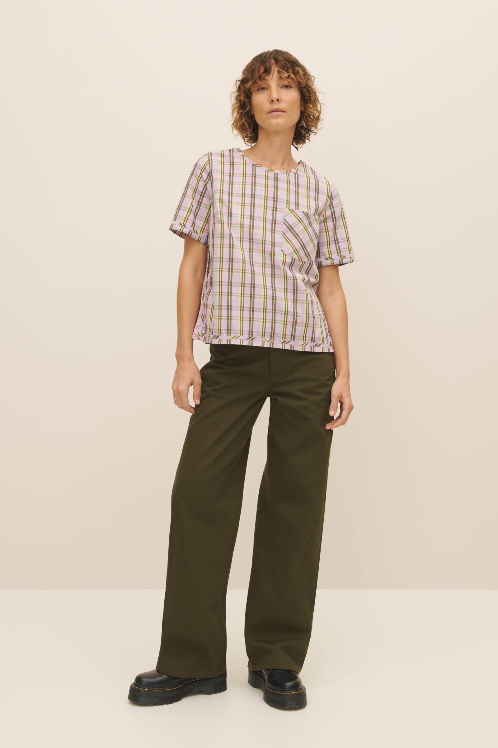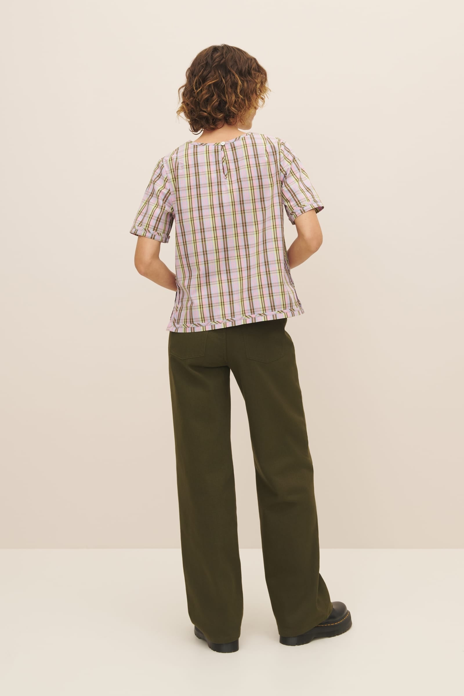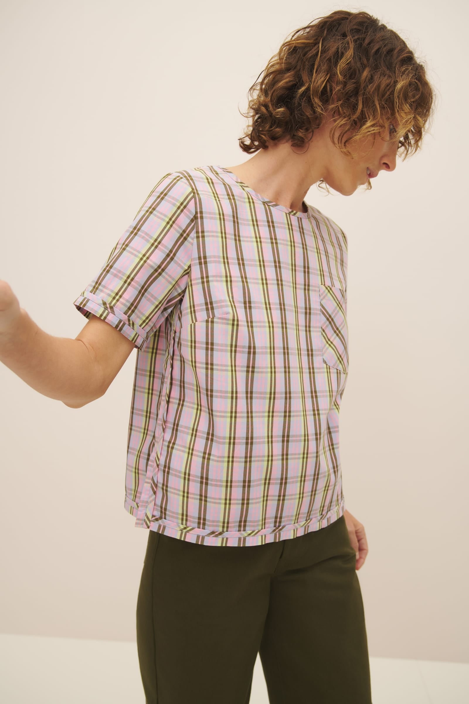 An elevated everyday top, made from 100% certified Fairtrade organic cotton poplin shirting in a joyful woven check. The Adrian Top has a standard fit with bust darts for gentle shaping and side splits for ease of wear. It features a binding detail at the cuffs and hem, and fastens with a button and loop at the back.