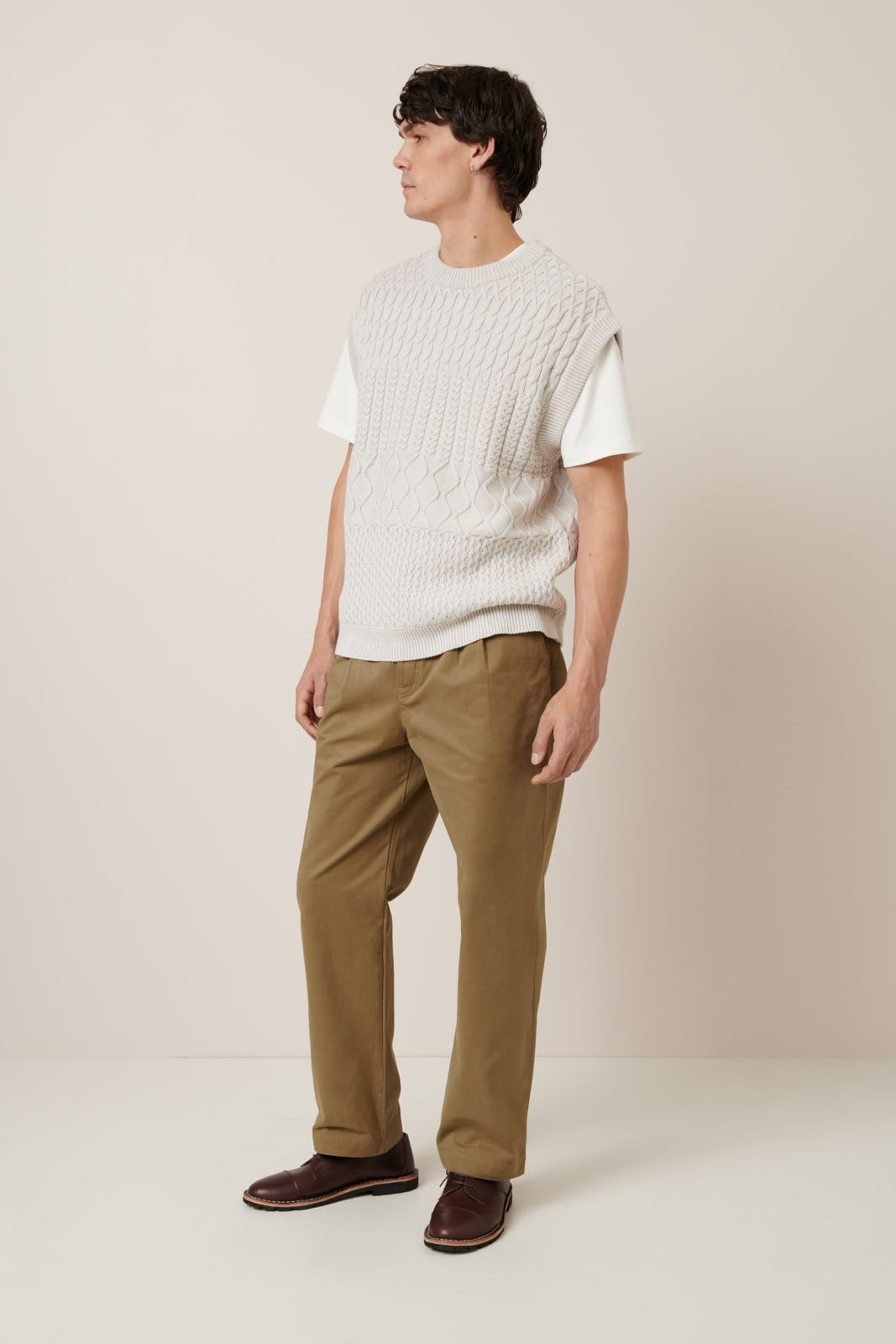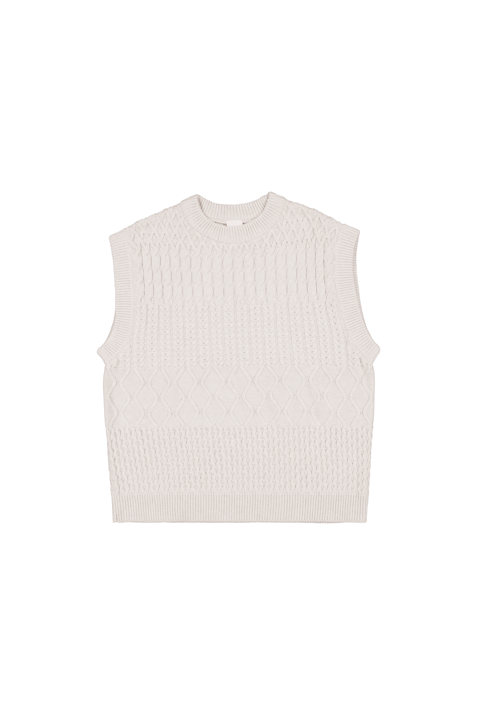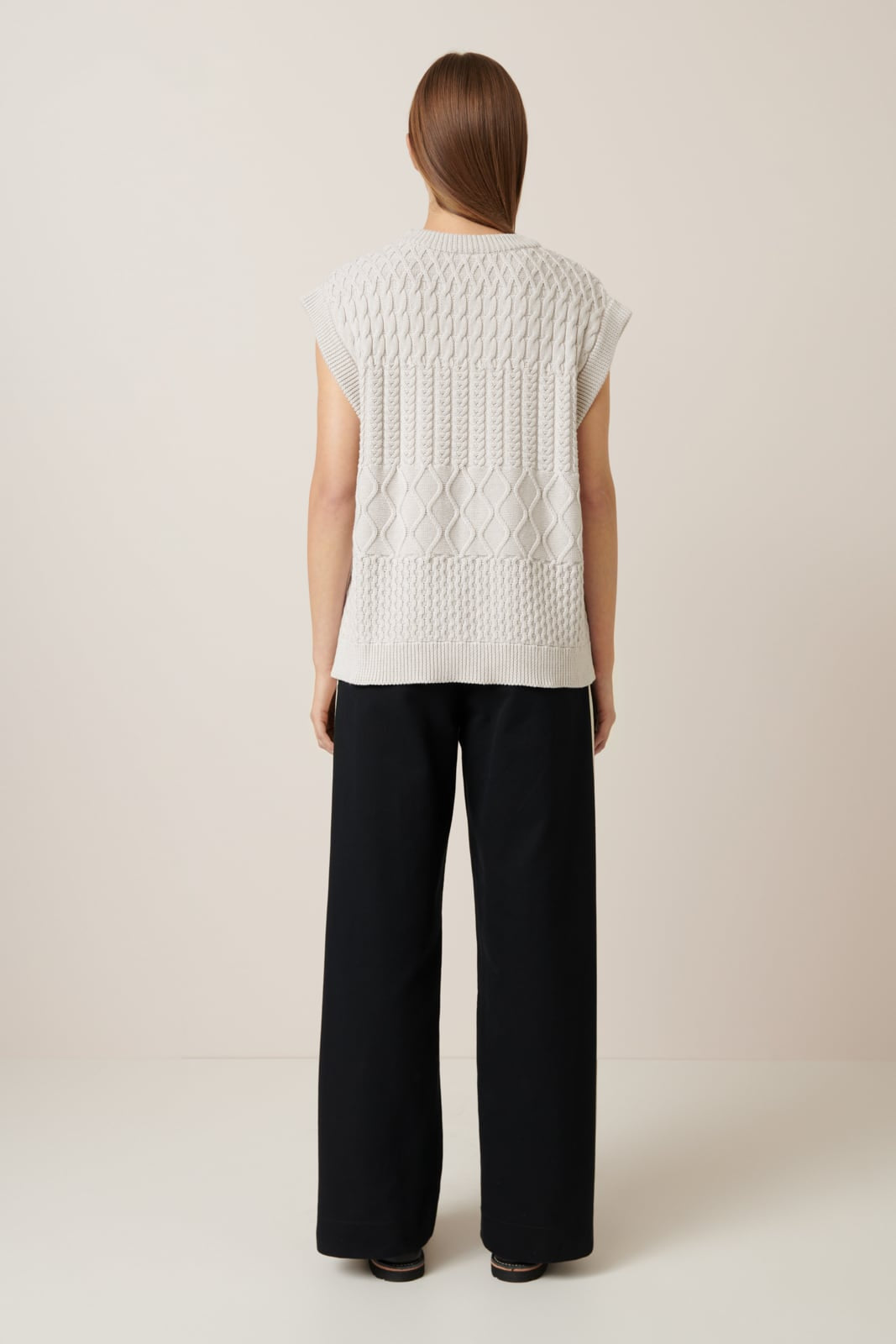 A playful patchwork of traditional cable techniques, the Aran Vest is a versatile piece designed to be layered. A relaxed, boxy fit vest knit in a soft organic cotton. Low cut armhole makes it the perfect layering piece, wear over your favourite shirt or tee.
