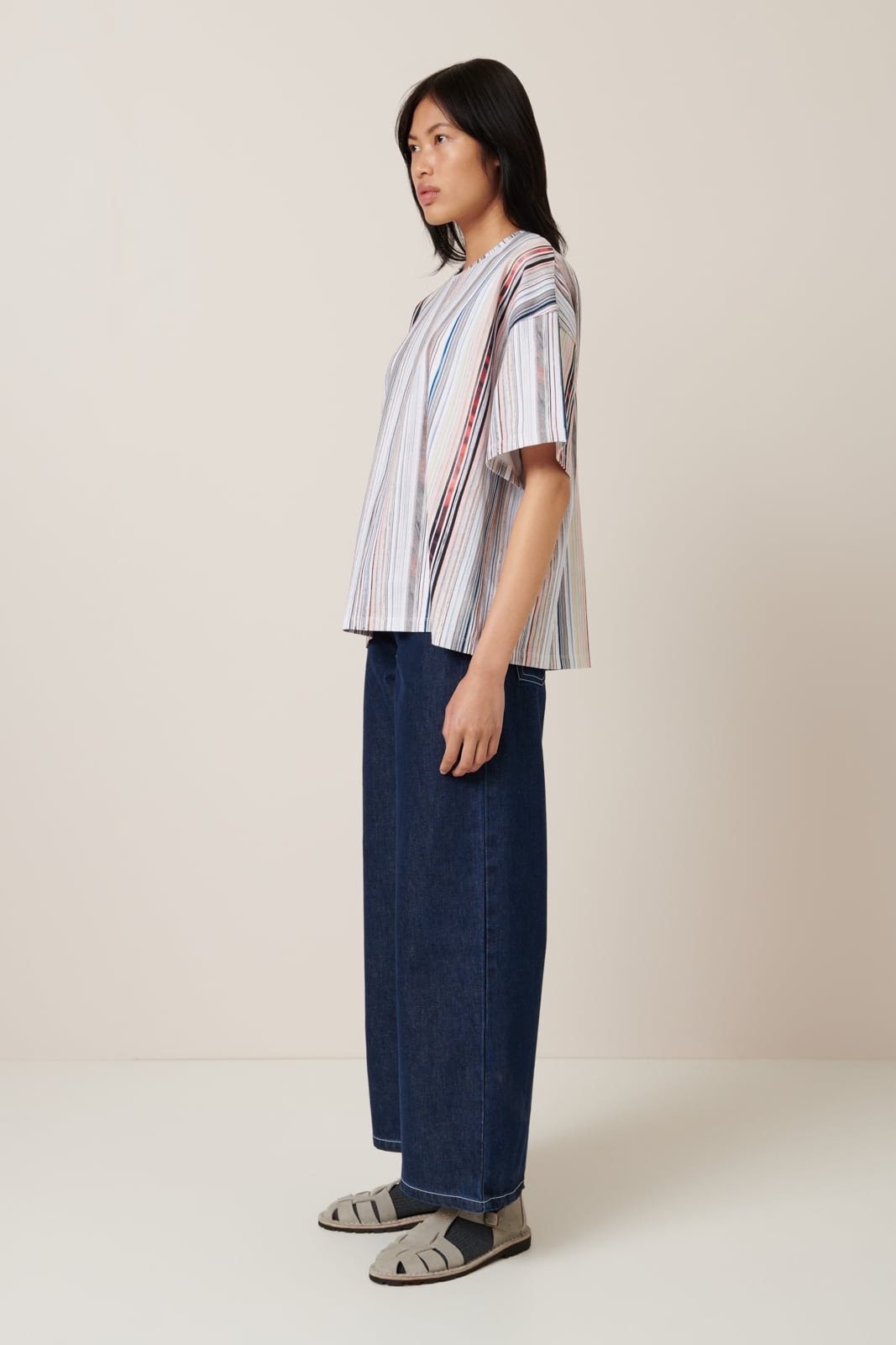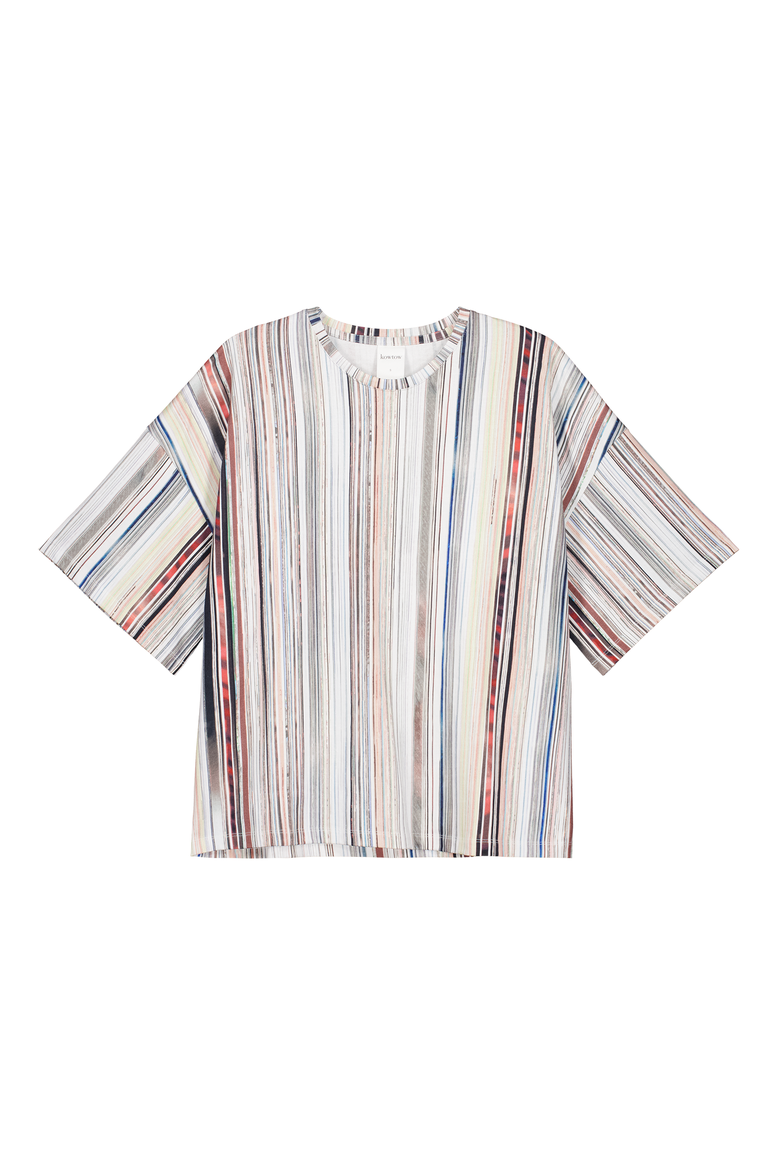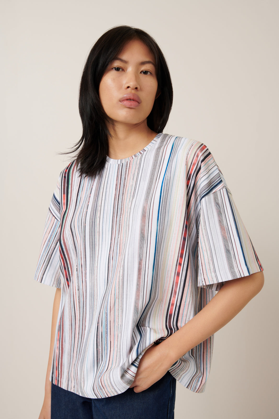 This short sleeve tee with a very oversized fit, finished with a classic ribbed crew neck. A digitally printed version of our best-selling Oversized Boxy Tee in our signature Library Stripe print made from heavyweight organic cotton jersey.