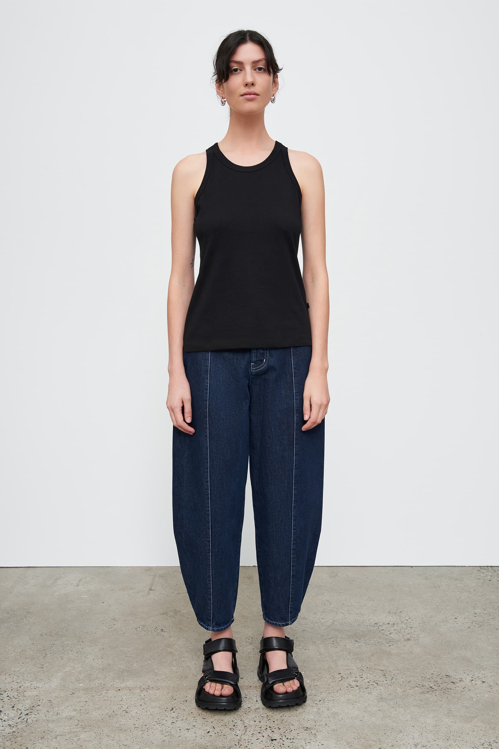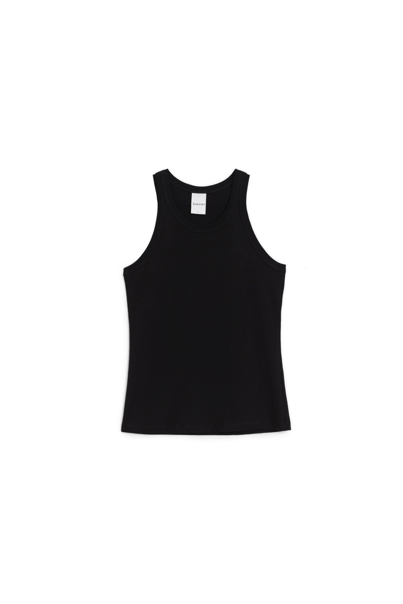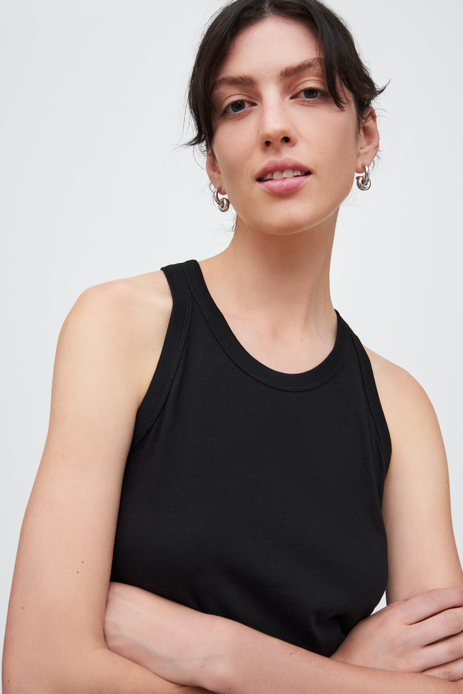 A fitted singlet with a racer back and ribbed binding around neck and armholes, made from mid-weight organic cotton jersey.