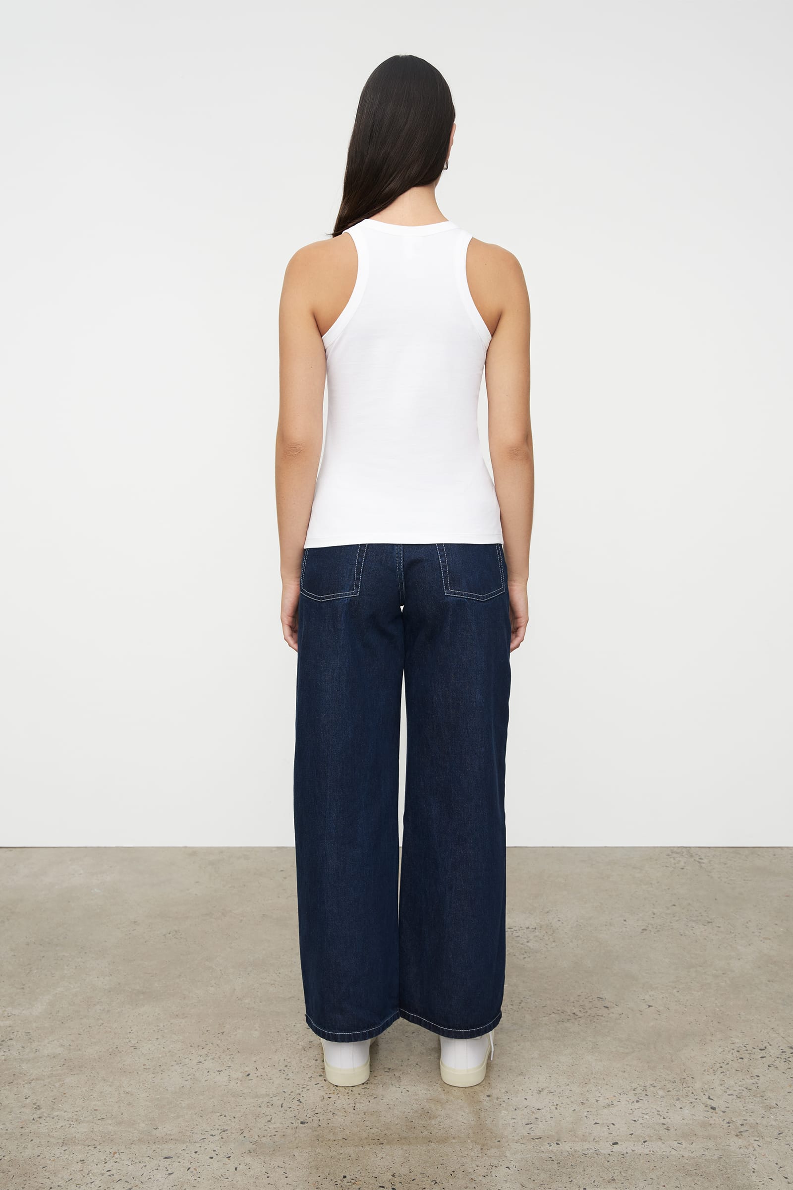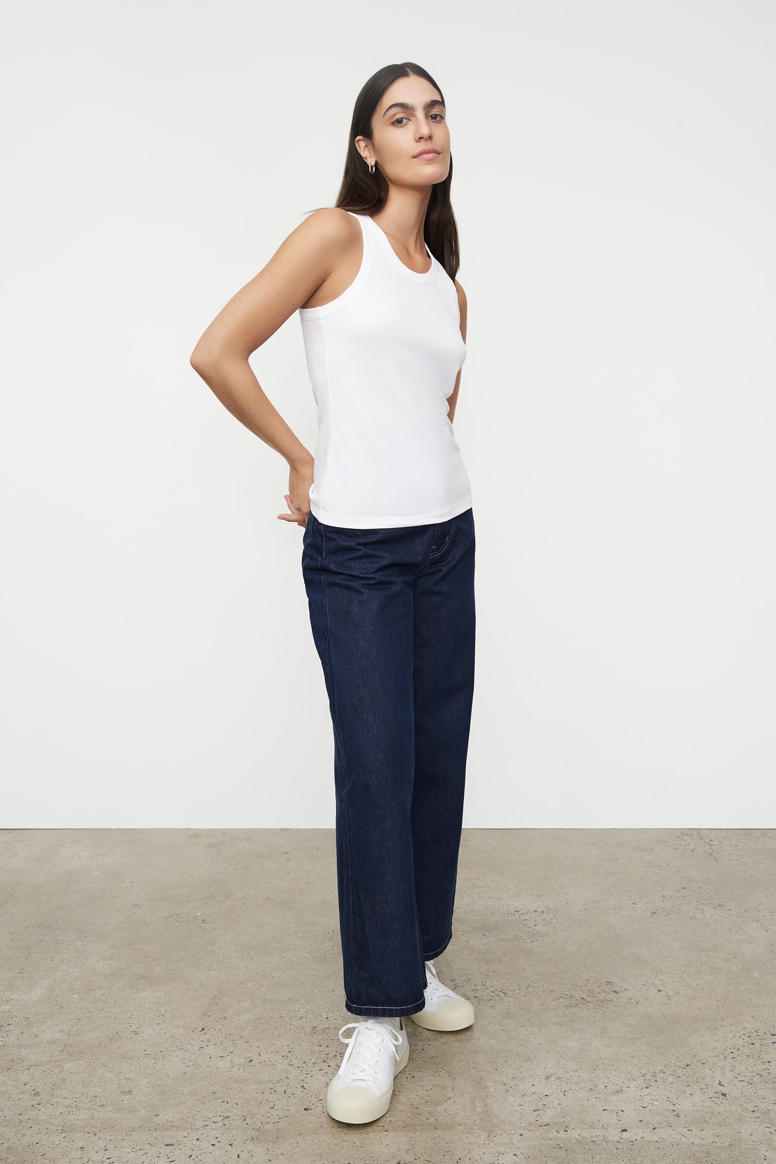 A fitted singlet with a racer back and ribbed binding around neck and armholes, made from 100% certified Fairtrade mid-weight organic cotton jersey.
