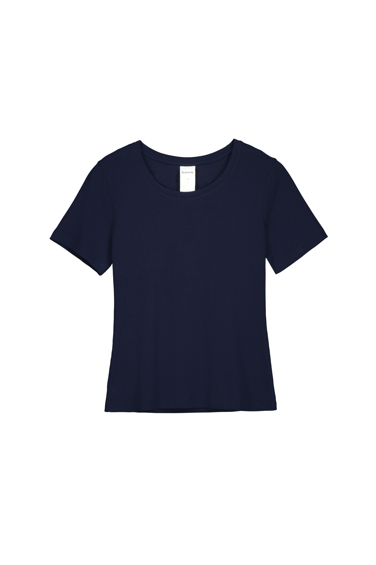 The Sphere Tee is a classic, close fit style with a scoop neckline and neat short sleeve. A timeless tee for your modular wardrobe, made from ribbed organic cotton jersey.
