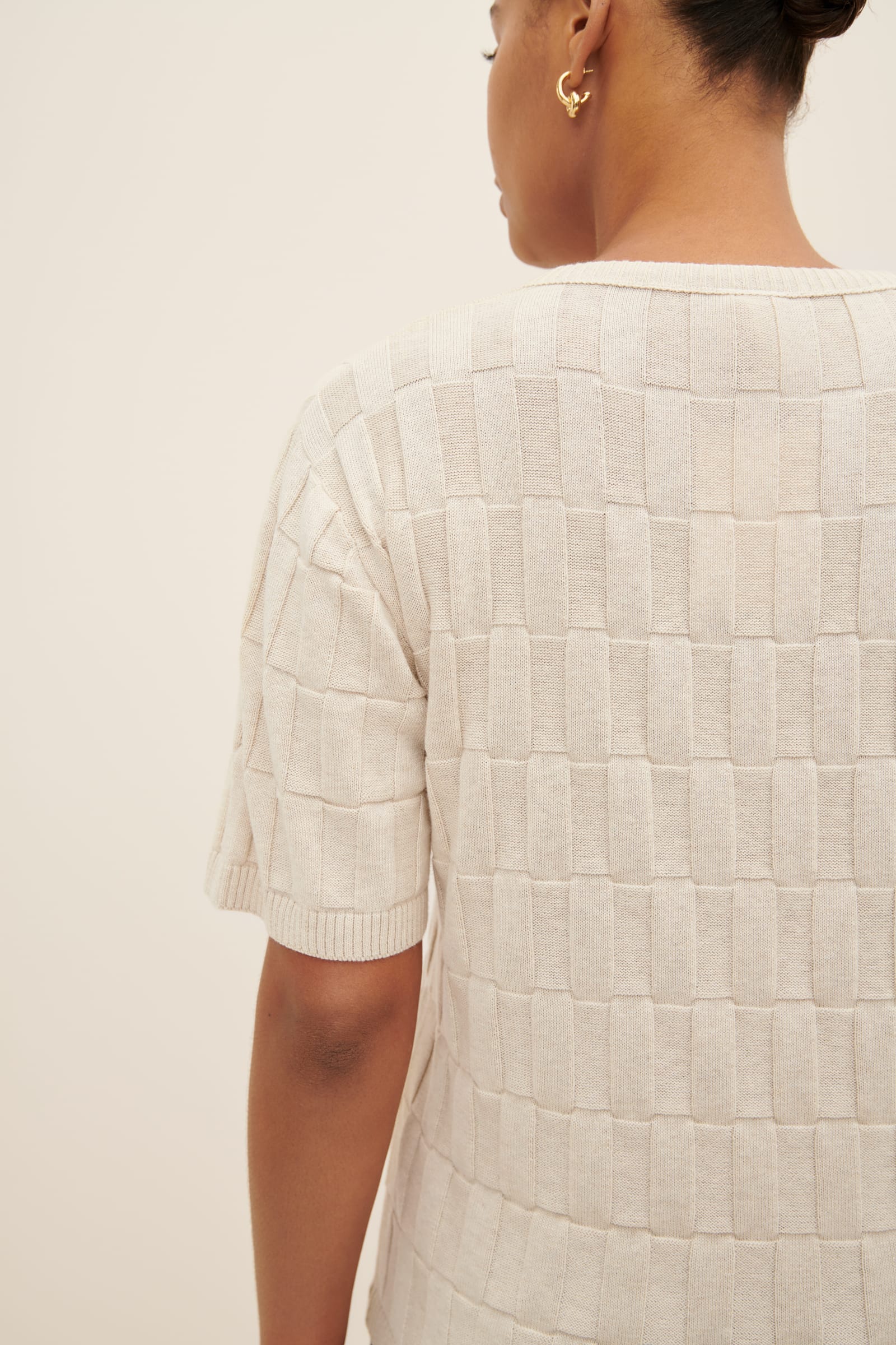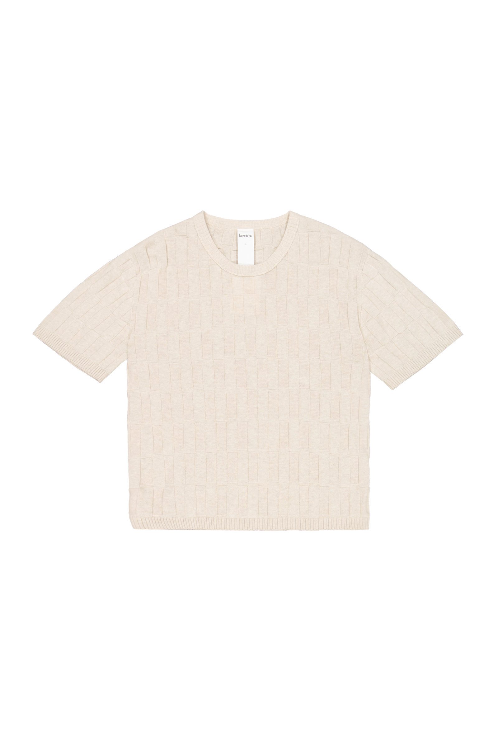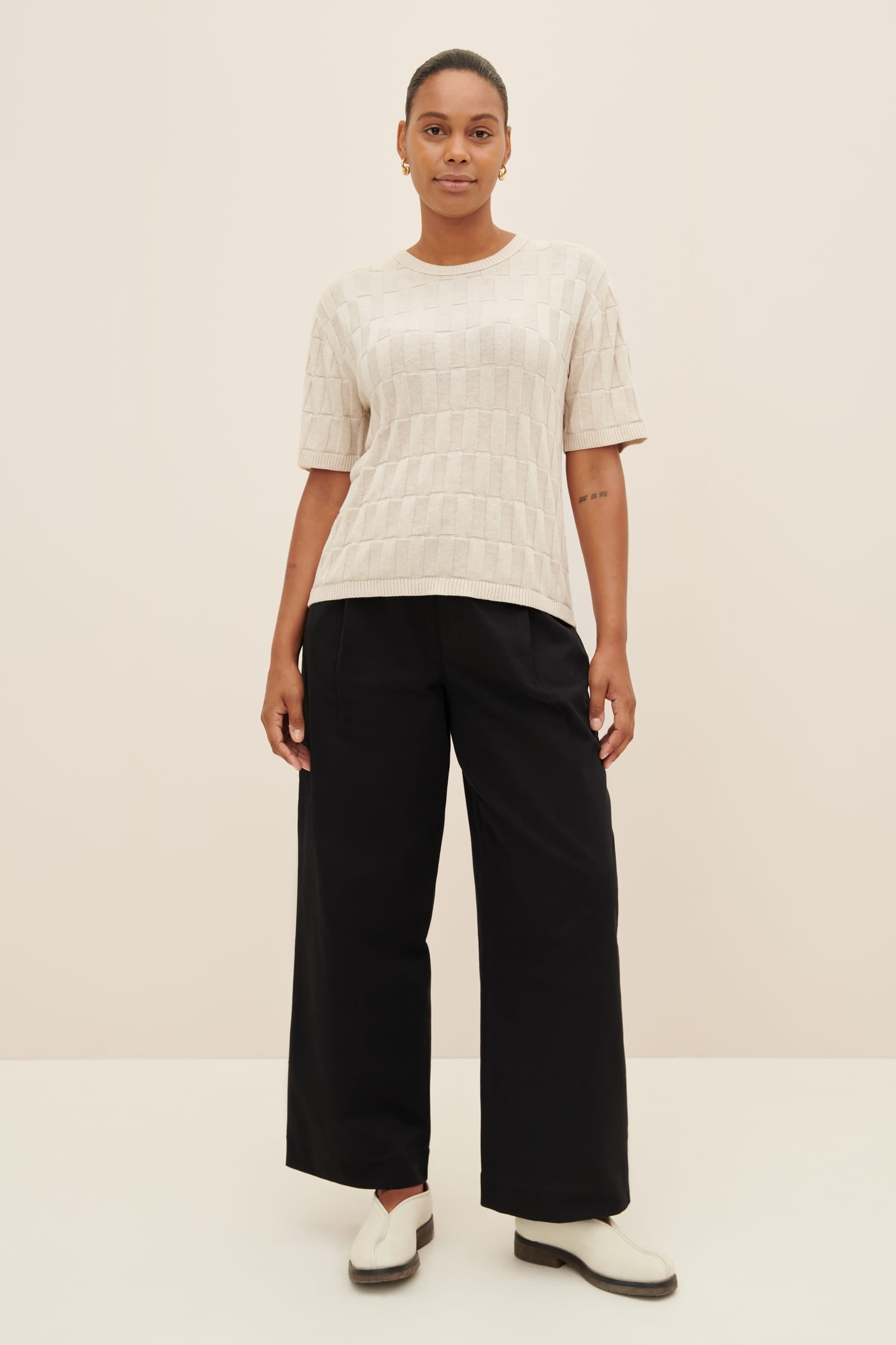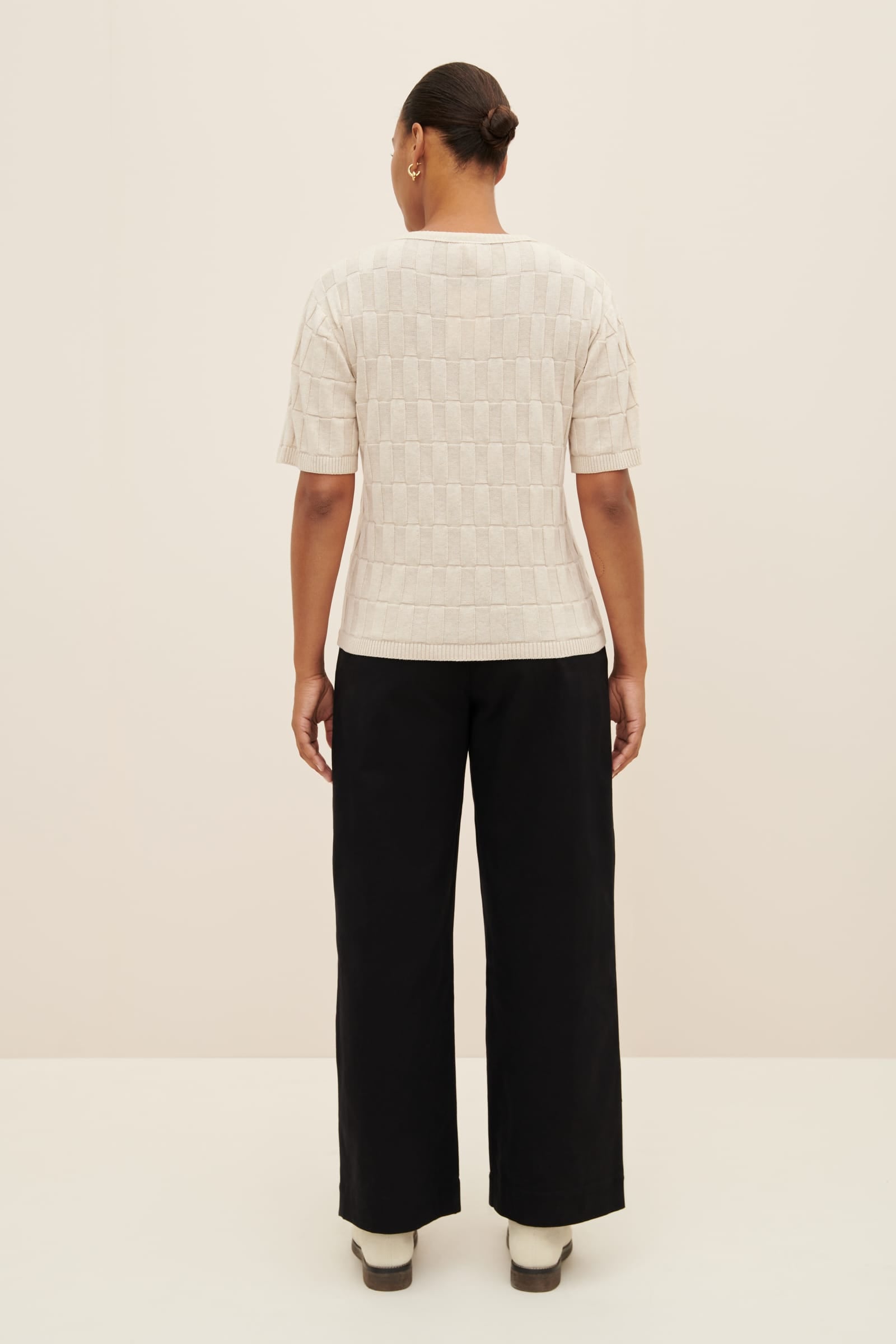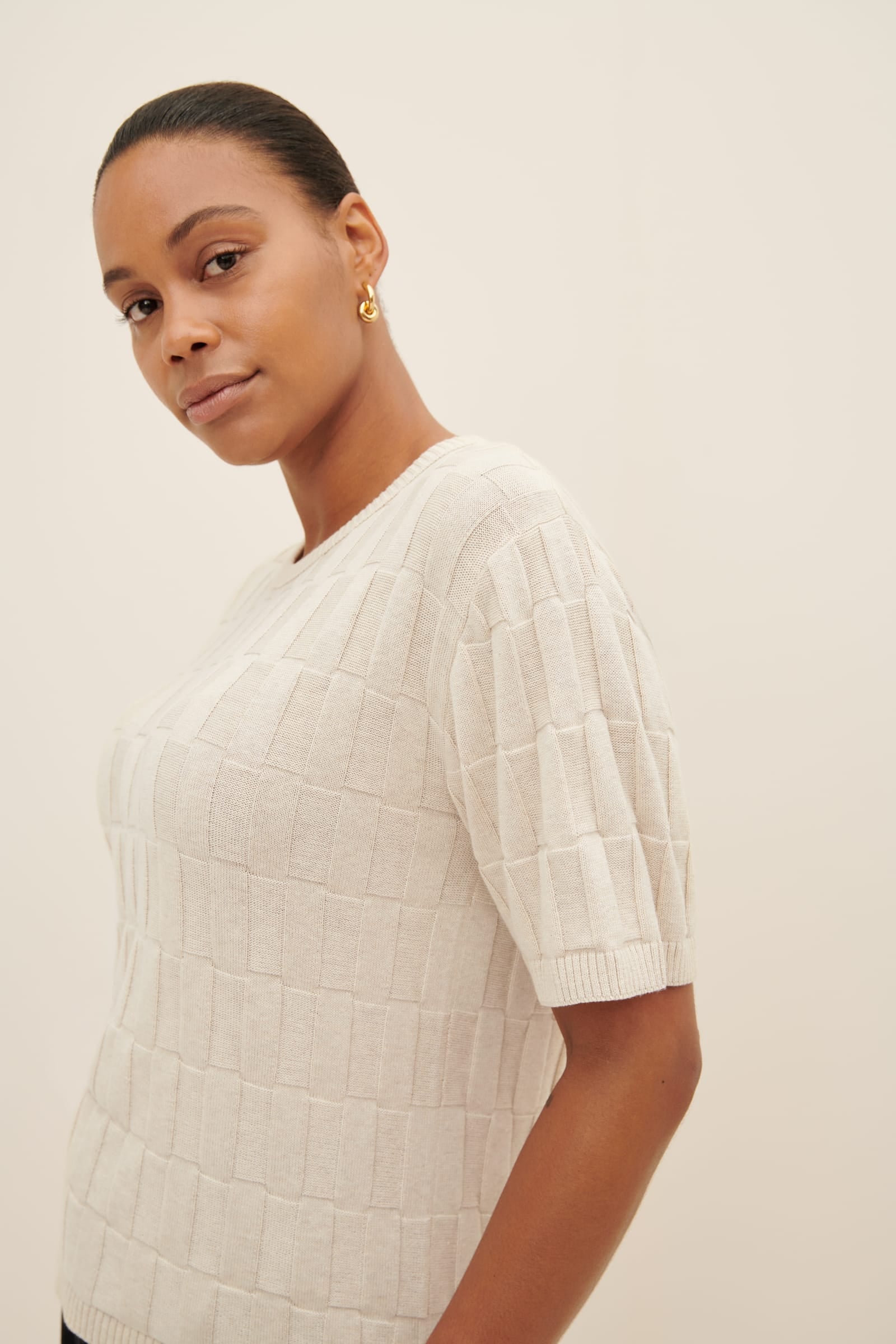 The Etch Tee is inspired by the stacked pattern of bricks and tiles, made from organic cotton knit in an interwoven stitch. It has a relaxed fit and contrast rib at the neck, cuff and hem. A simple way to add texture to a neutral wardrobe.