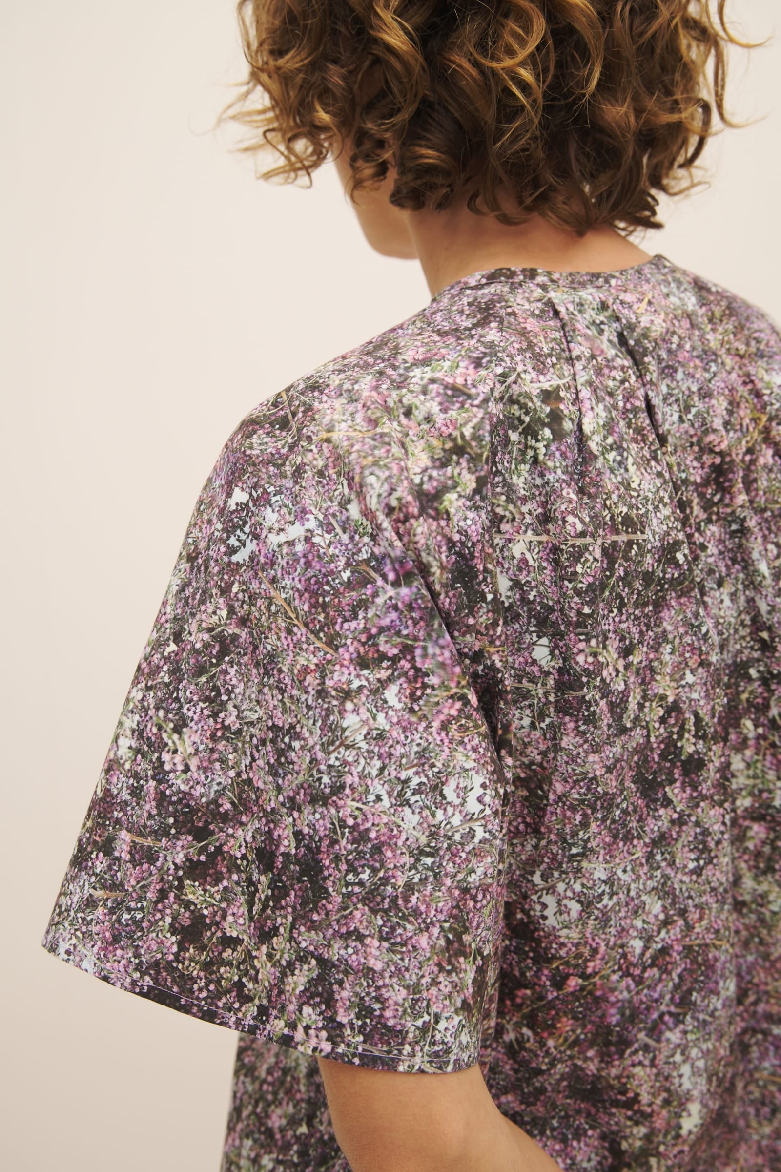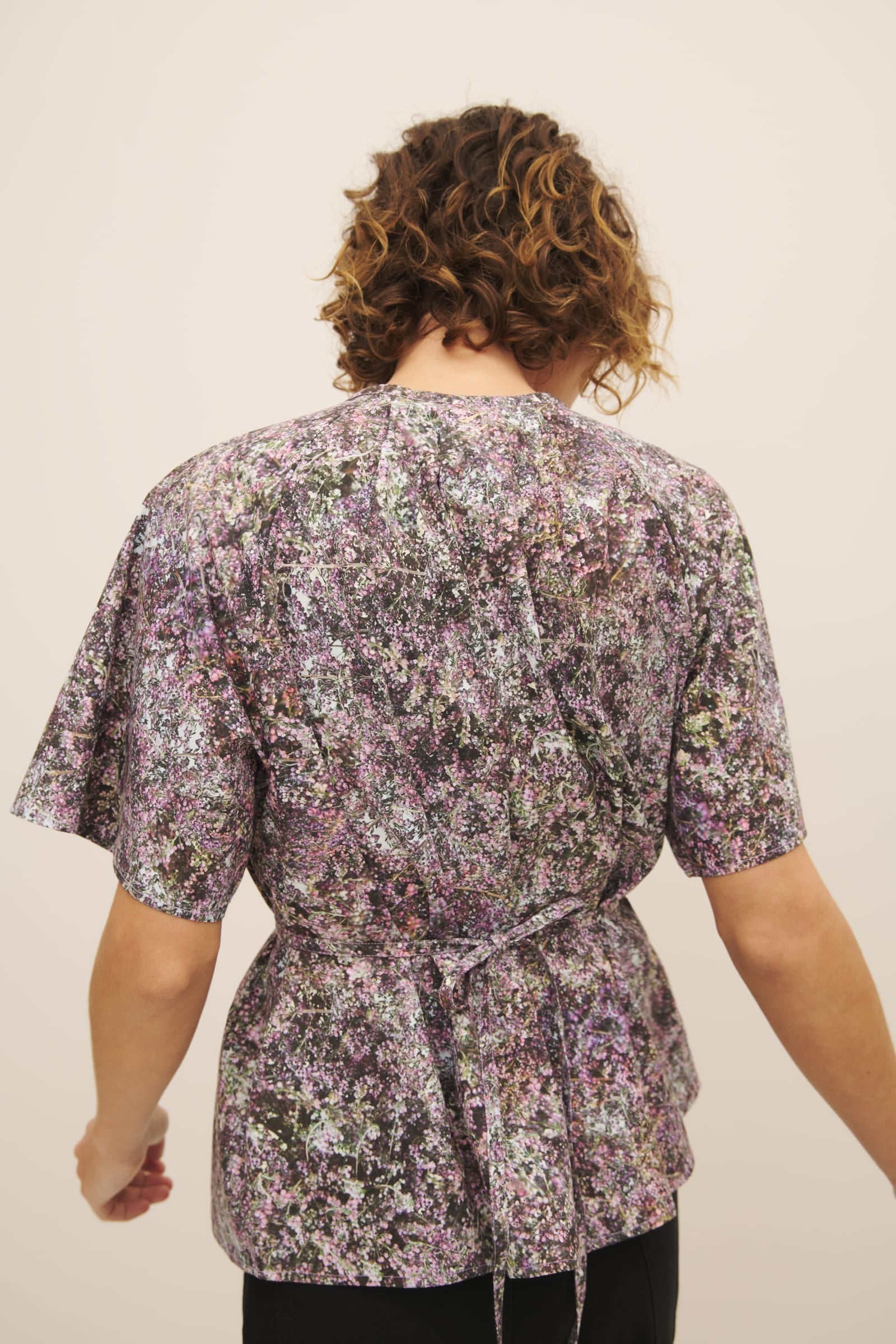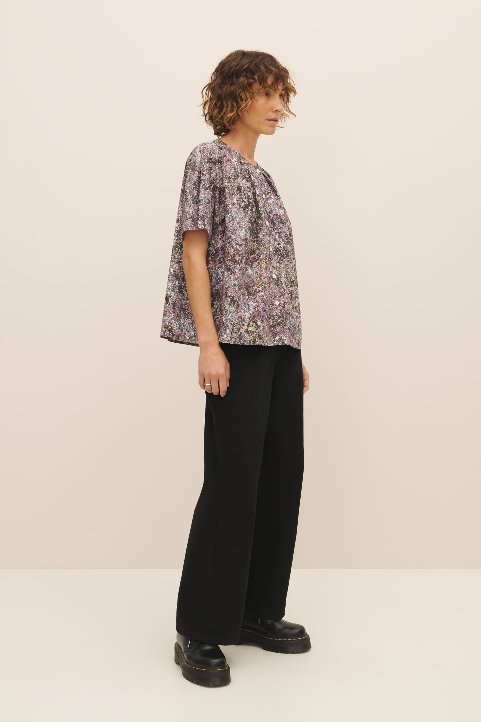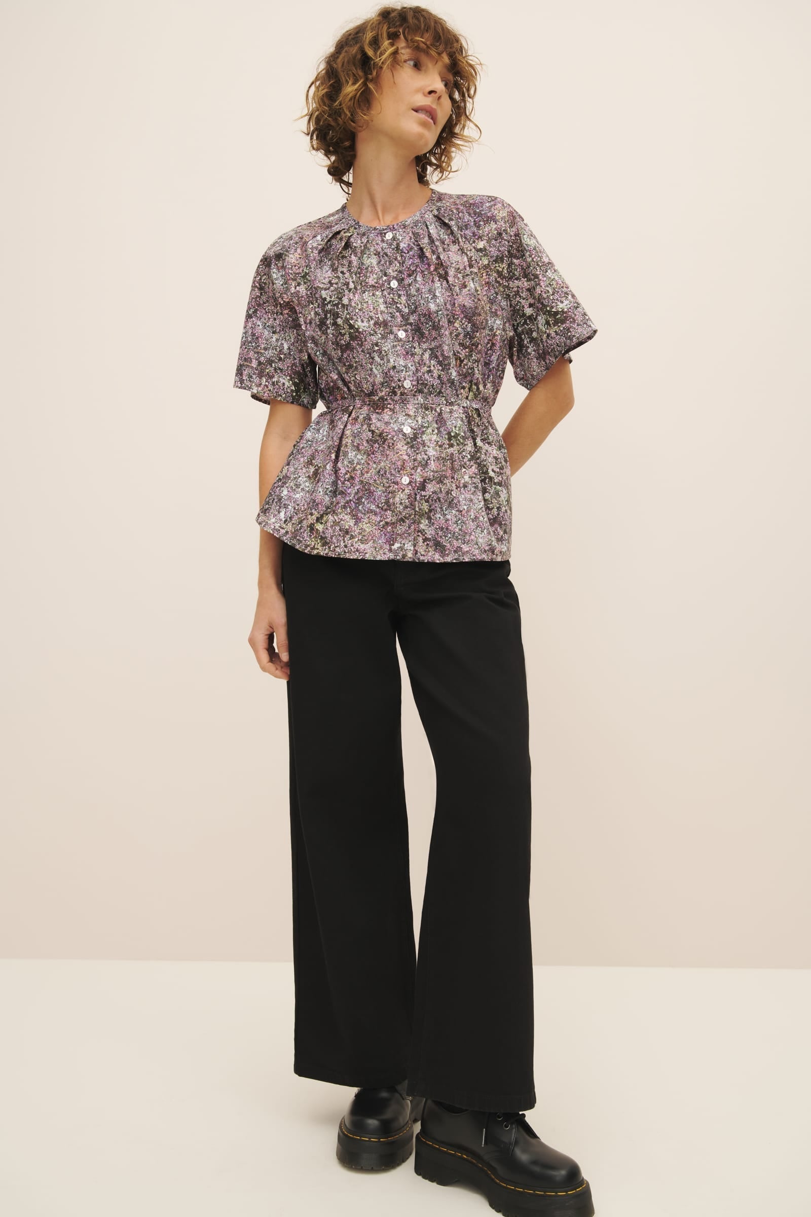 An elevated, easy-wear top, made from 100% certified Fairtrade organic cotton poplin shirting. The Etude Top has a relaxed fit and an elegant silhouette which showcases our bouquet print created using imagery of foliage from our surrounding spaces. It is detailed with subtle pleating around the neckline, and fastens through the front with agoya shell buttons. Can be worn relaxed or cinched in at the waist with the self-fabric tie.
