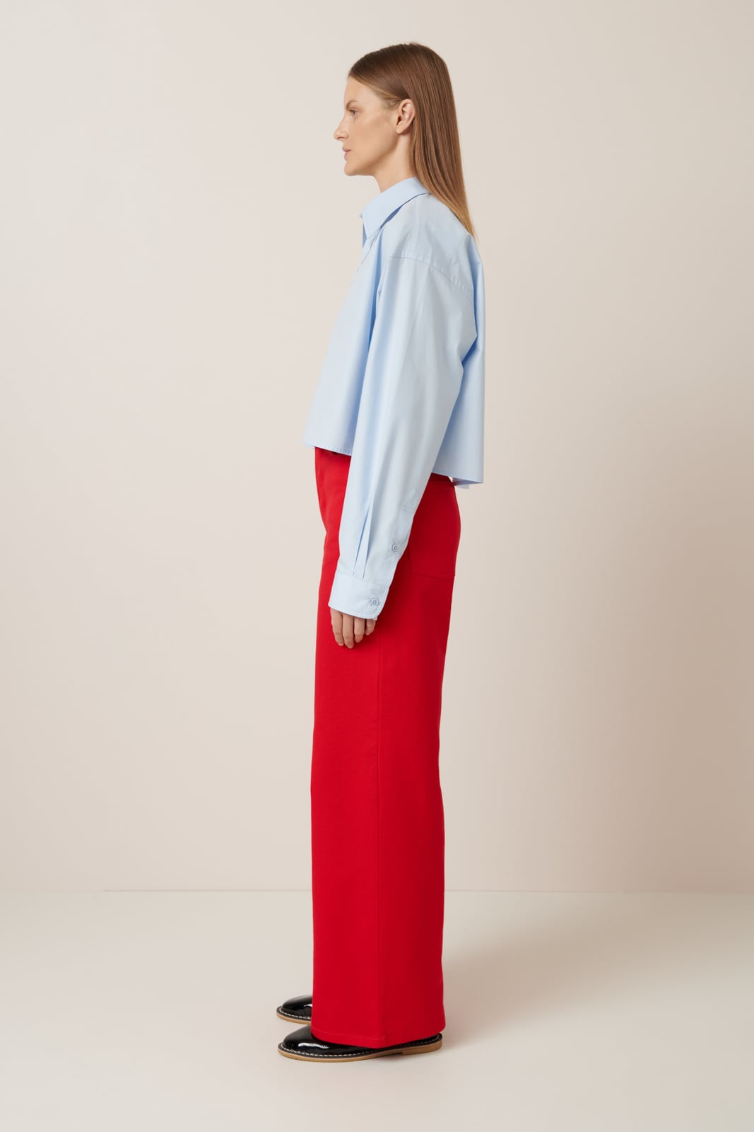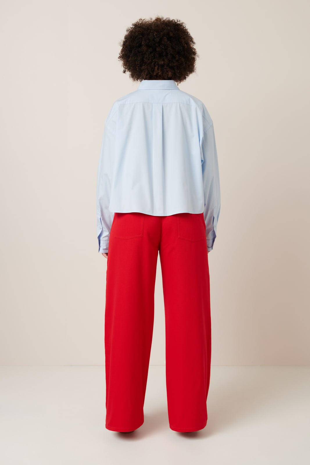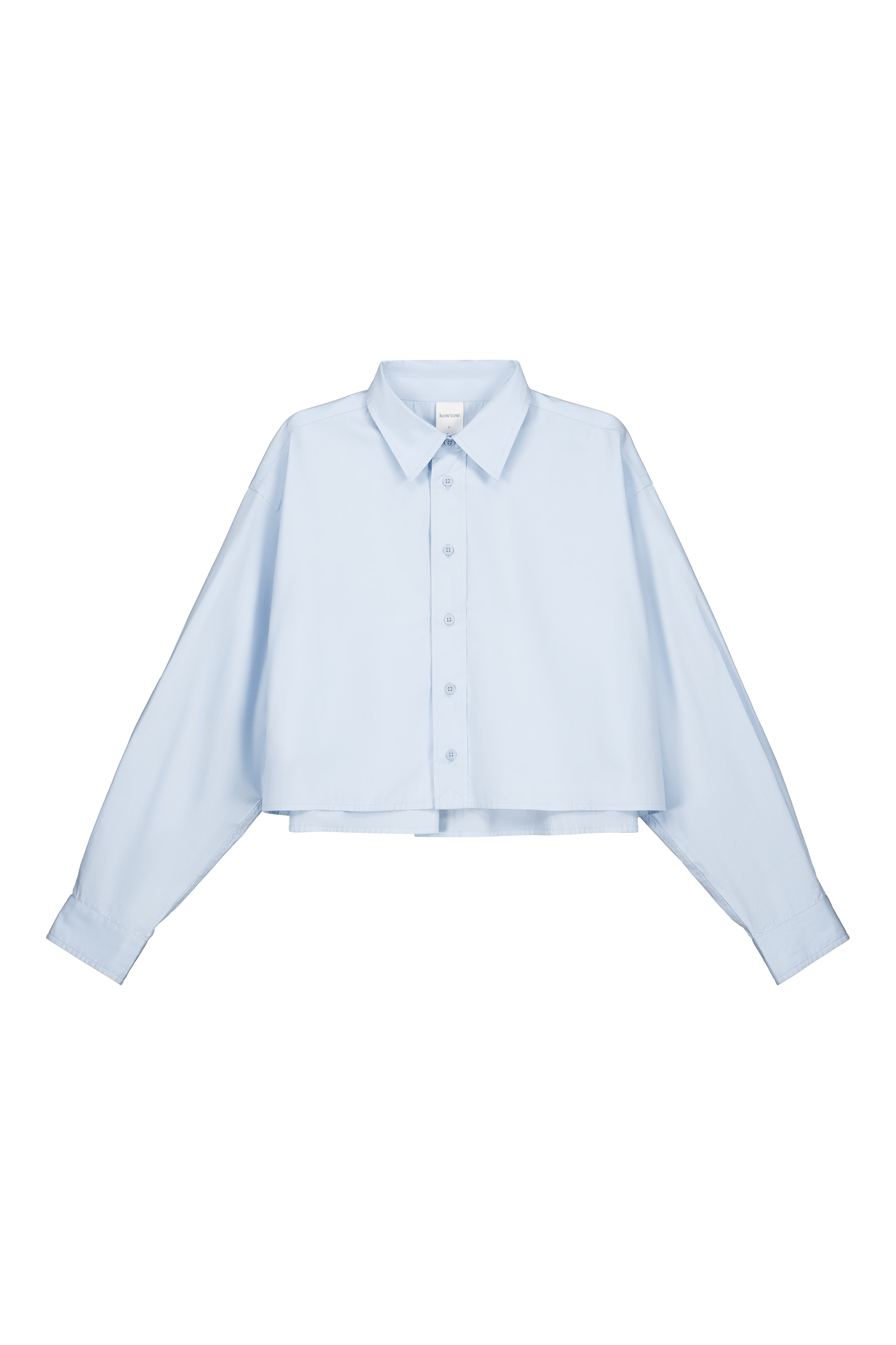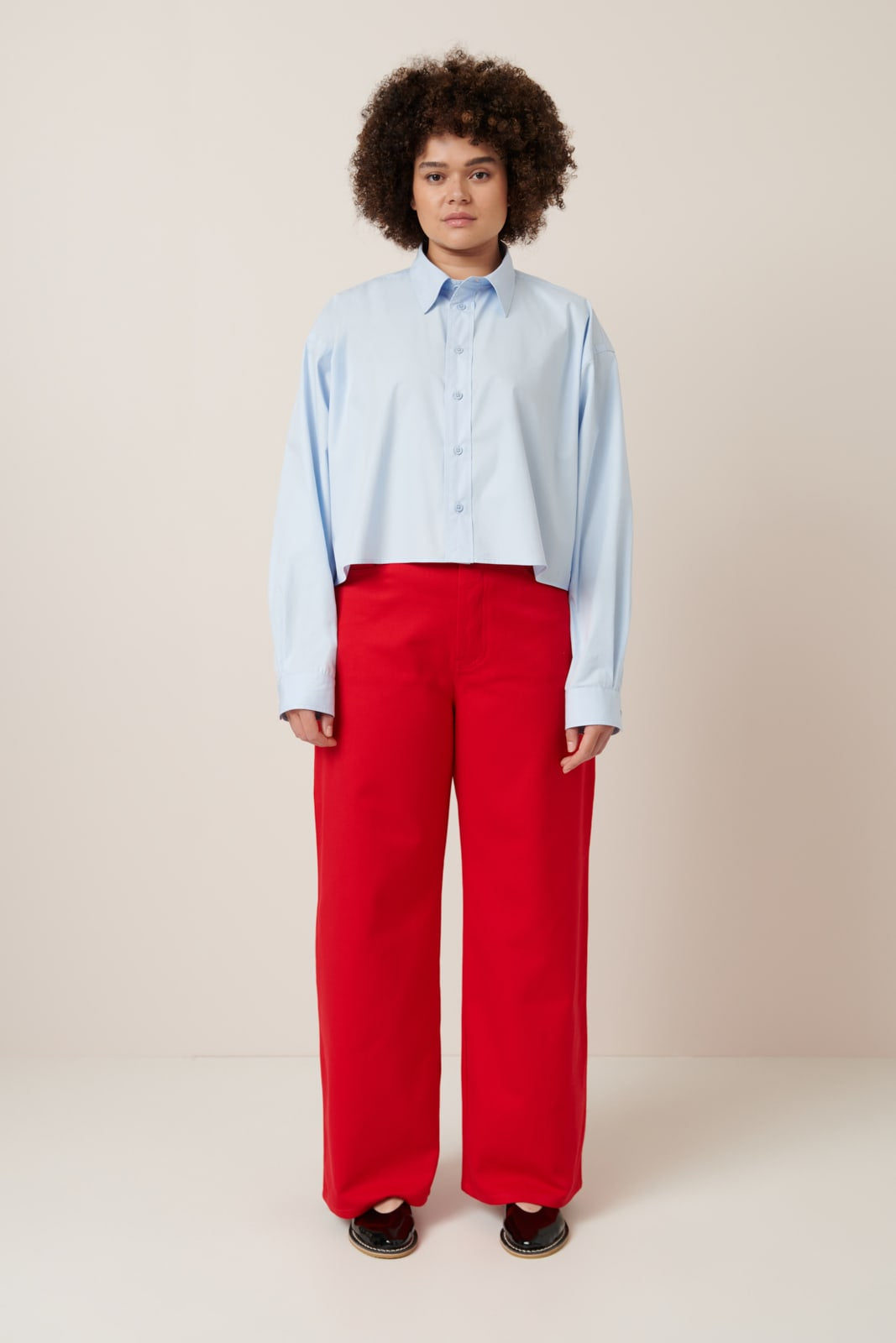 A modern twist on a classic silhouette, the Lauren Shirt is a boxy, cropped style with a relaxed fit. Featuring a classic shirt collar, pleated cuffs and finished with nut buttons. Style with tailored trousers for a polished look or with denim for a casual outfit. Made from organic cotton in a sky blue poplin.