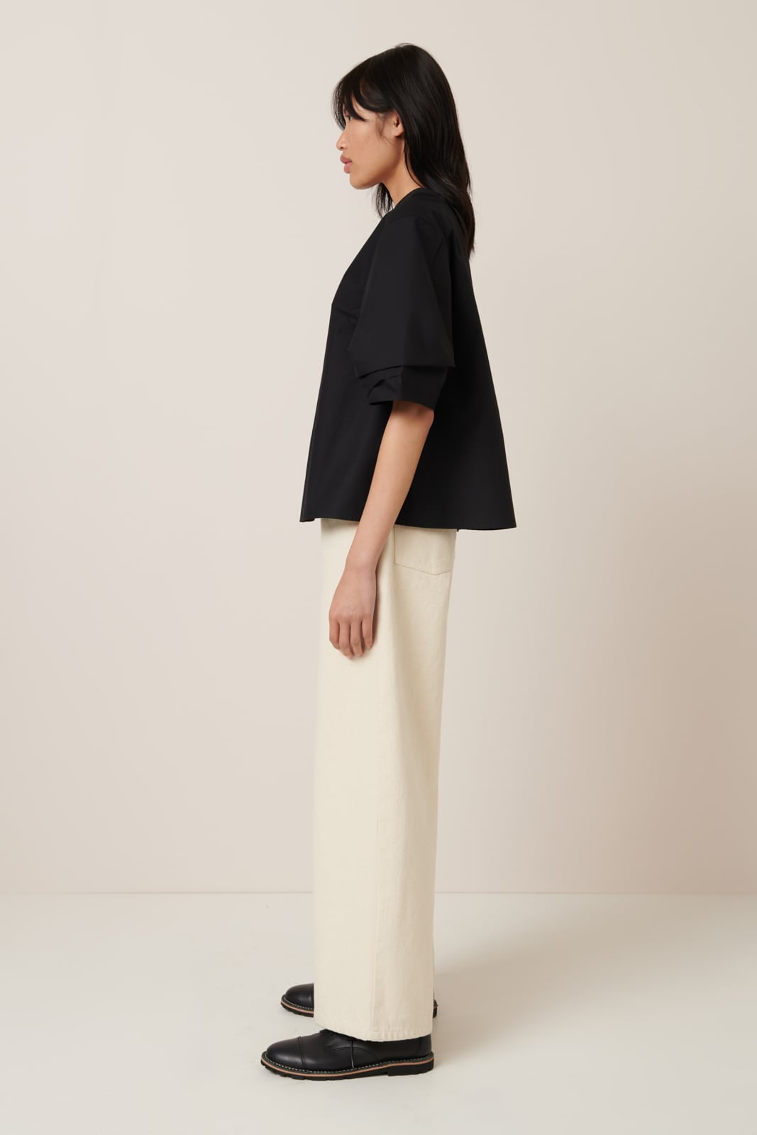 A simple yet statement piece, the Mila Top has a relaxed fit and features a sculptural sleeve, shaped with unique pleating underneath and on top of the sleeve. It has bust darts, falling to a comfortable a-line shape through the body. Made from organic cotton poplin, it is finished with a Mussel shell button closure at the back neck.