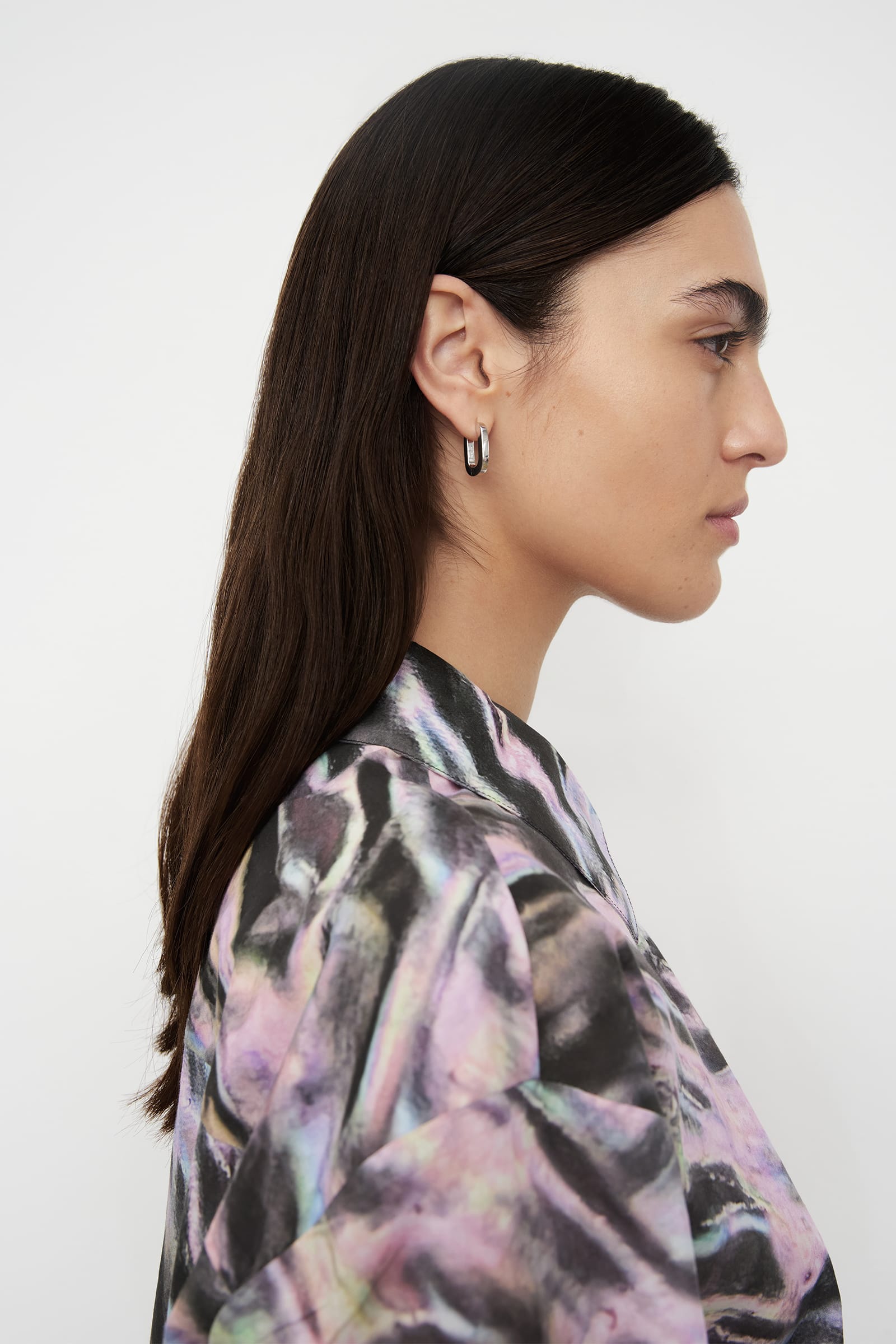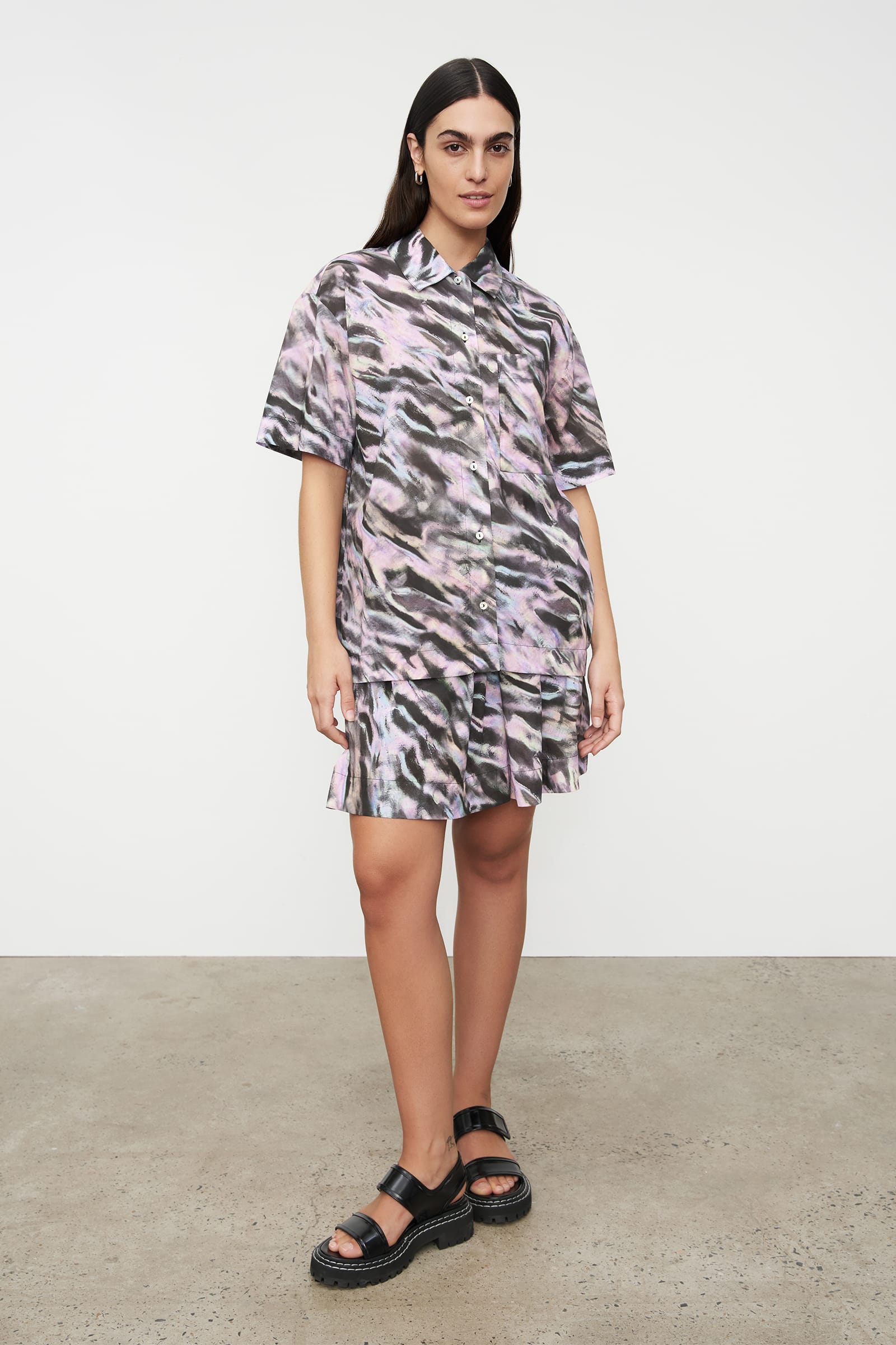 A statement short sleeve shirt, made from 100% certified Fairtrade digitally printed lightweight organic cotton voile. The Paper Shirt has a relaxed fit and is detailed with a front patch pocket and agoya shell button fastening. Features our Iridescent print, inspired by bioluminescence in our oceans and light shifting our perception of colour.
