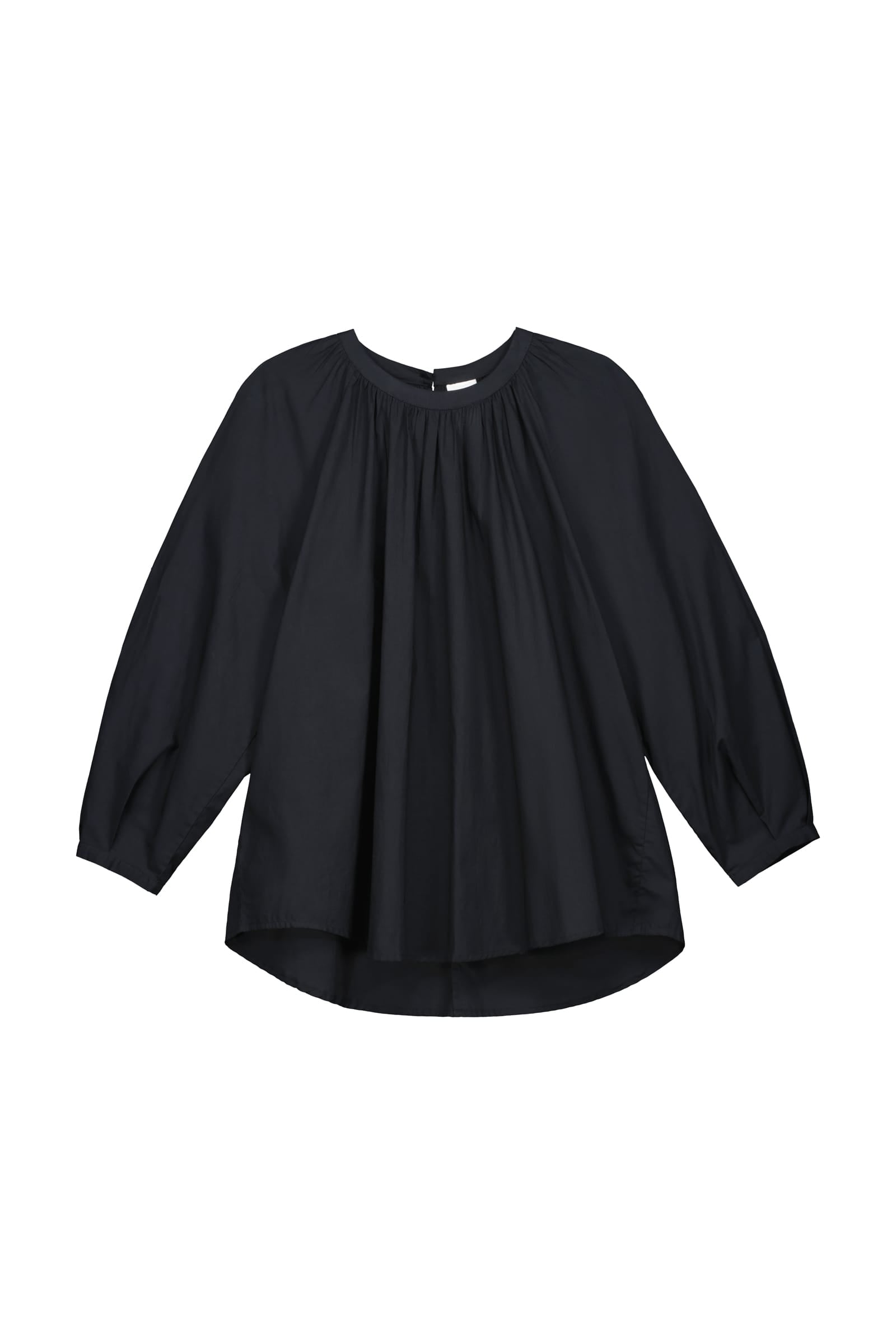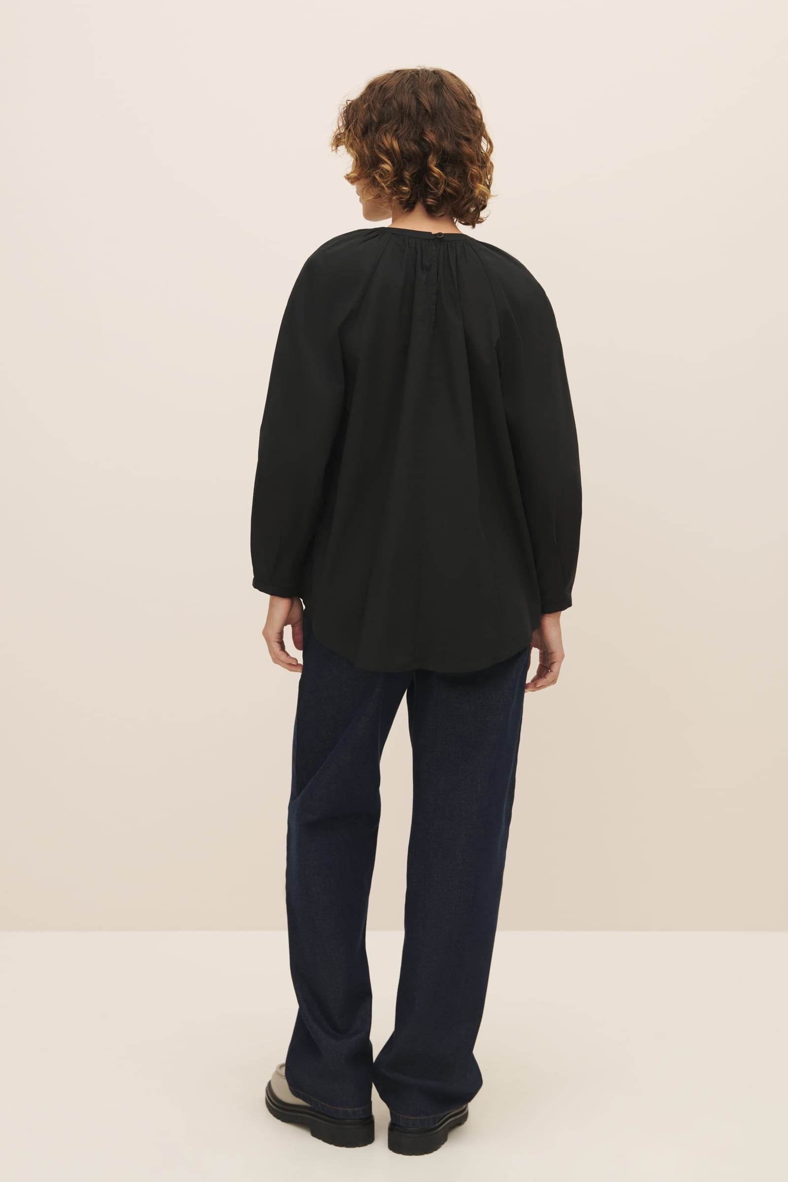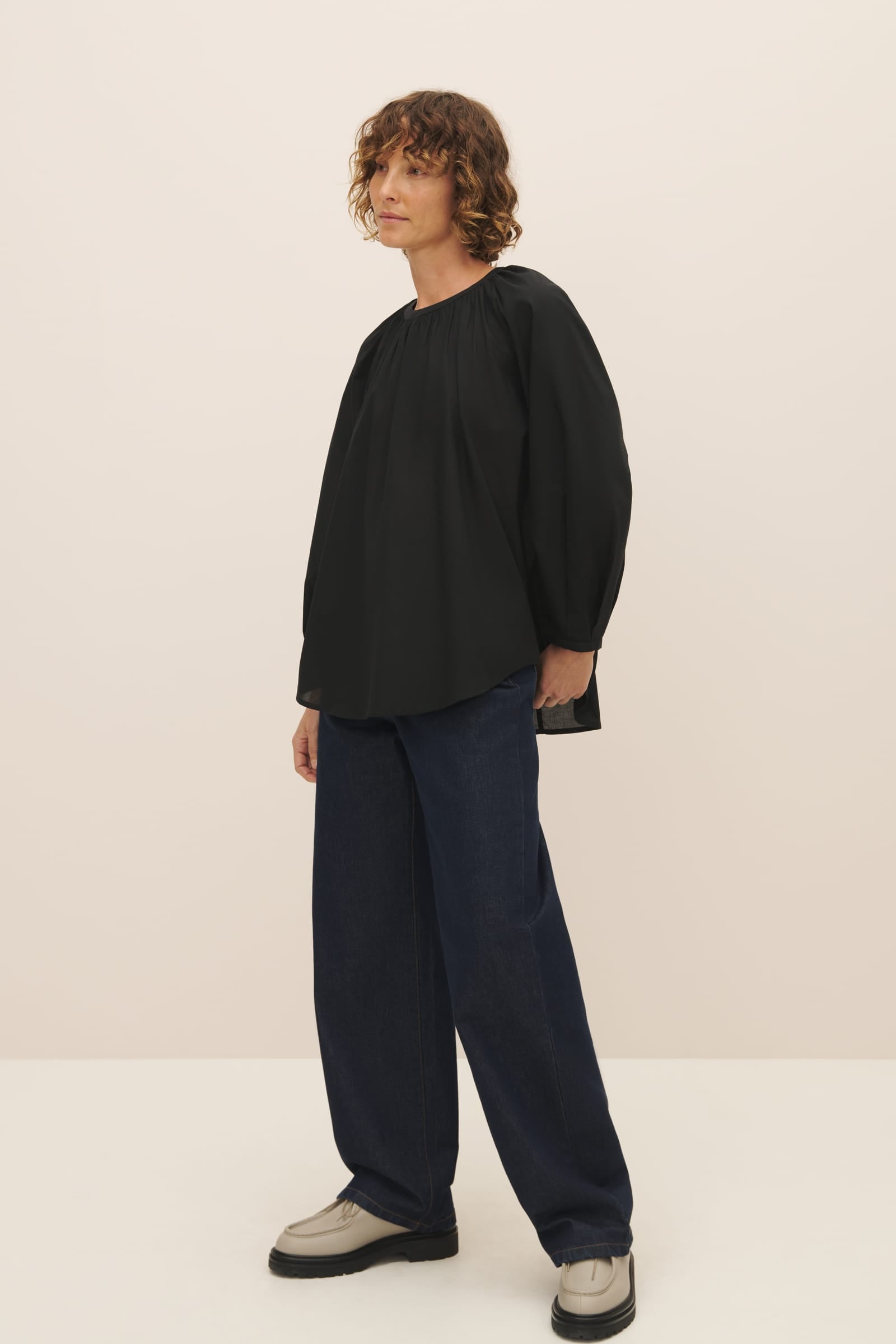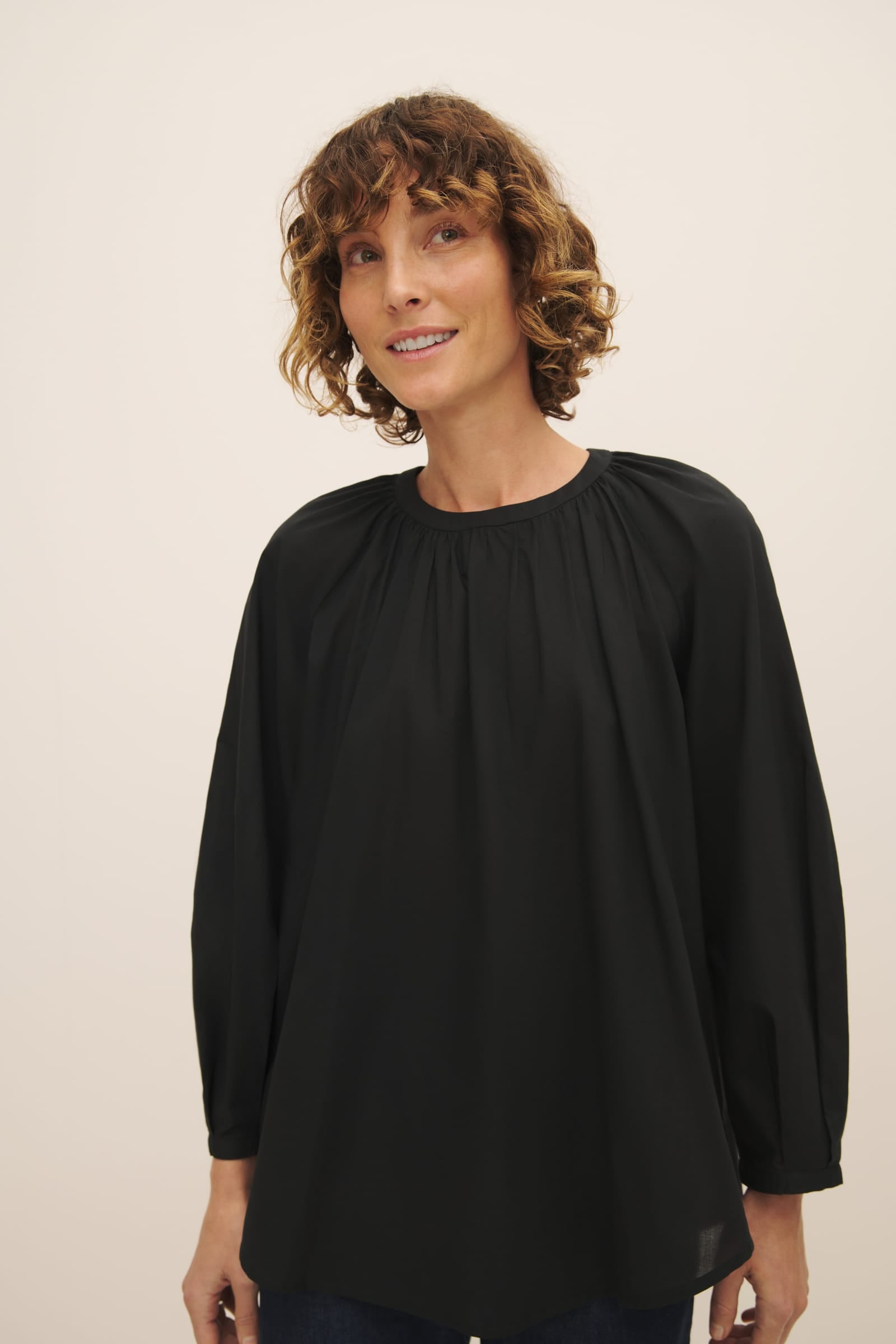Made from 100% certified Fairtrade lightweight organic cotton voile, the Zinnia Top balances elegance with ease. It features a gathered neckline and pleated sleeves for subtle volume, while a curved hem ensures ease of wear. It has an oversized fit with raglan sleeves, and fastens at the back with a nut button.