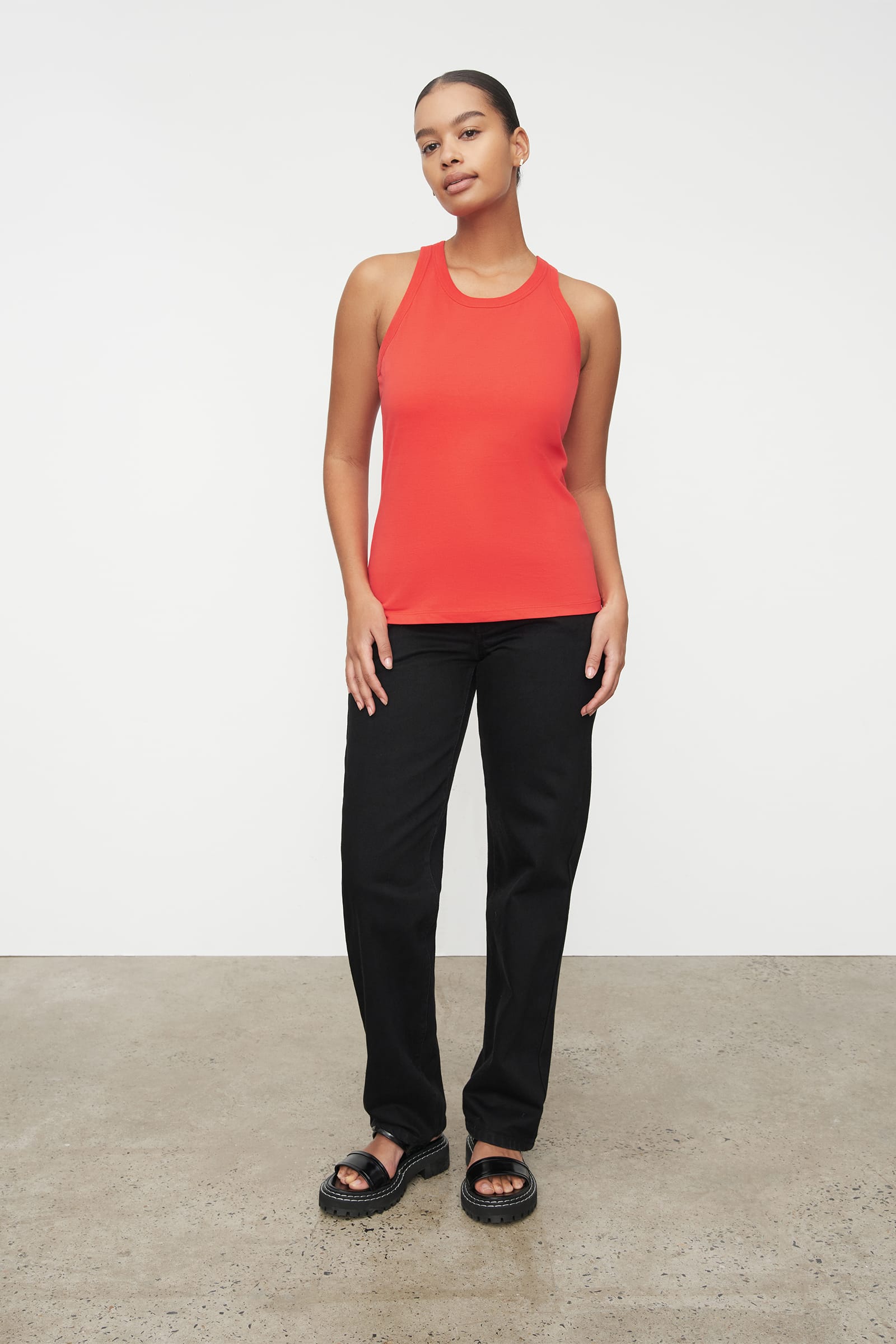 A fitted singlet with a racer back and ribbed binding around neck and armholes, made from 100% certified Fairtrade mid-weight organic cotton jersey.