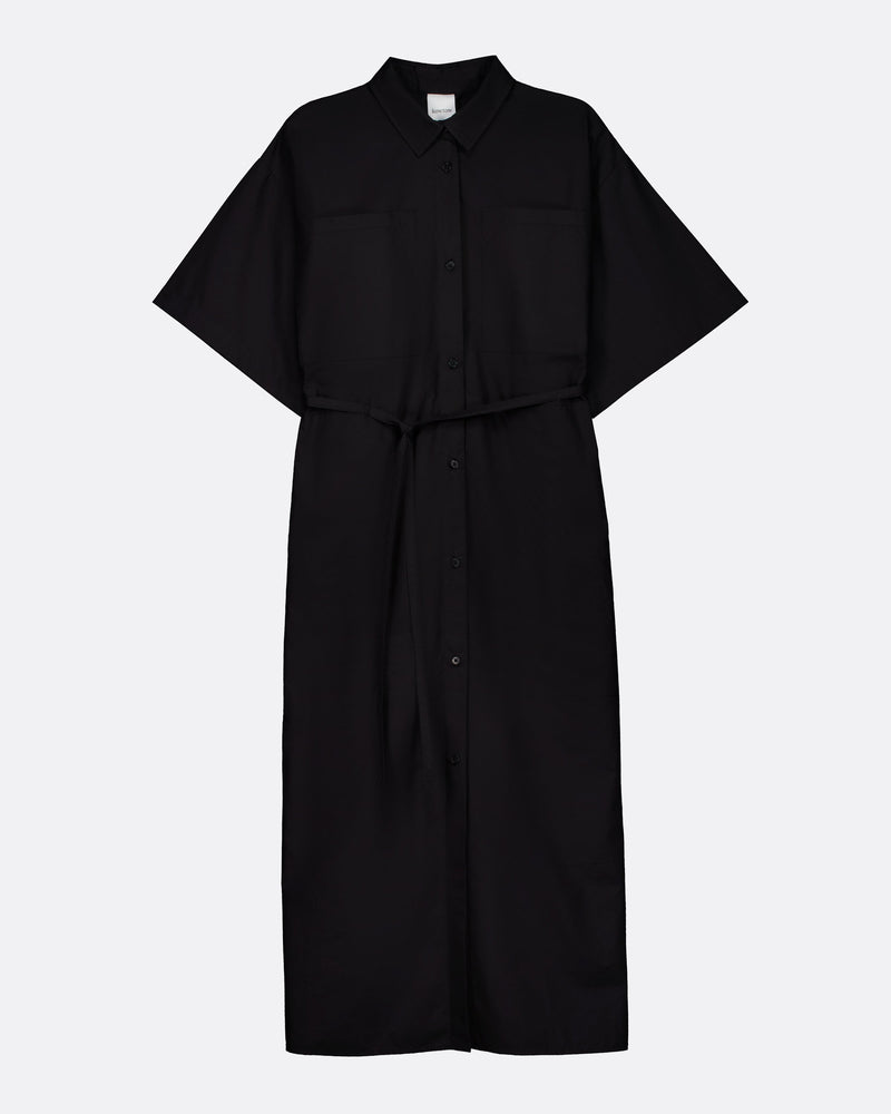 An oversized shirt dress designed for ease, finished with pockets throughout and a classic collar. It fastens with nut buttons down the front placket and can be worn shaped with the belt or loose for effortless styling.