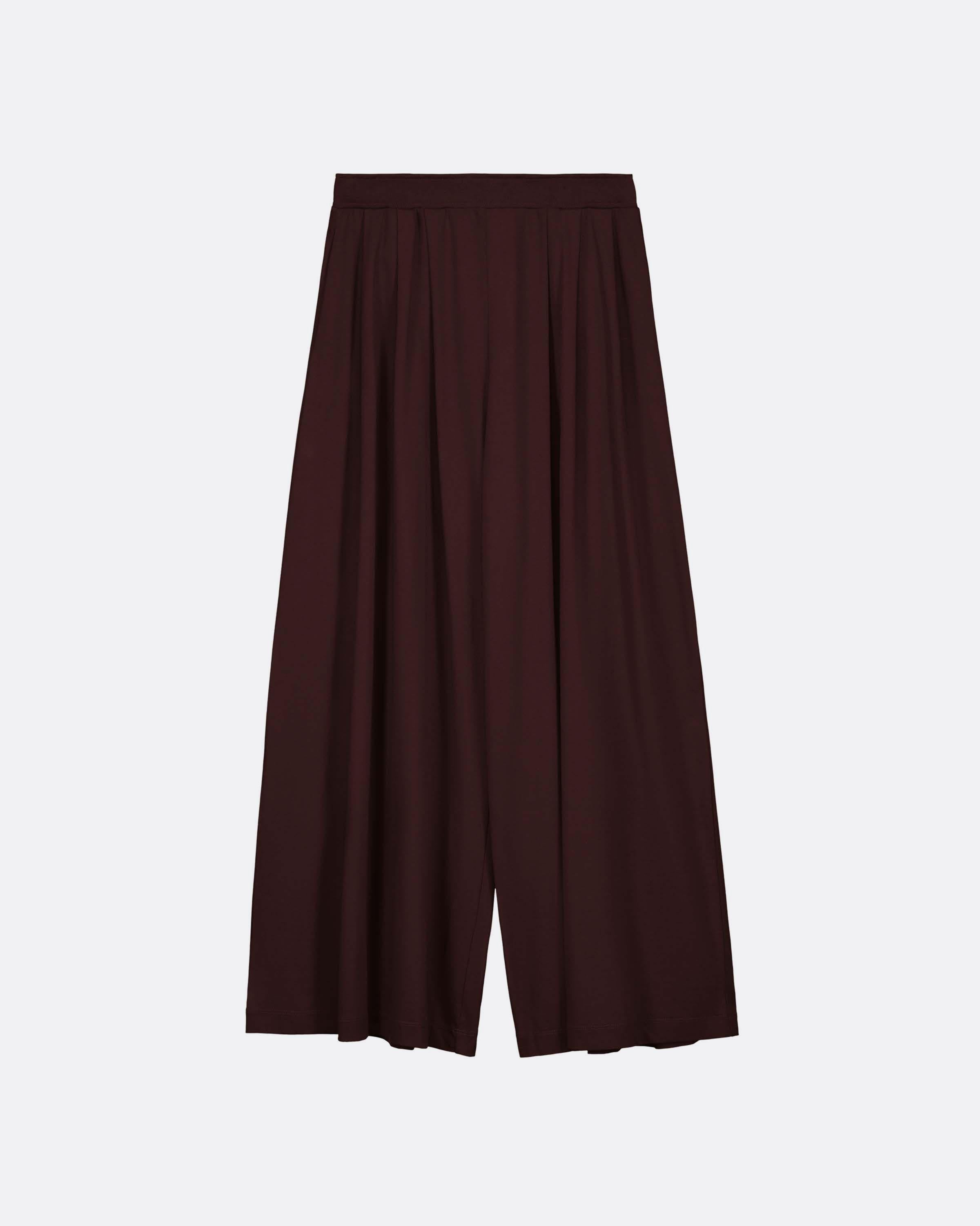 Our best-selling style, the Drape Pant, is a full-length, wide-leg pant featuring elegant front pleats. It is finished with a wide, ribbed elastic waistband and convenient side seam pockets. Made from midweight organic cotton in a deep Mahogany, the Drape Pant offers both comfort and sophistication.