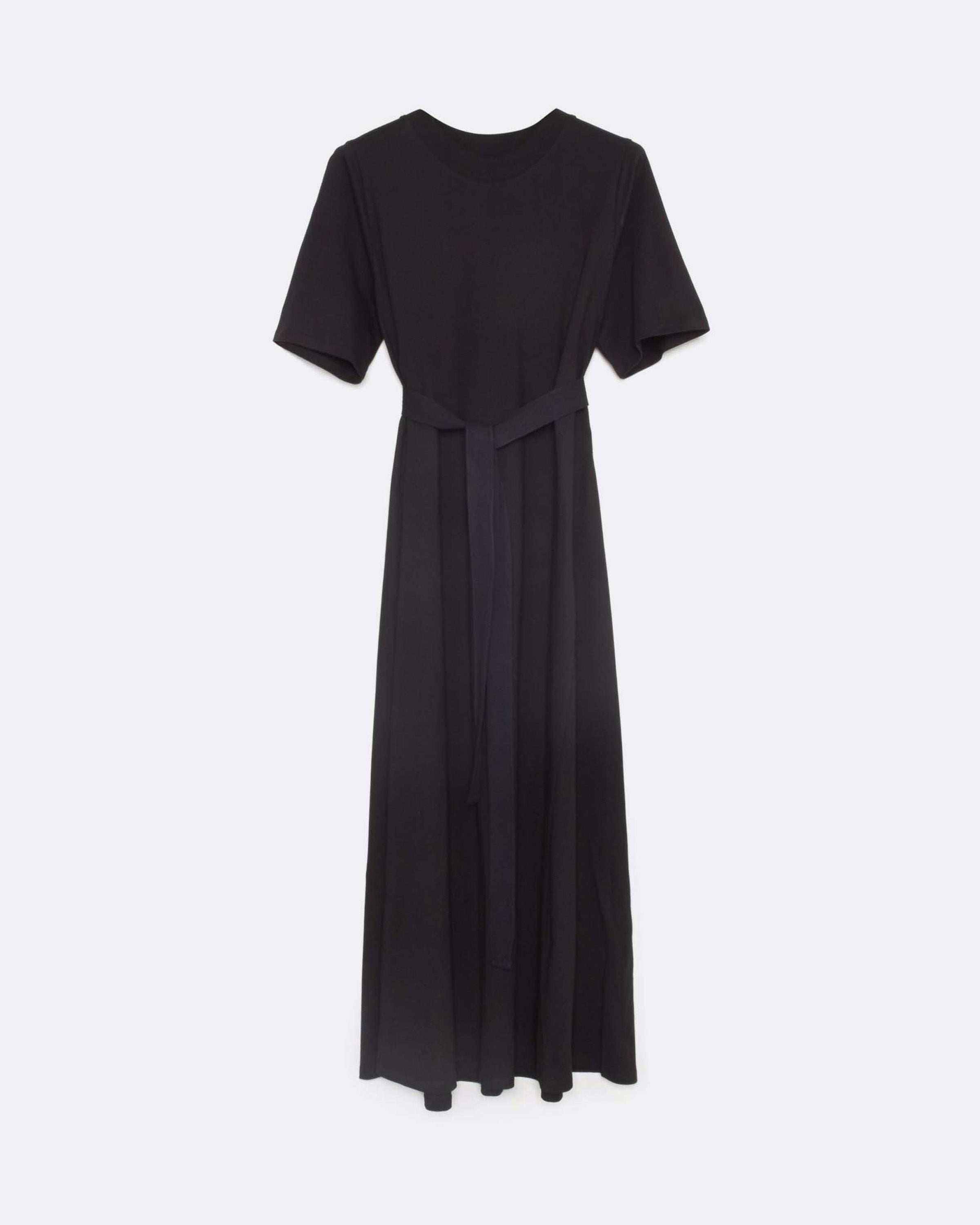 A perfect everyday staple with a full-length, A-line silhouette finished with a wide ribbed neckline. It features our signature twisted side seams and a removable woven belt for added versatility.