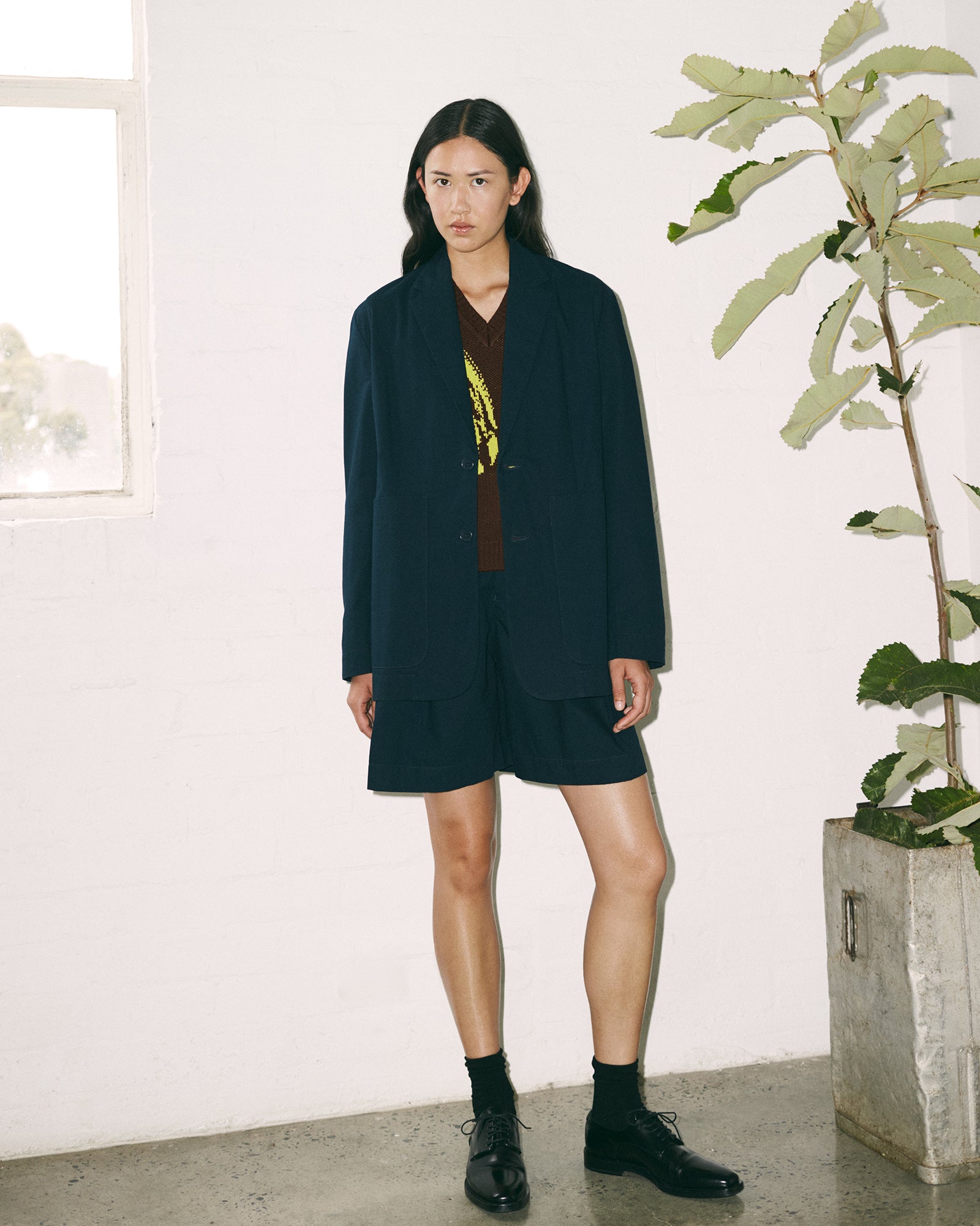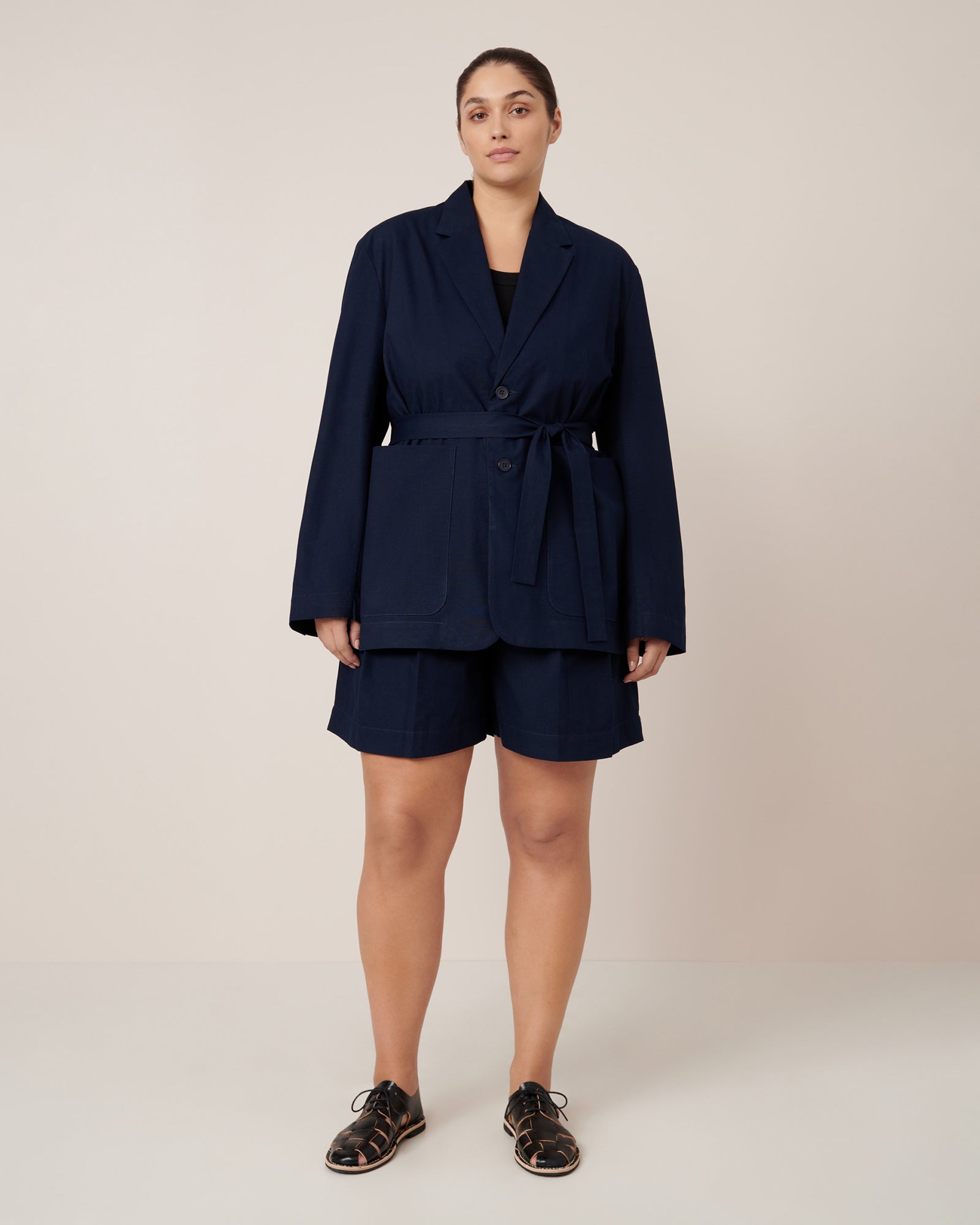 The Carter Blazer reimagines the classic men's suit jacket with a relaxed fit and carefully considered tailoring. Crafted from light-weight organic cotton canvas, it features an exaggerated back vent and statement oversized pockets. A separate belt allows for versatile styling, while the half lined interior and nut button cuffs add a refined finish. Pairs perfectly with the Carter Shorts.