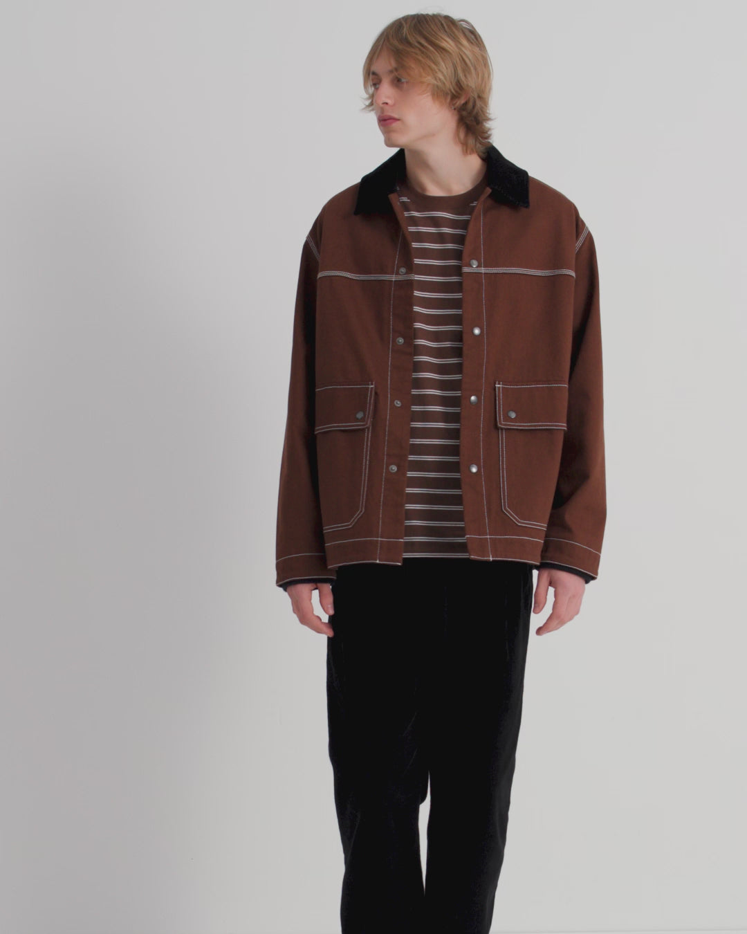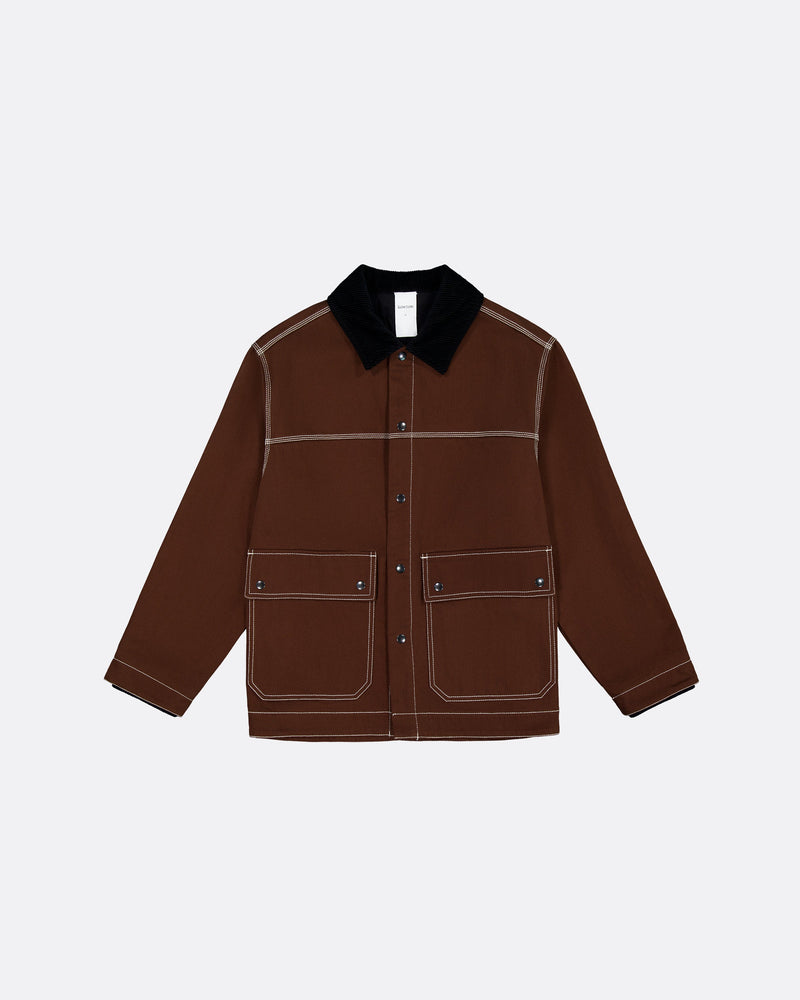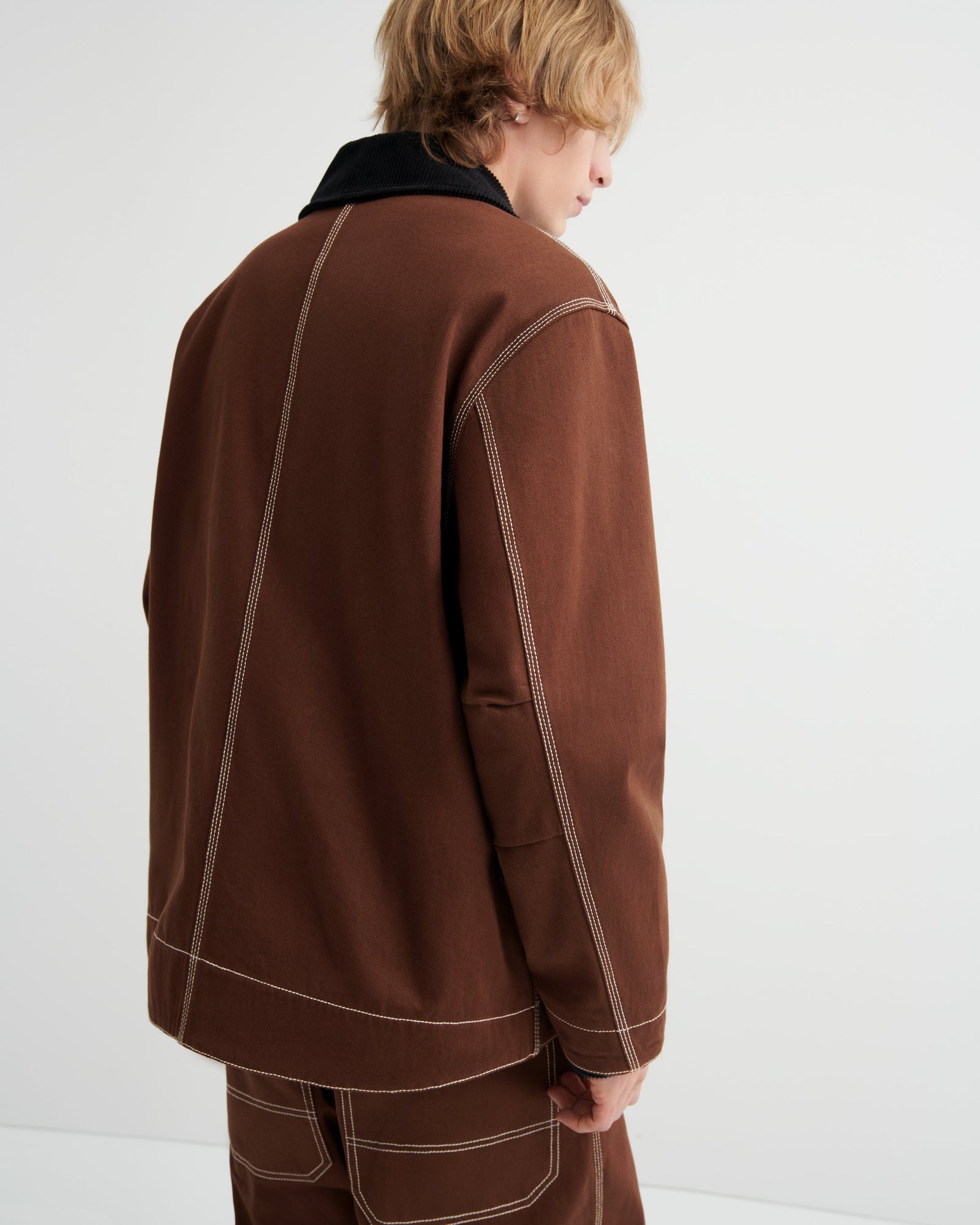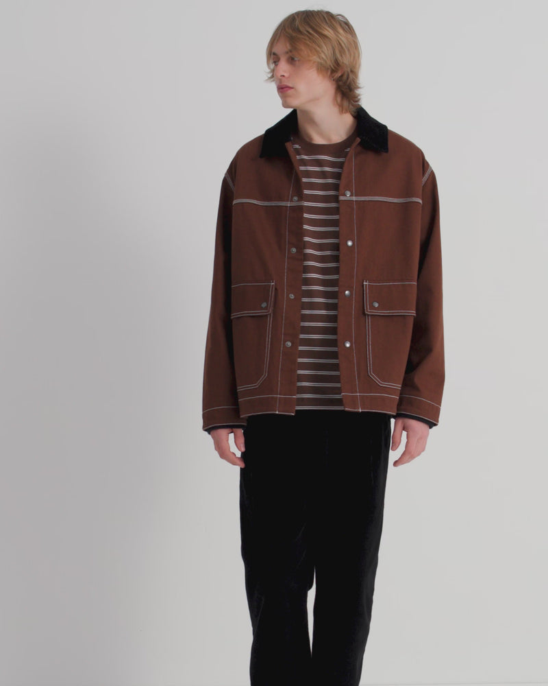 A workwear-inspired silhouette designed for both comfort and practicality. It features an organic cotton corduroy collar, triple topstitching, and oversized front patch pockets with snap closures. A dipped hem and soft knitted cuffs add structure and warmth, while a full lining in black organic cotton poplin ensures a clean finish inside. Fastened with snaps at the front and finished with an internal patch pocket for added utility.