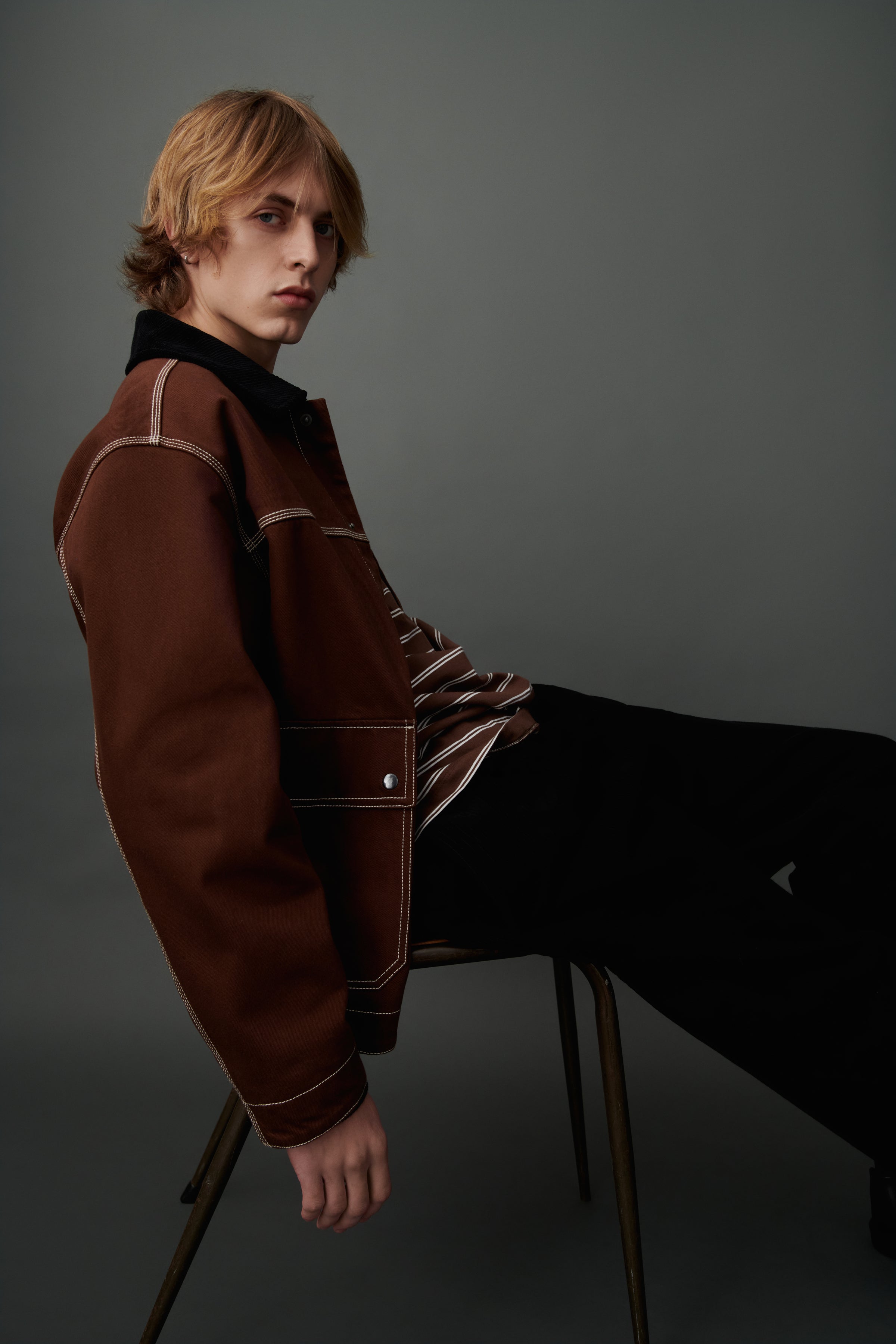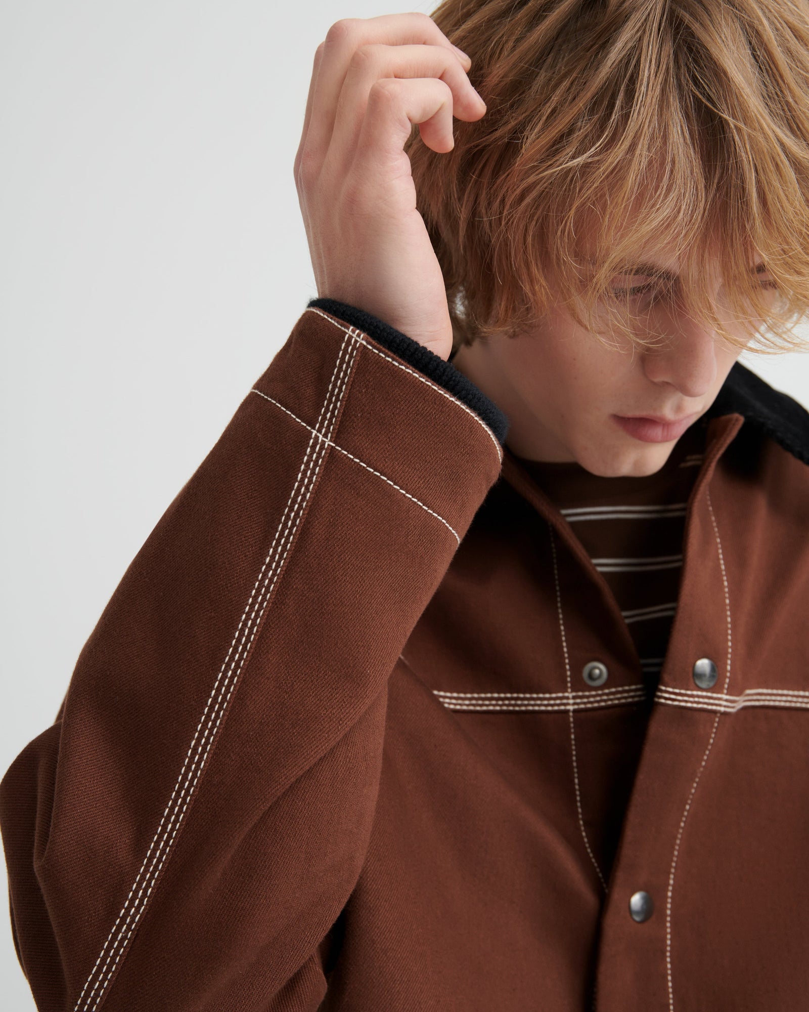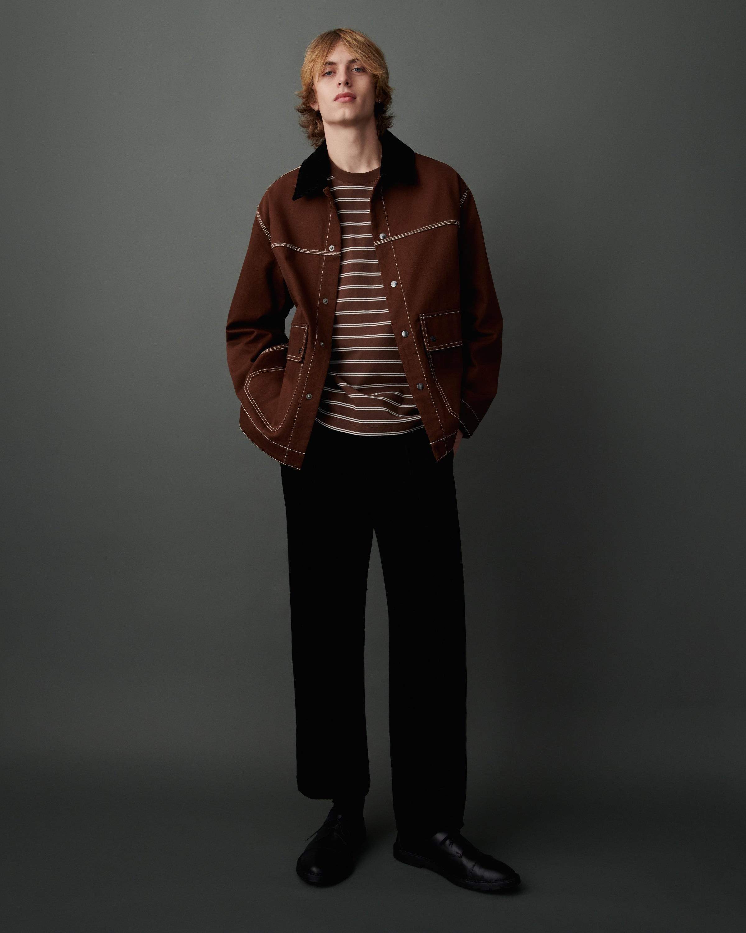 A workwear-inspired silhouette designed for both comfort and practicality. It features an organic cotton corduroy collar, triple topstitching, and oversized front patch pockets with snap closures. A dipped hem and soft knitted cuffs add structure and warmth, while a full lining in black organic cotton poplin ensures a clean finish inside. Fastened with snaps at the front and finished with an internal patch pocket for added utility.